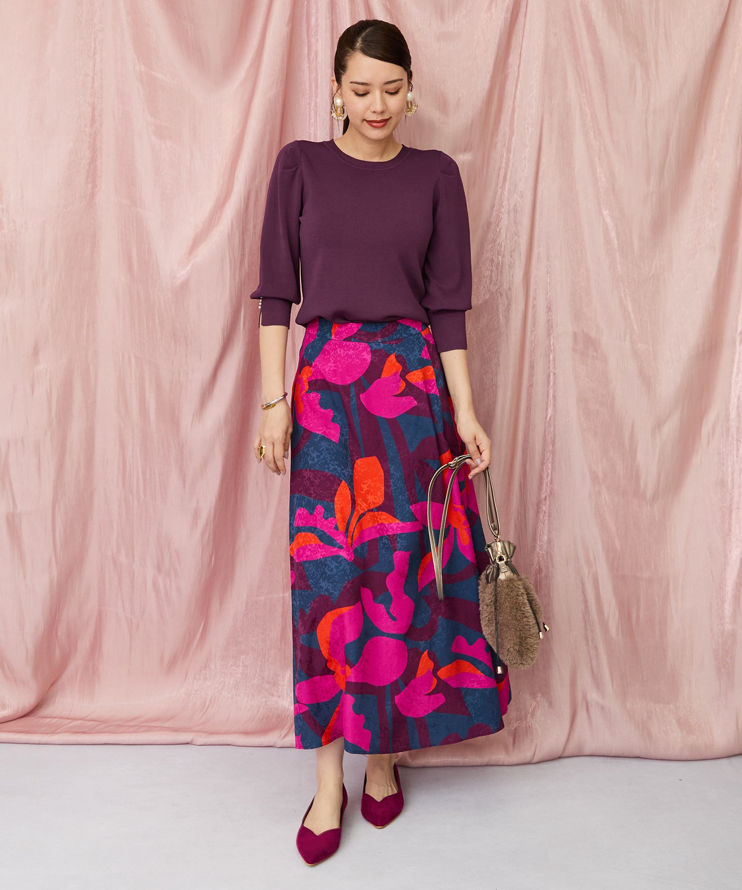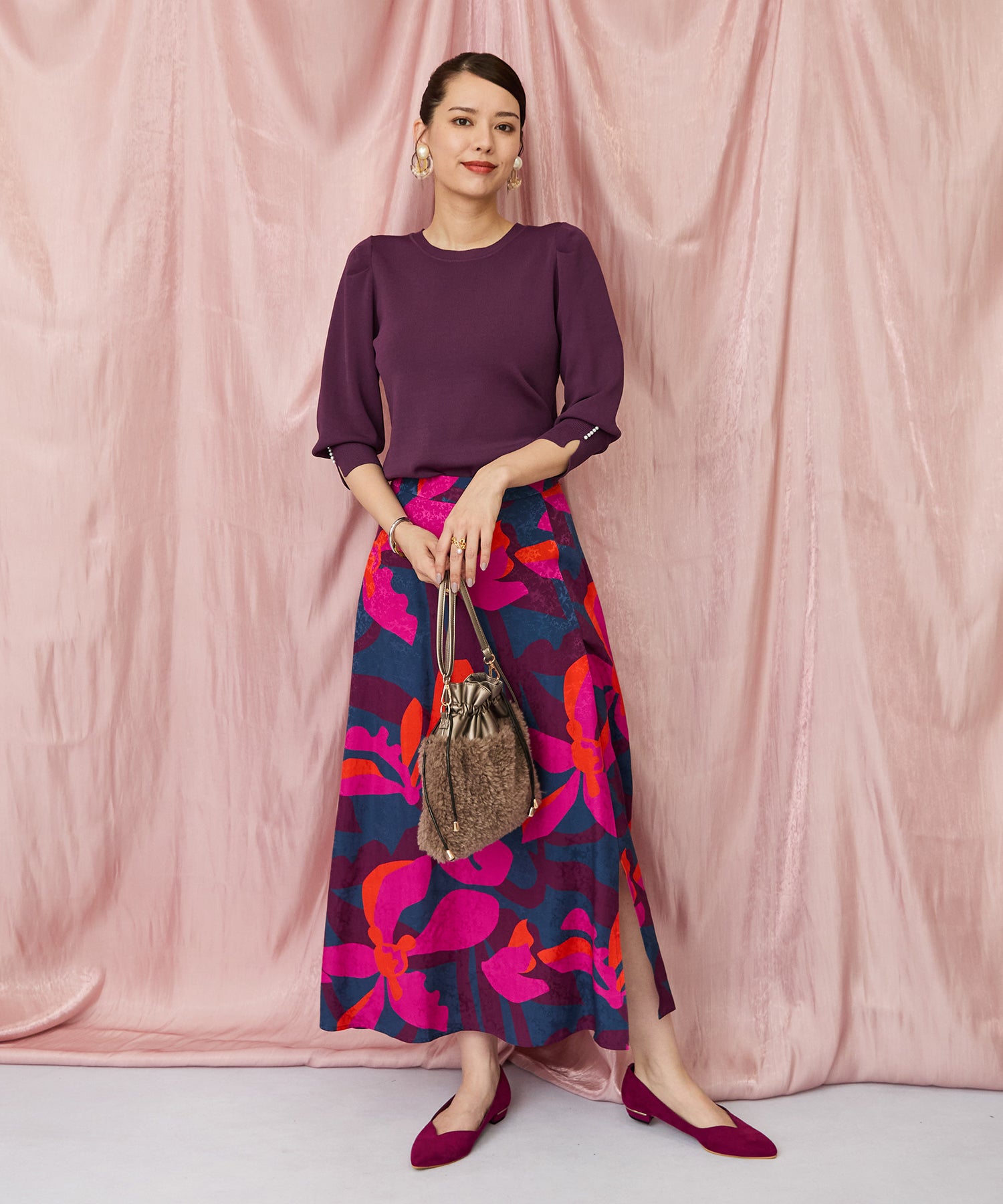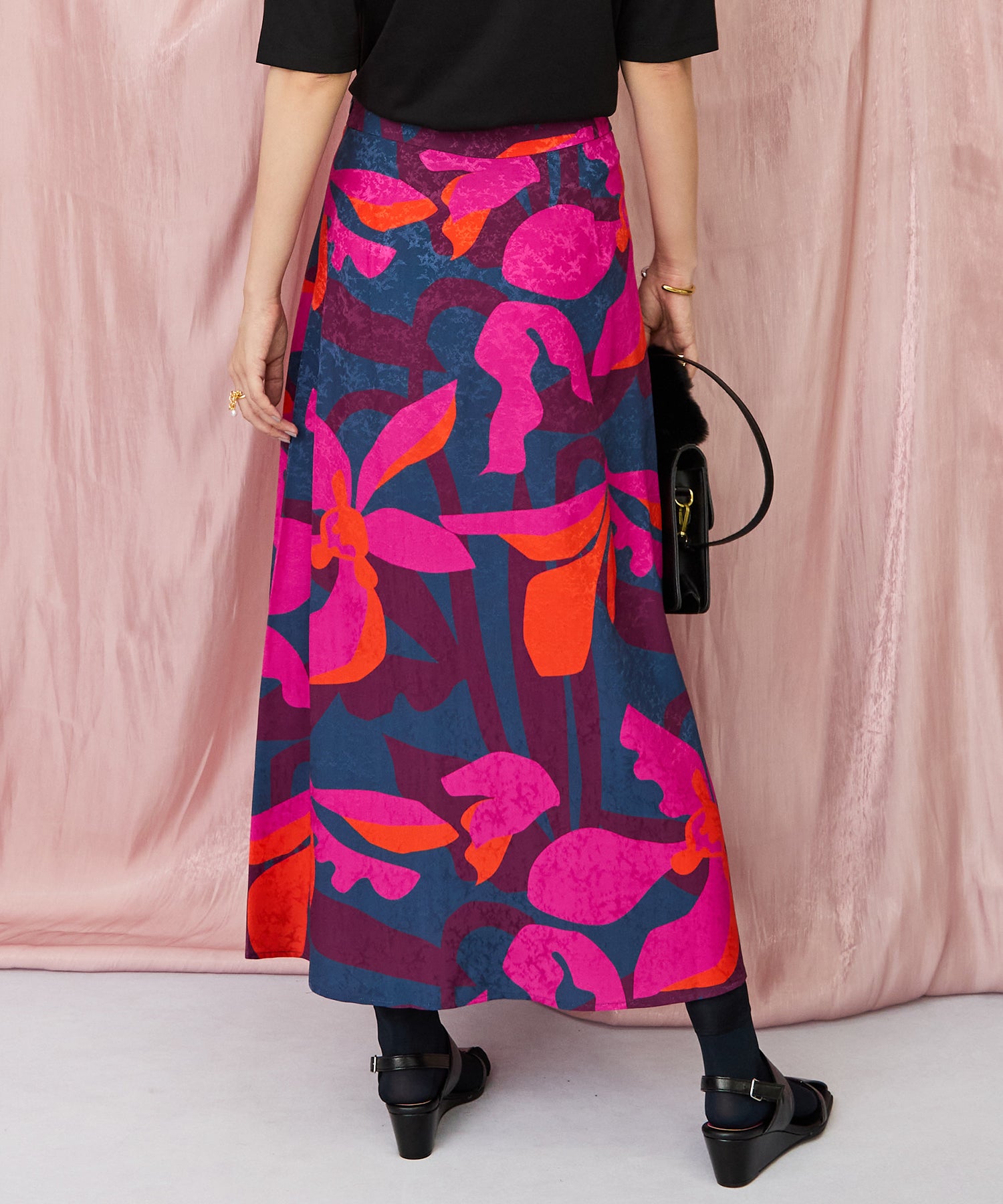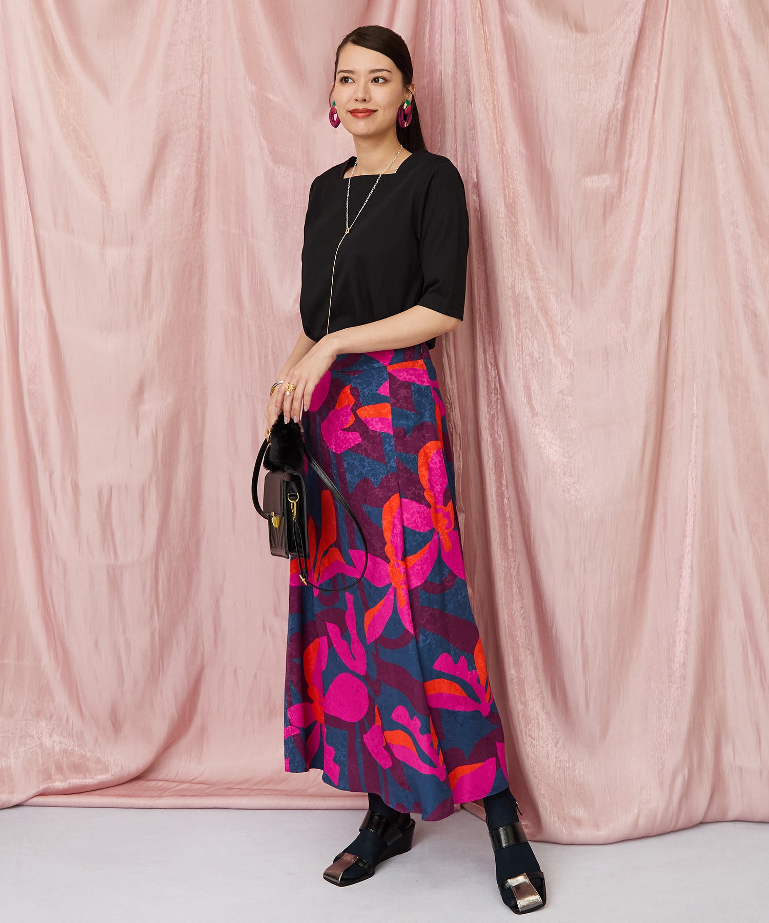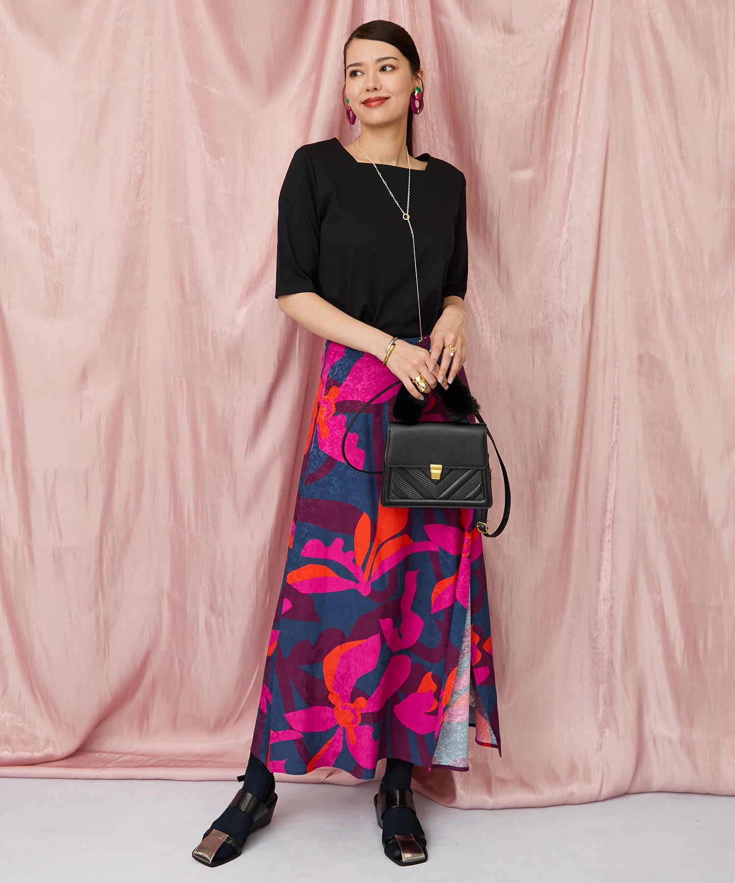 レーヨン生地ならではのとろみ感が歩くたびに柔らかく揺れ、女性らしい華やかな印象を作ります。サイドには大きくスリットが入っています。