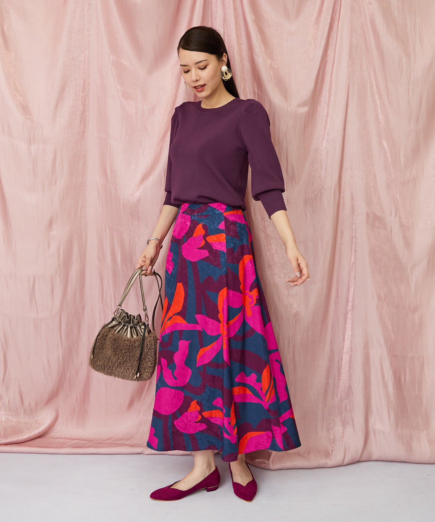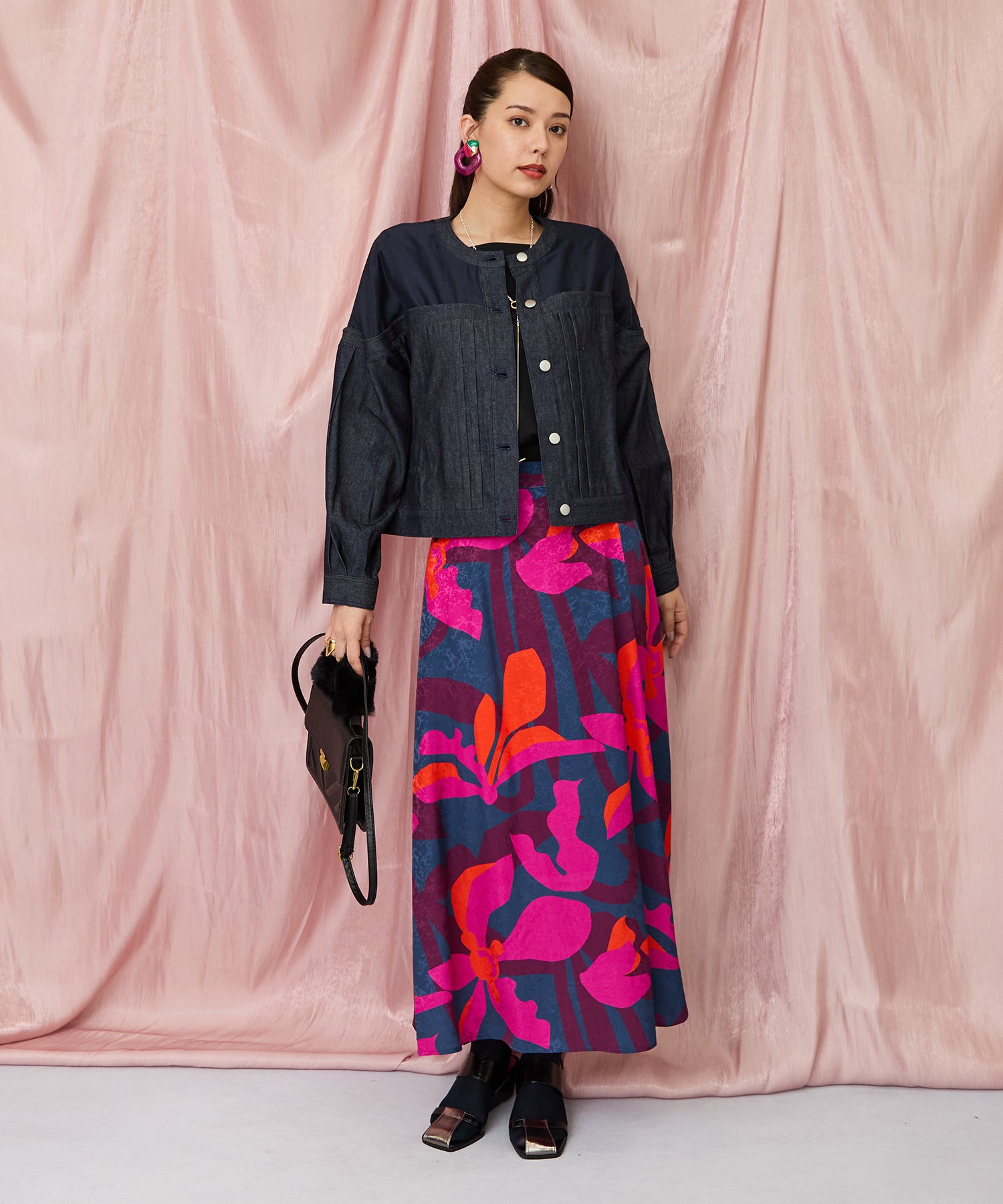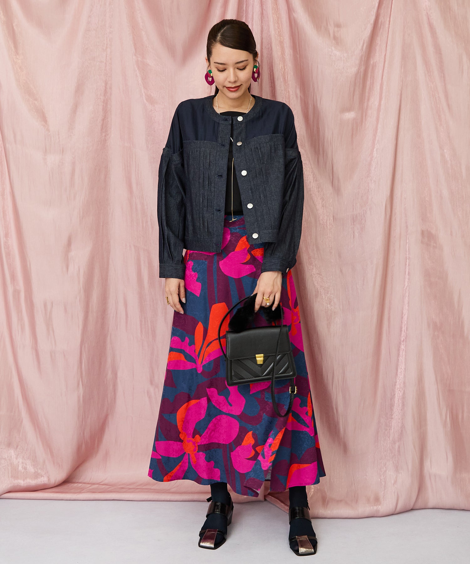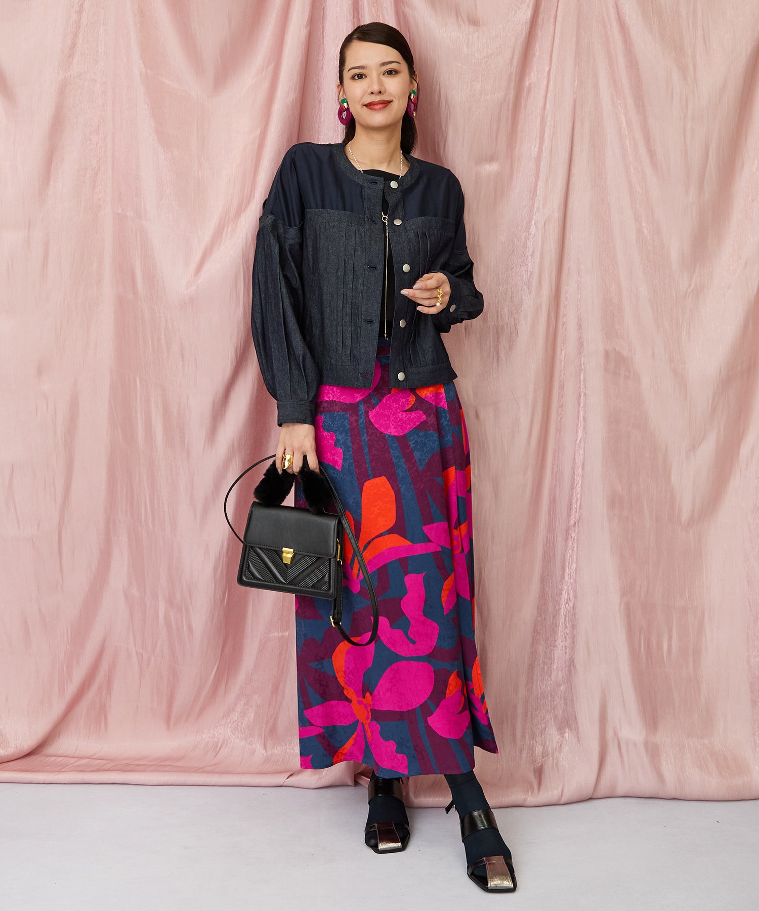 全体に施されたジオメトリックなフラワープリントが主役級に際立ちながら、微光沢感のある素材がエレガントな雰囲気をプラス。
