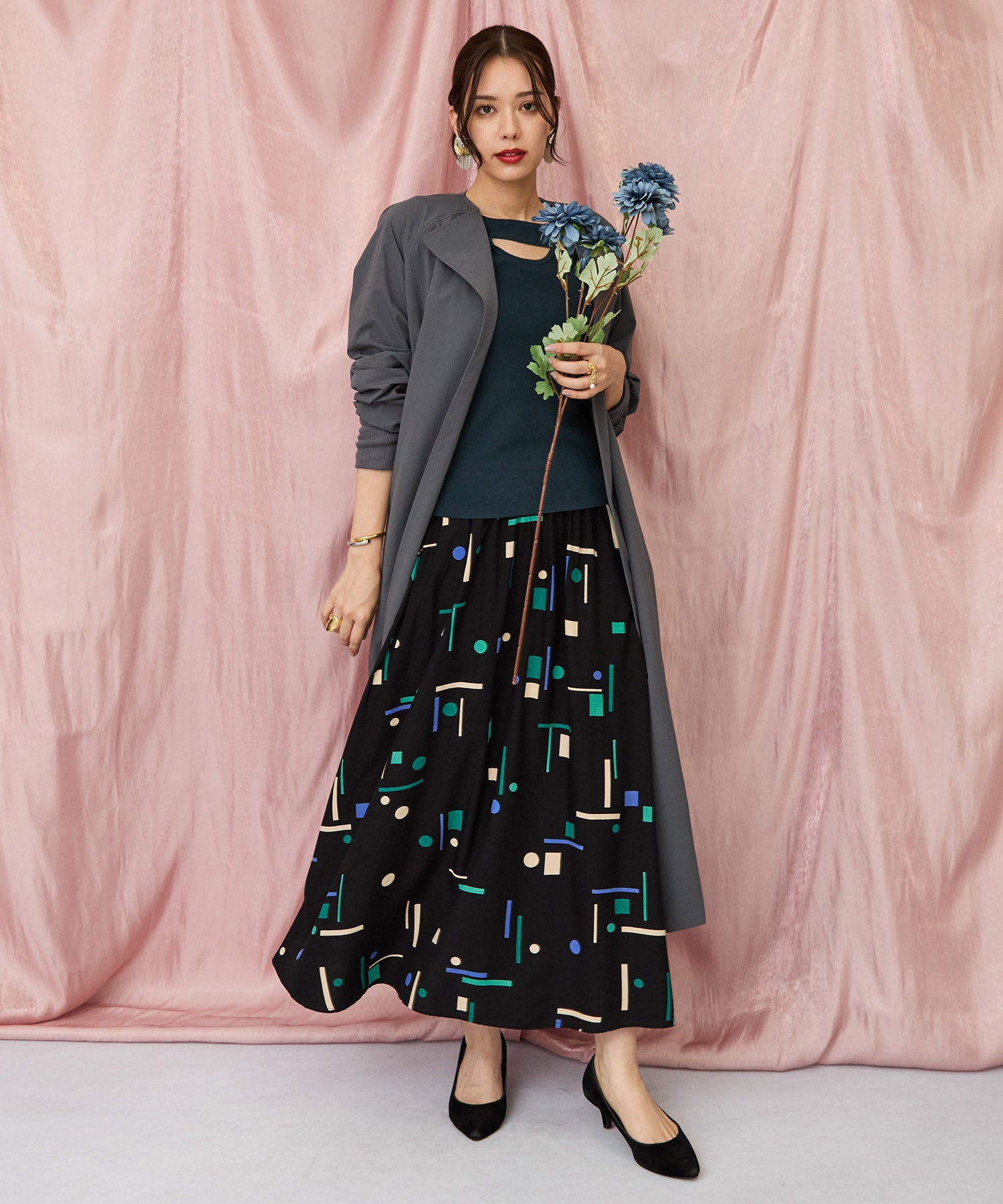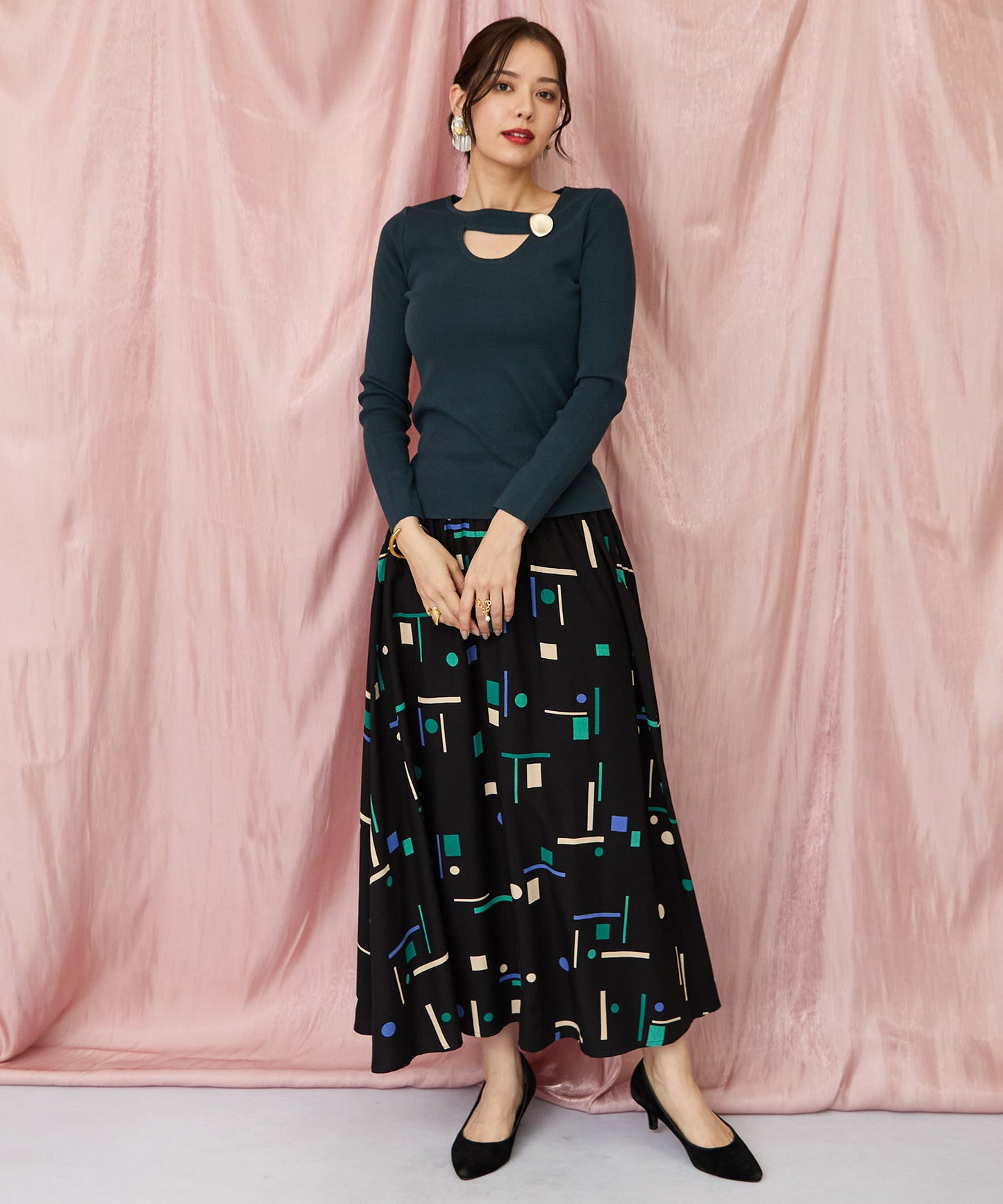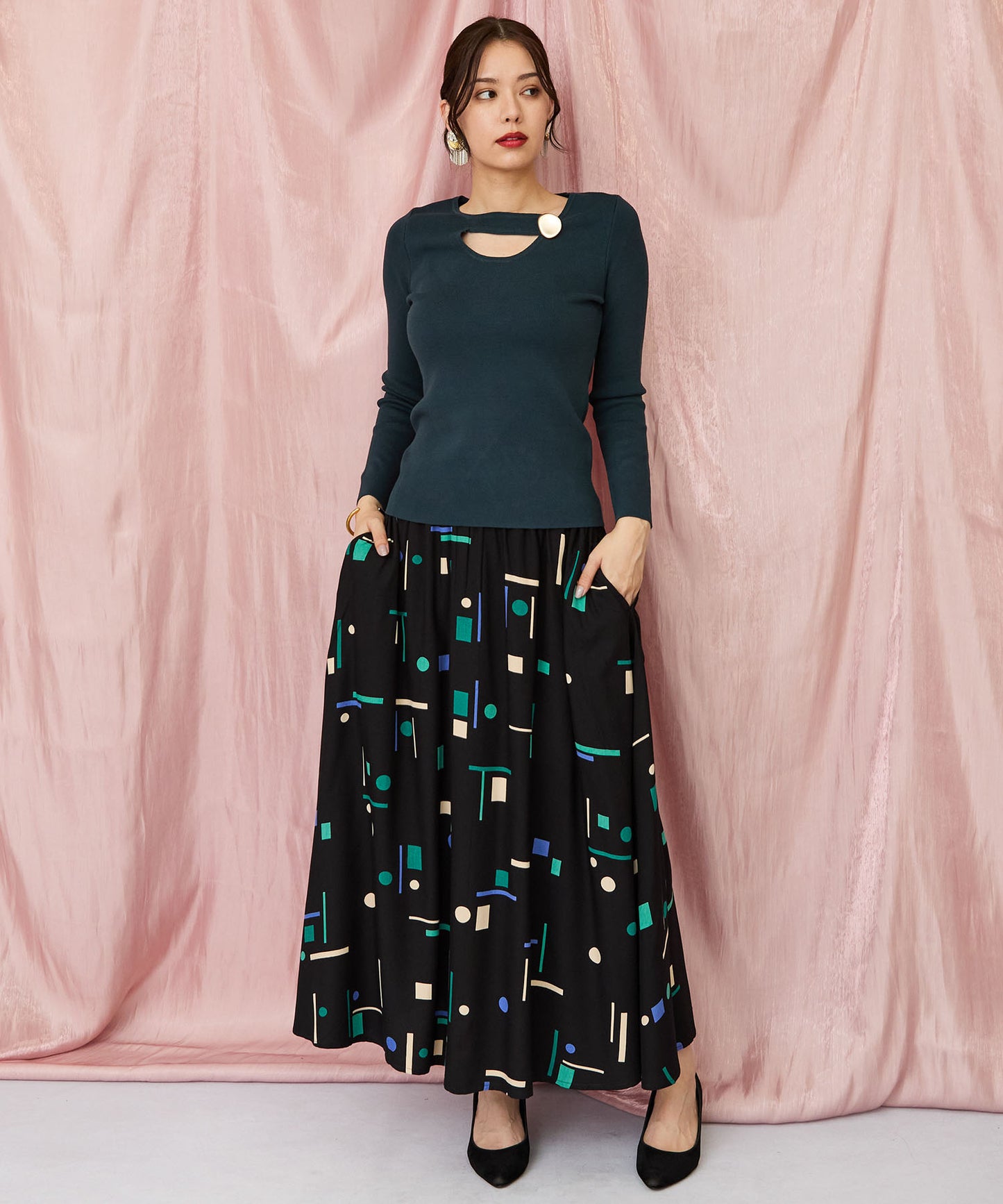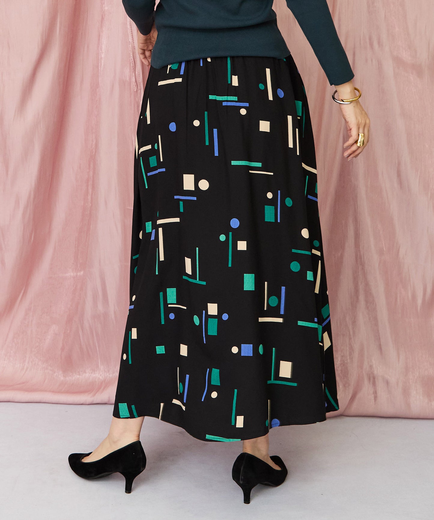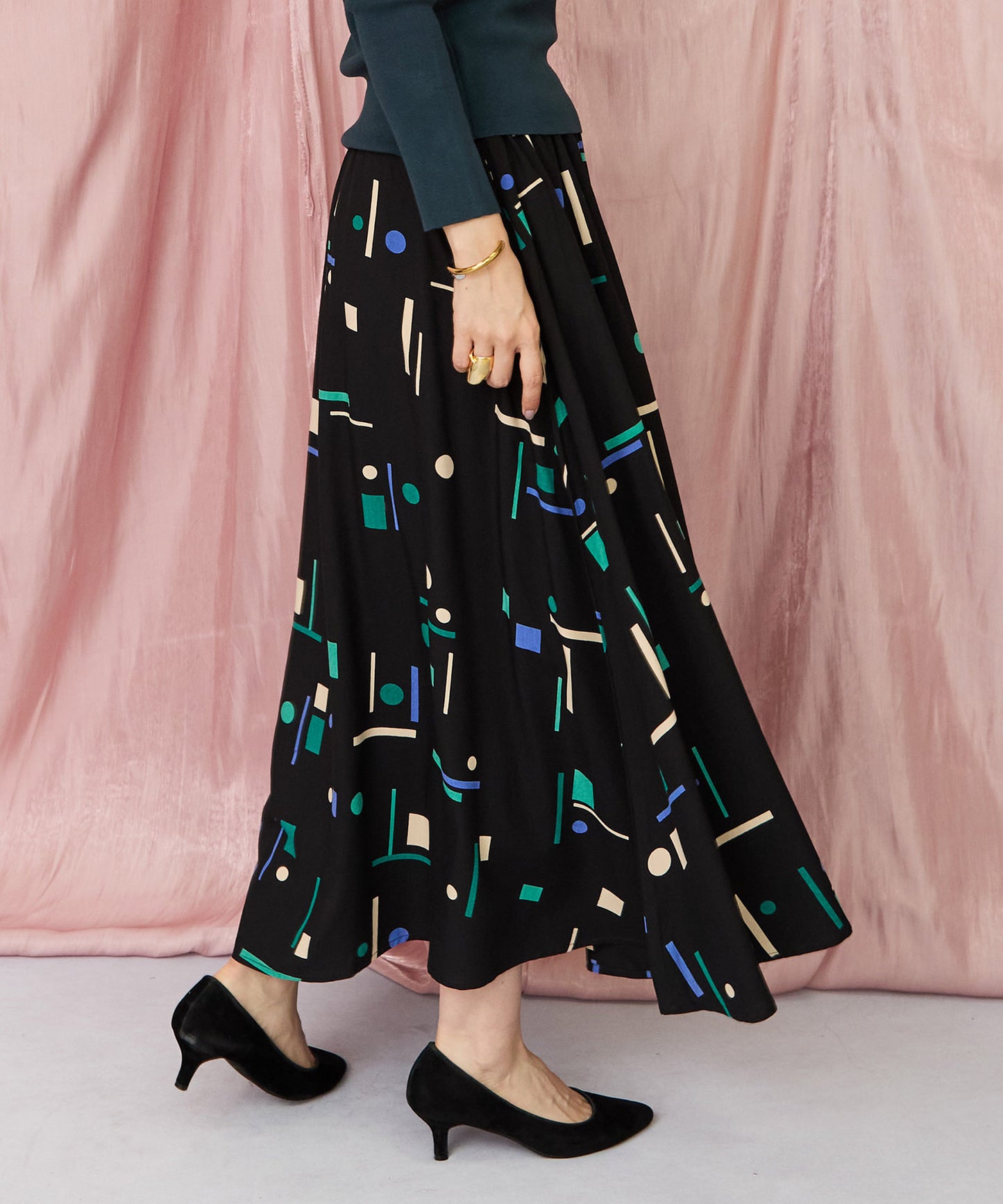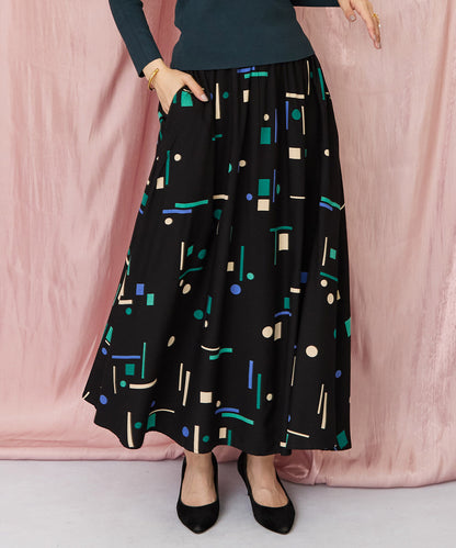 落ち着いたブラックベースに、ブルーやグリーンの幾何学柄が映えるフレアスカート。