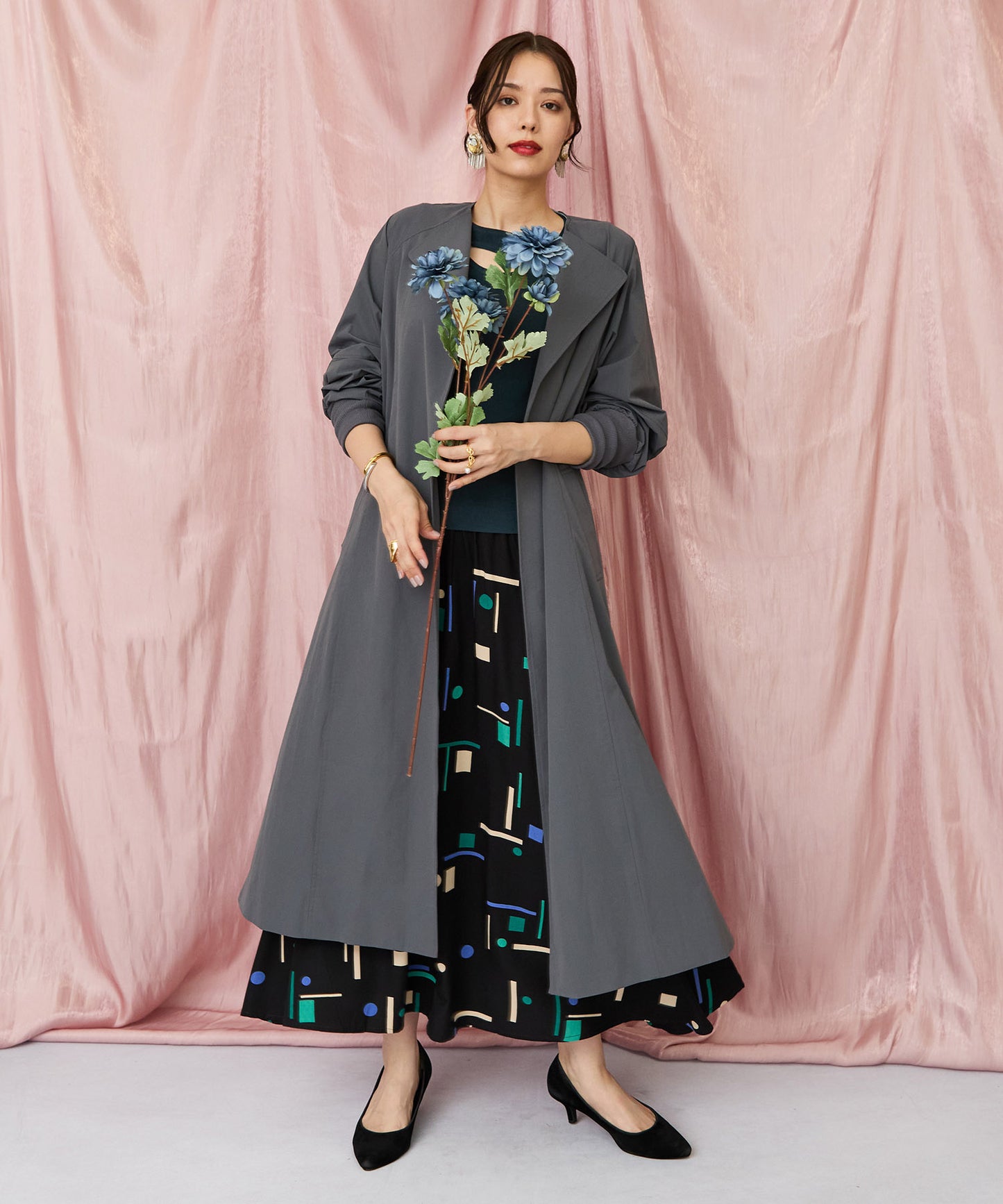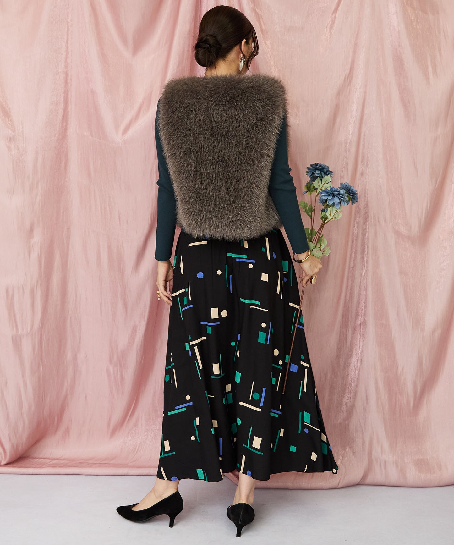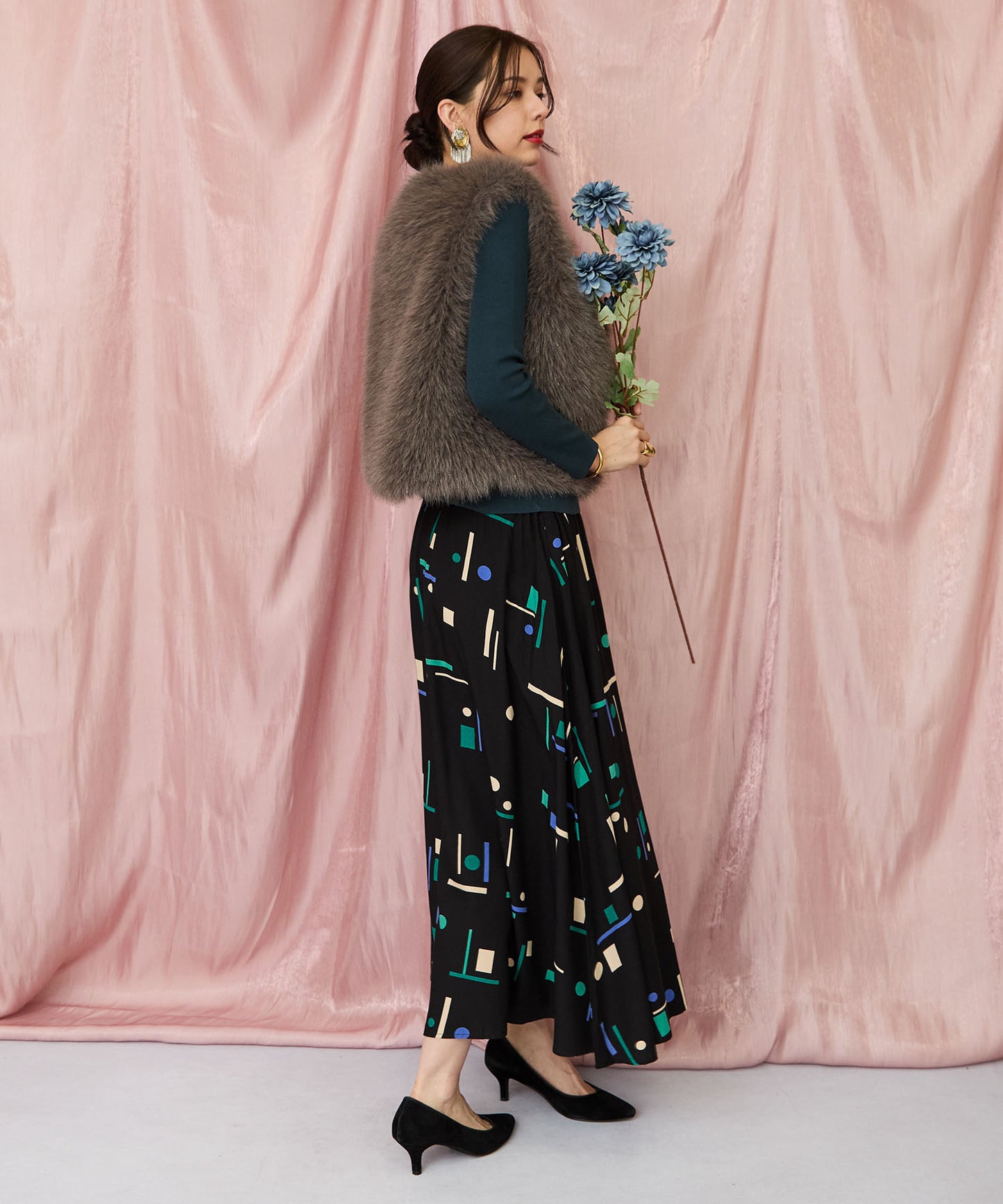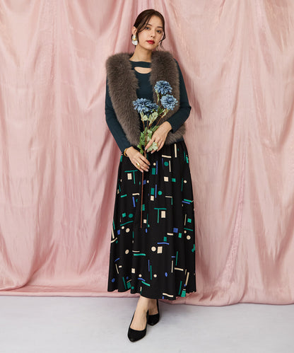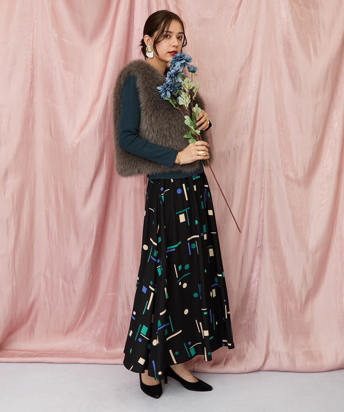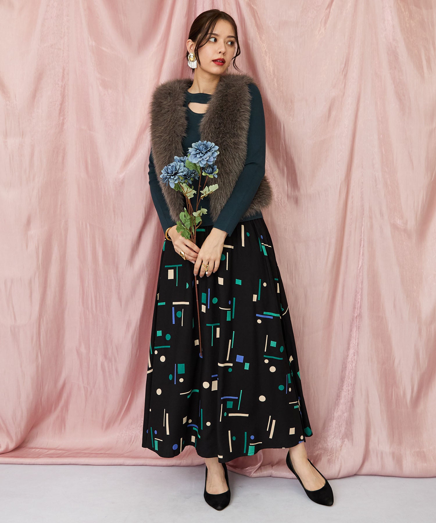 落ち着いたブラックベースに、ブルーやグリーンの幾何学柄が映えるフレアスカート。