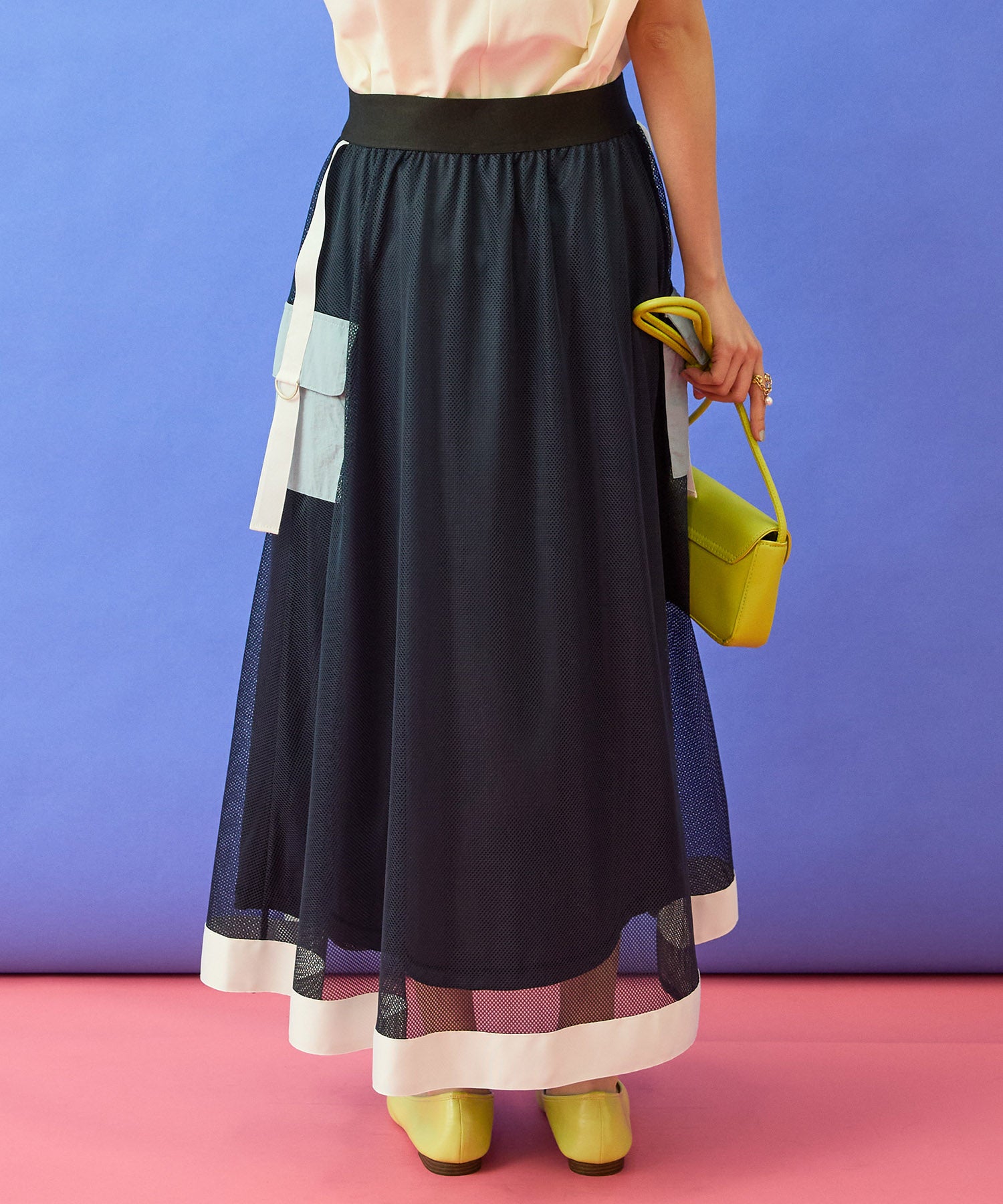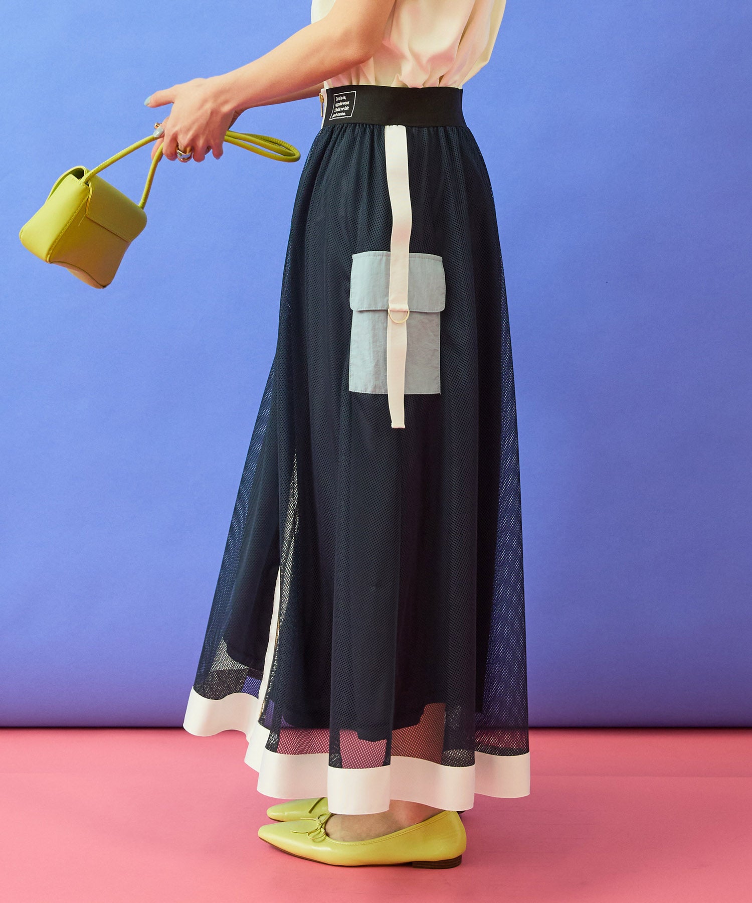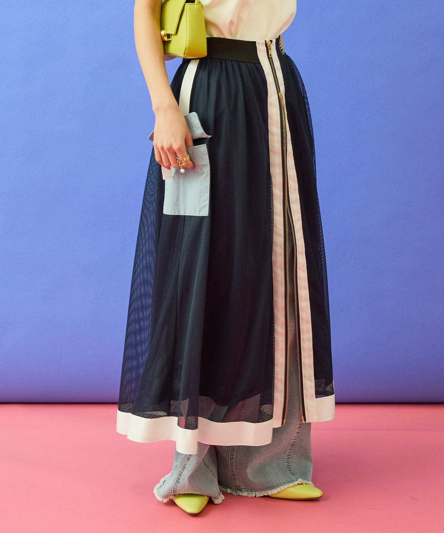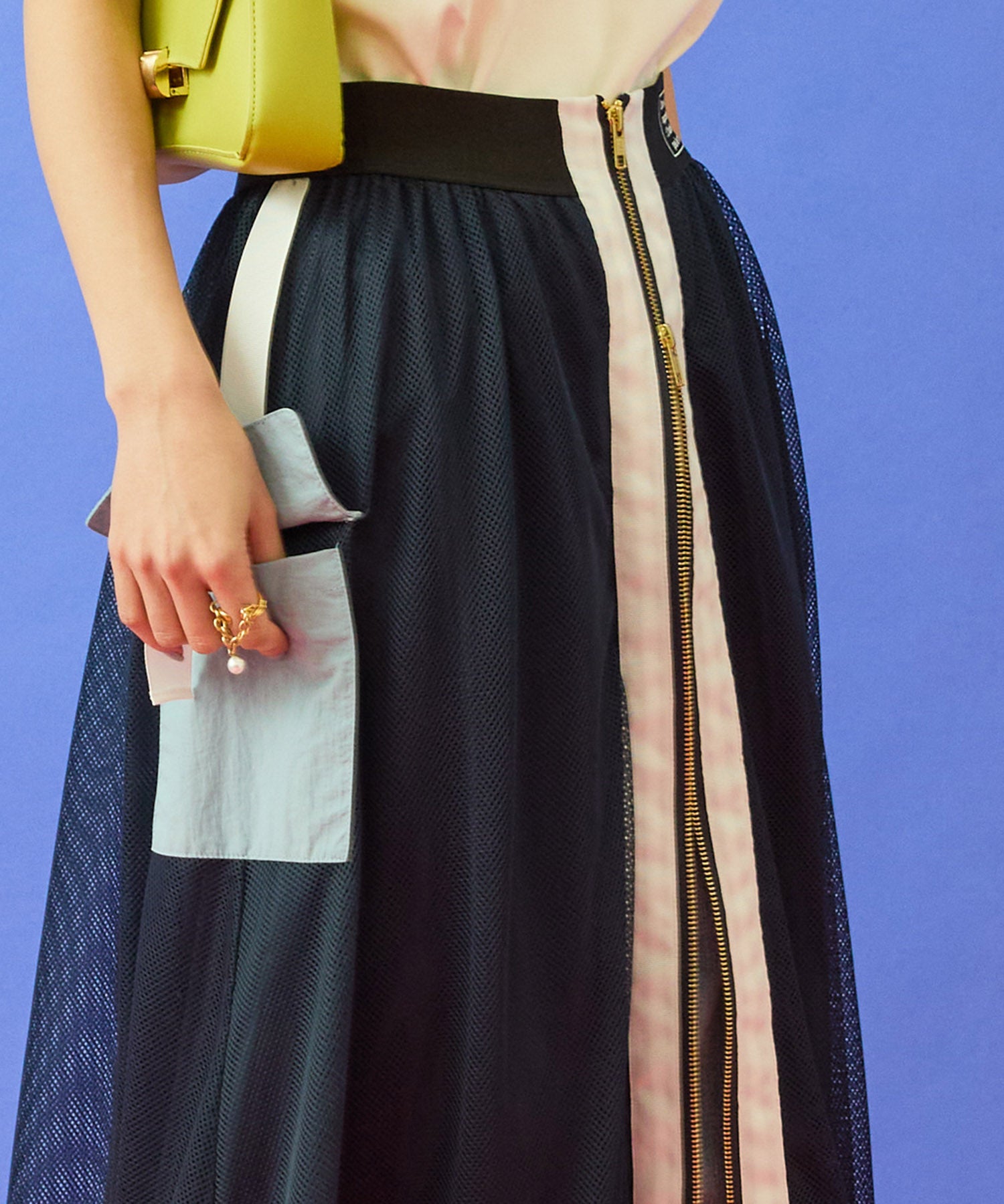 メッシュ素材の抜け感に、フロントZIPとカーゴディテールを効かせたデザインスカート。