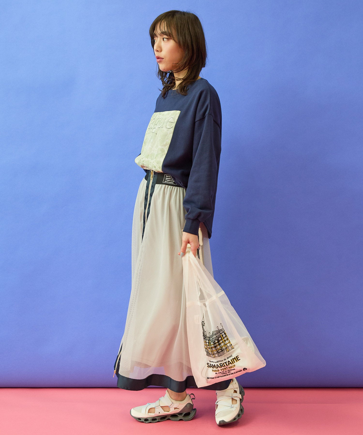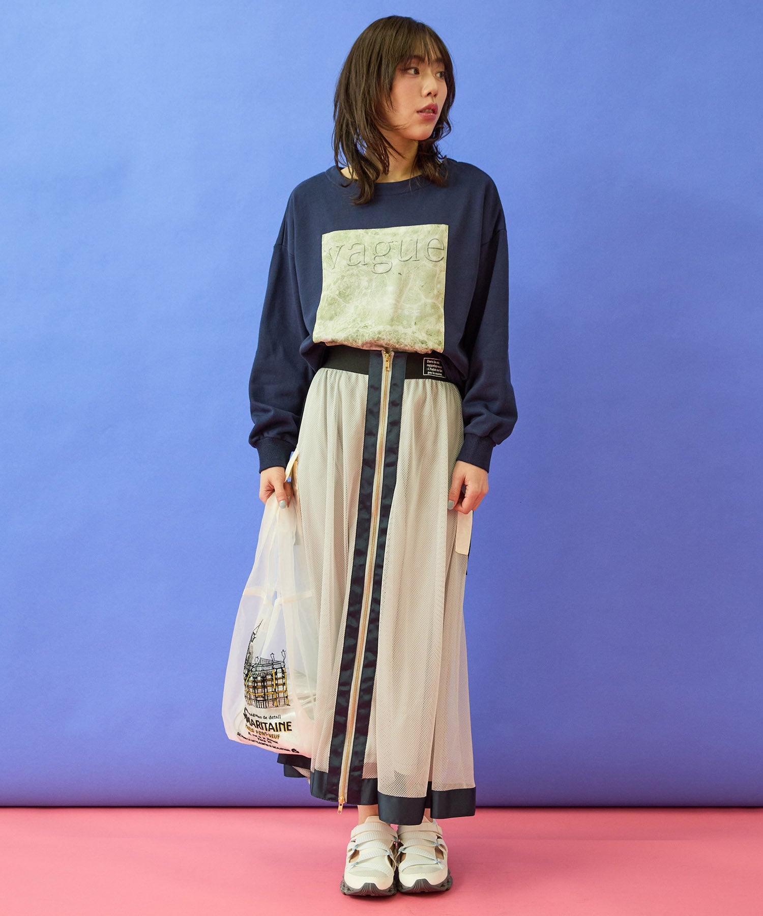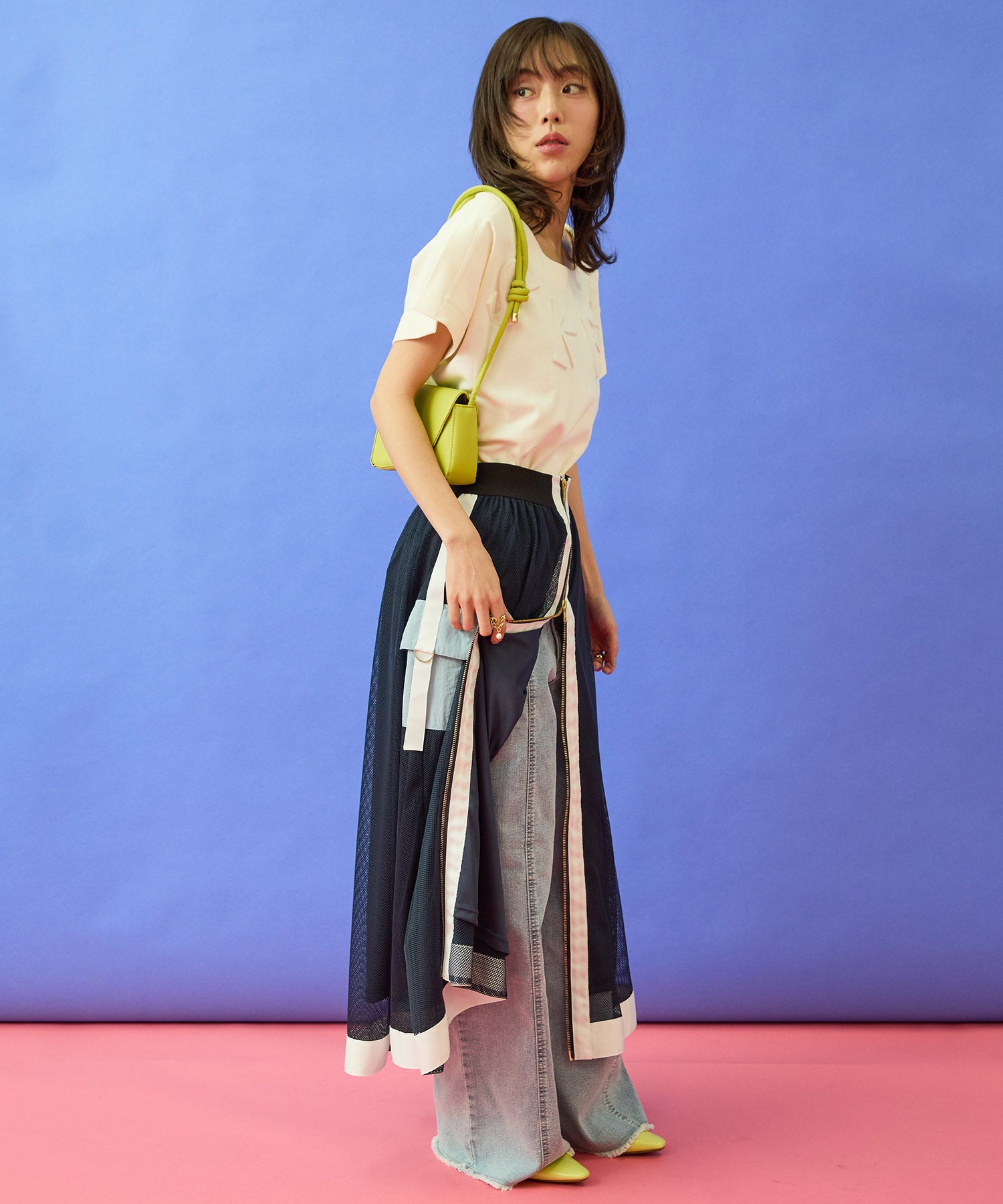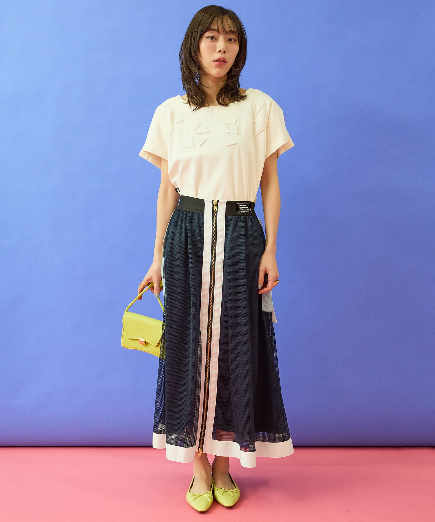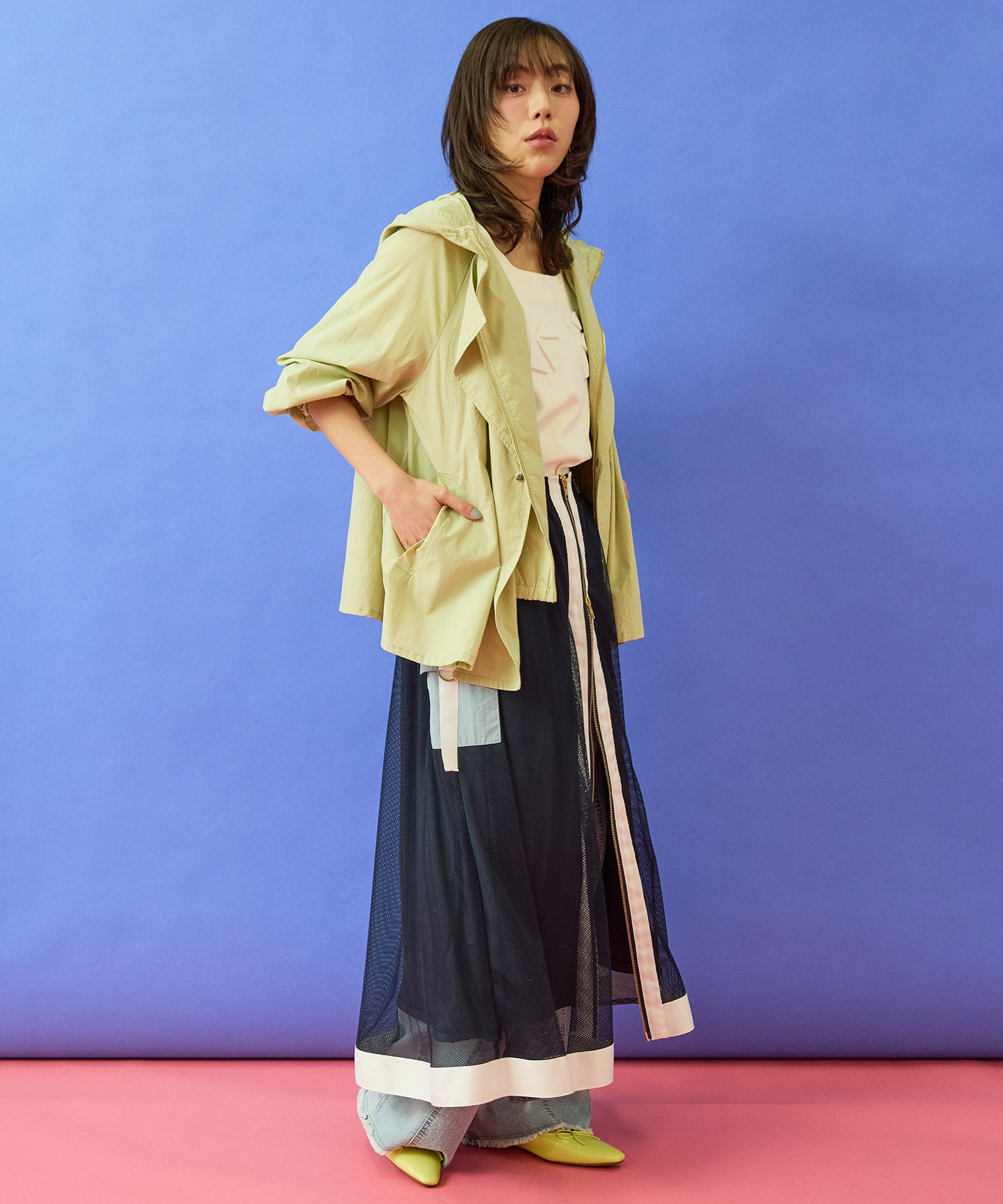 メッシュ素材の抜け感に、フロントZIPとカーゴディテールを効かせたデザインスカート。
