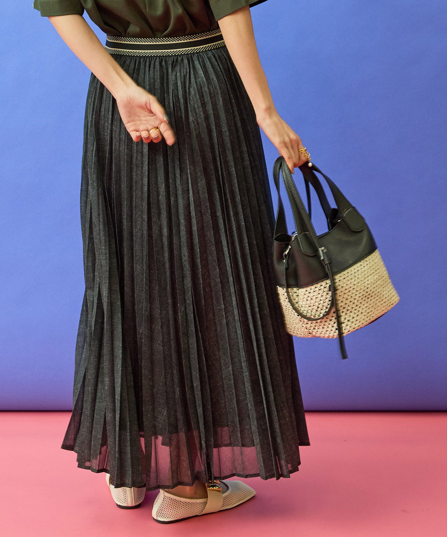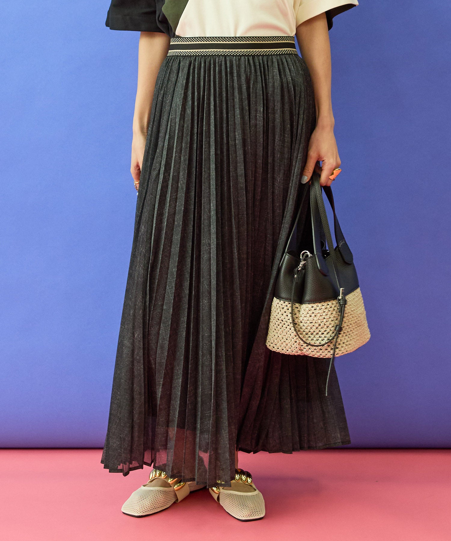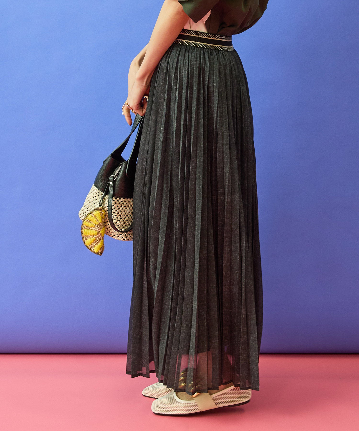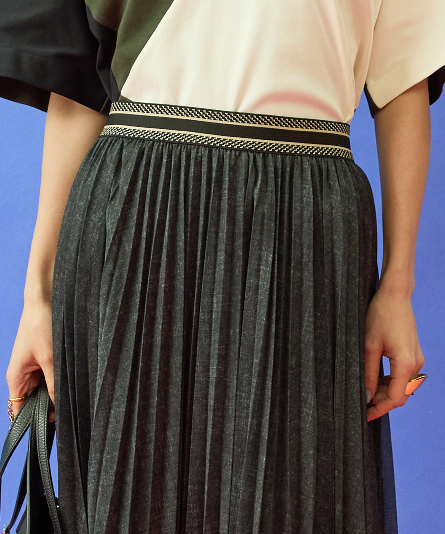 デニム調のプリントをシアー素材にのせた、表情豊かなプリーツスカート。