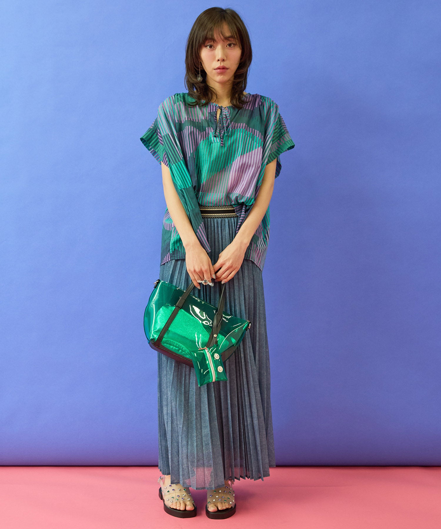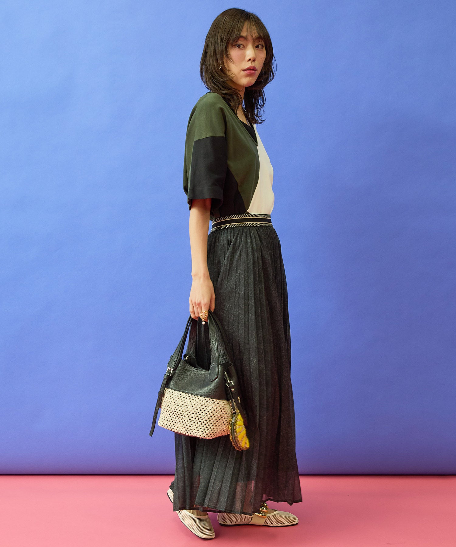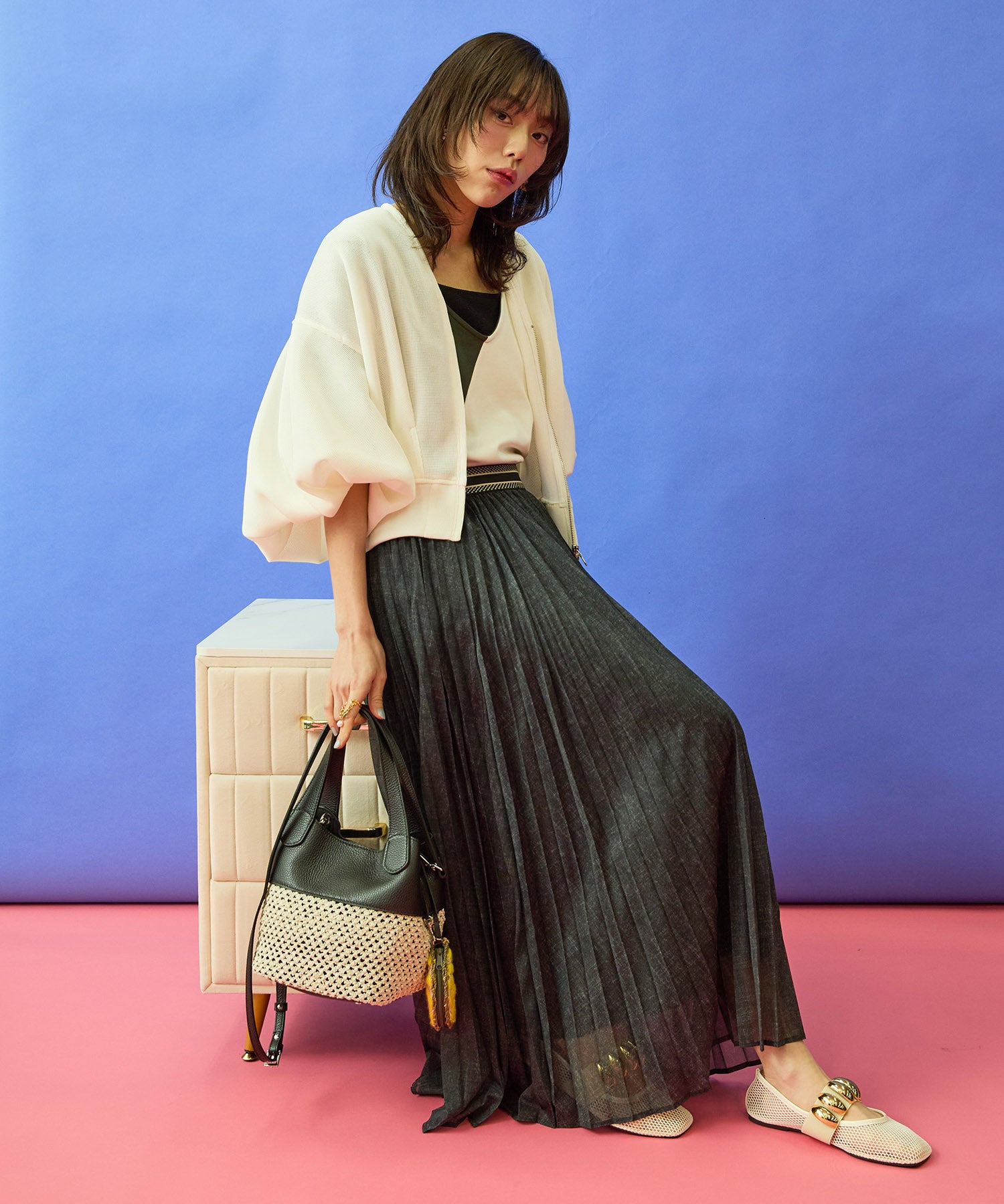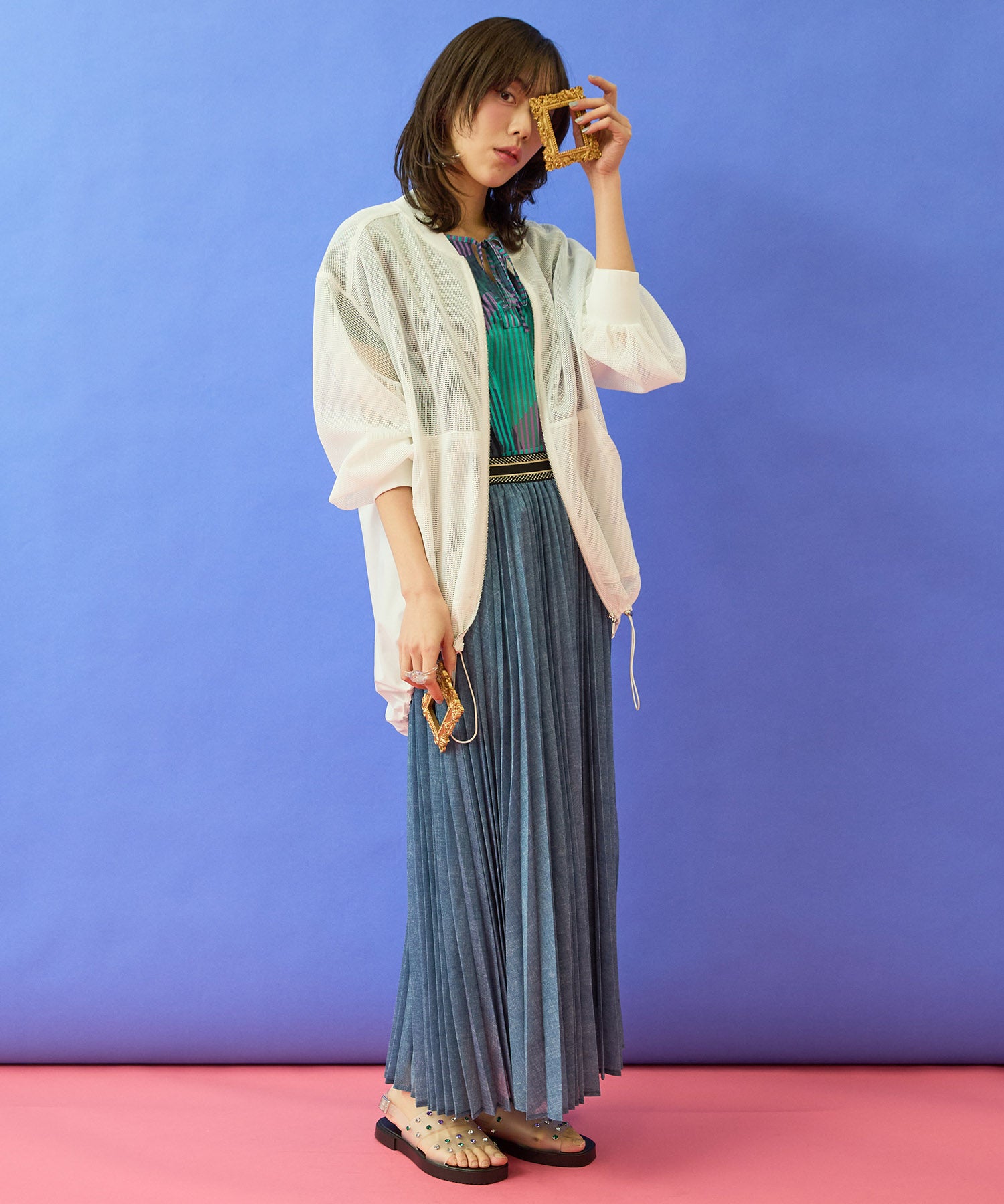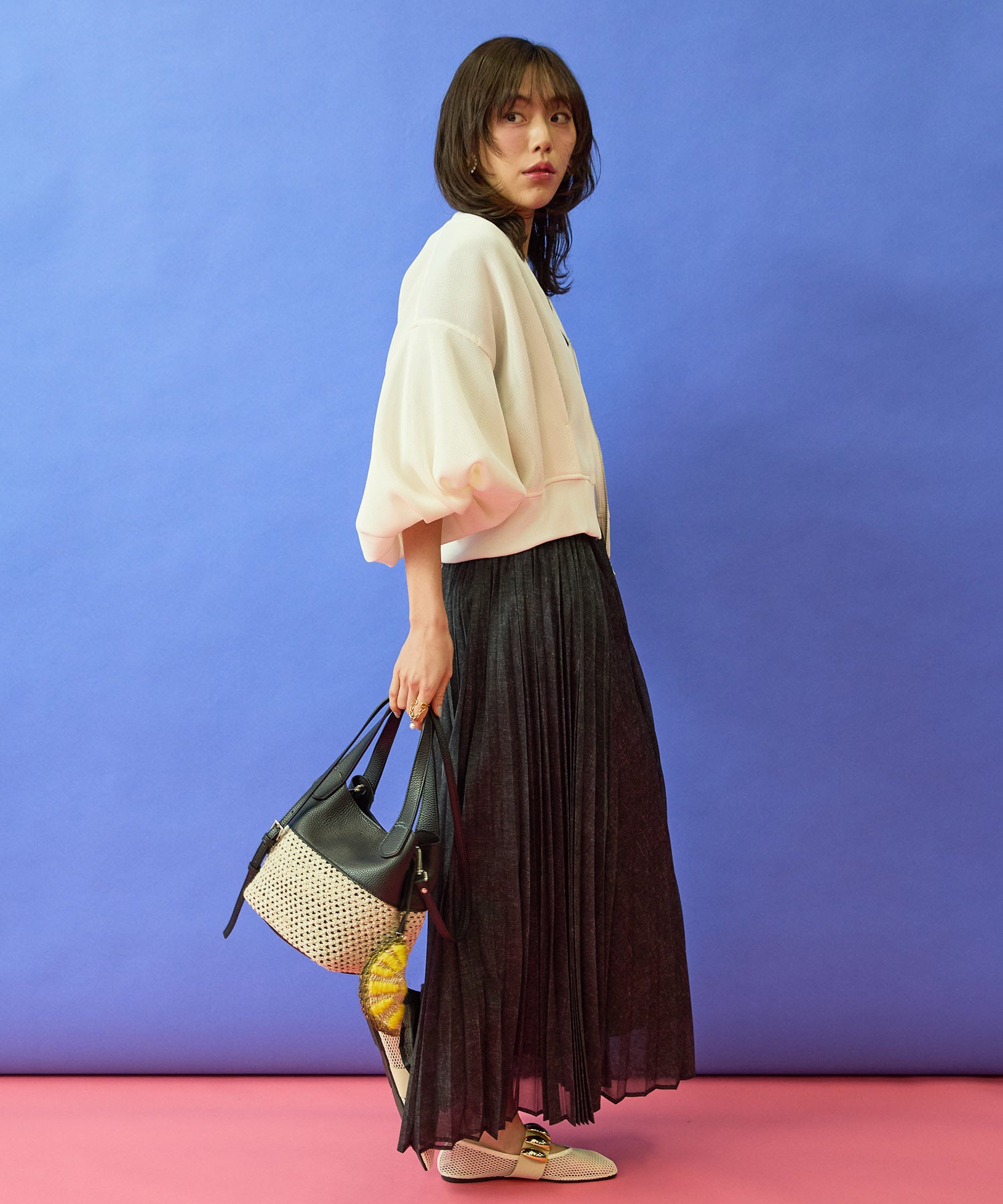 デニム調のプリントをシアー素材にのせた、表情豊かなプリーツスカート。