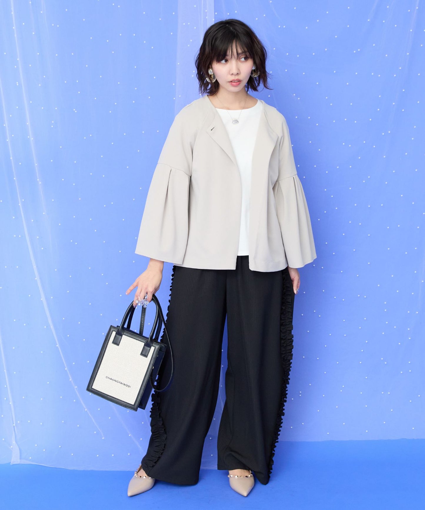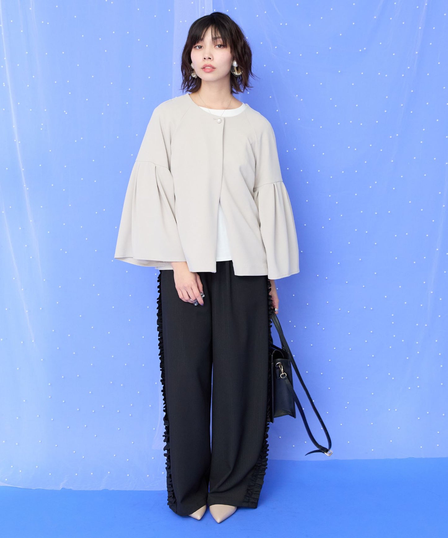 フレアスリーブとバックペプラムがポイントのノーカラージャケット。