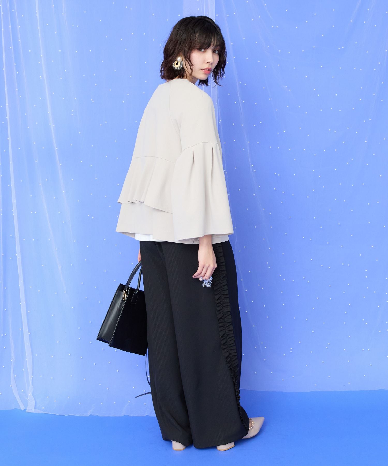 ボトムを選ばない絶妙な丈感で、パンツにもスカートにも合わせやすく、オケージョンからデイリーまで幅広く活躍する一着です。