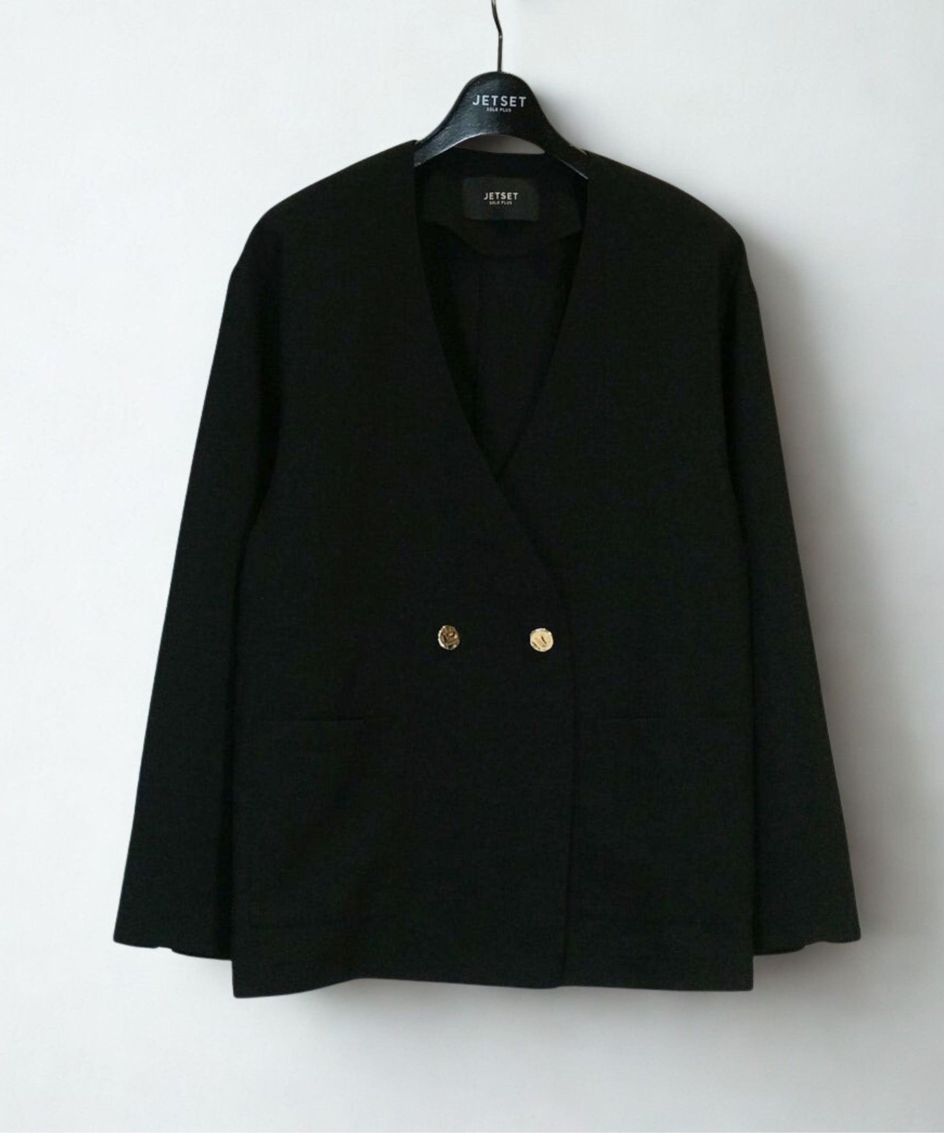 ダブル仕立てのデザインはきちんと感があり、メタリックボタンが女性らしい印象をプラス。