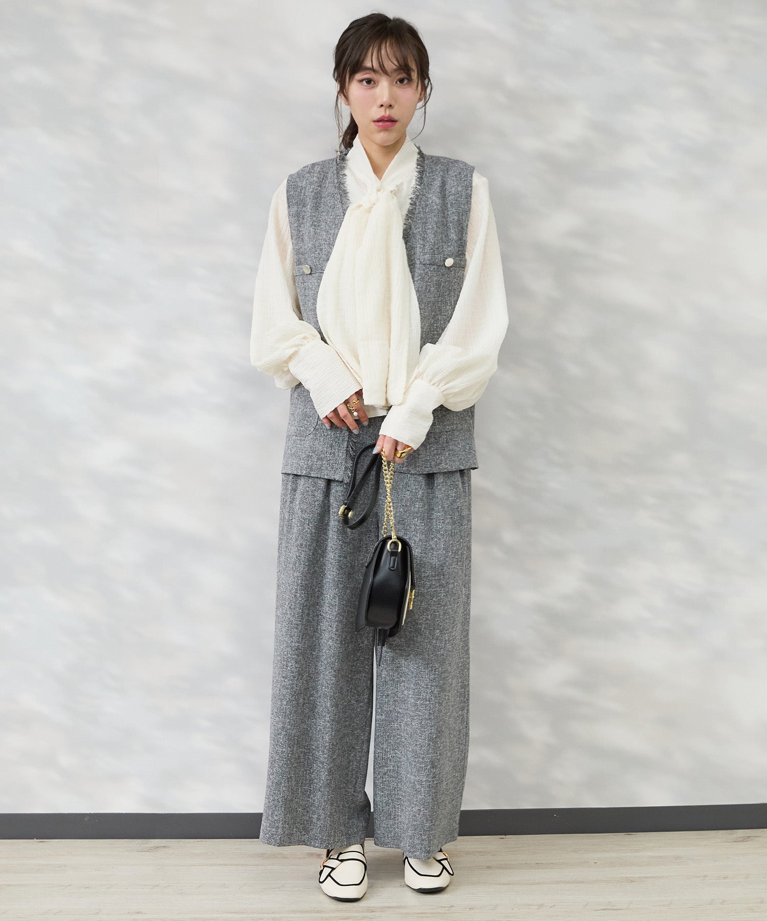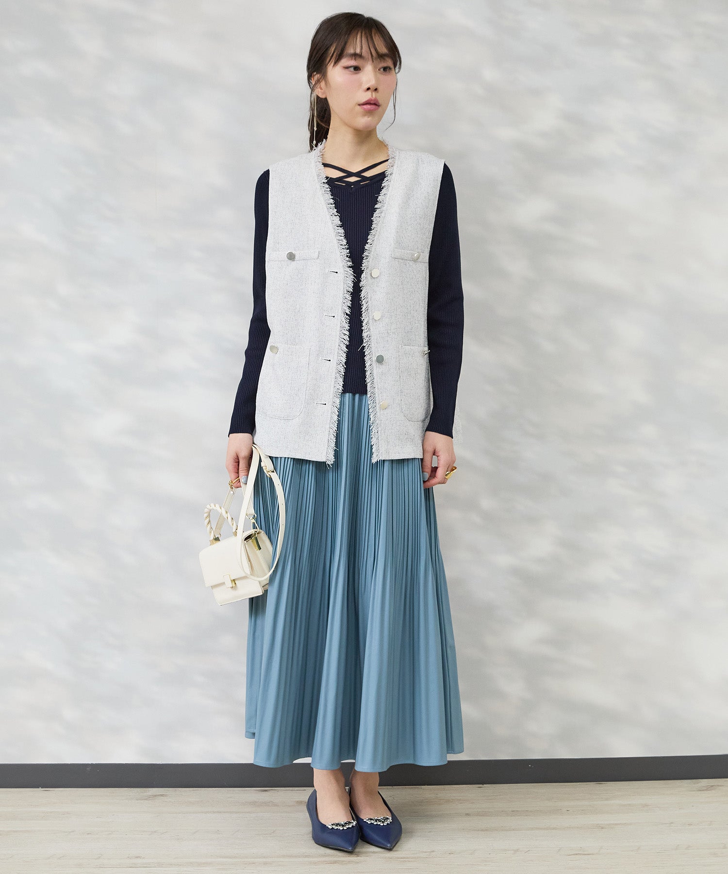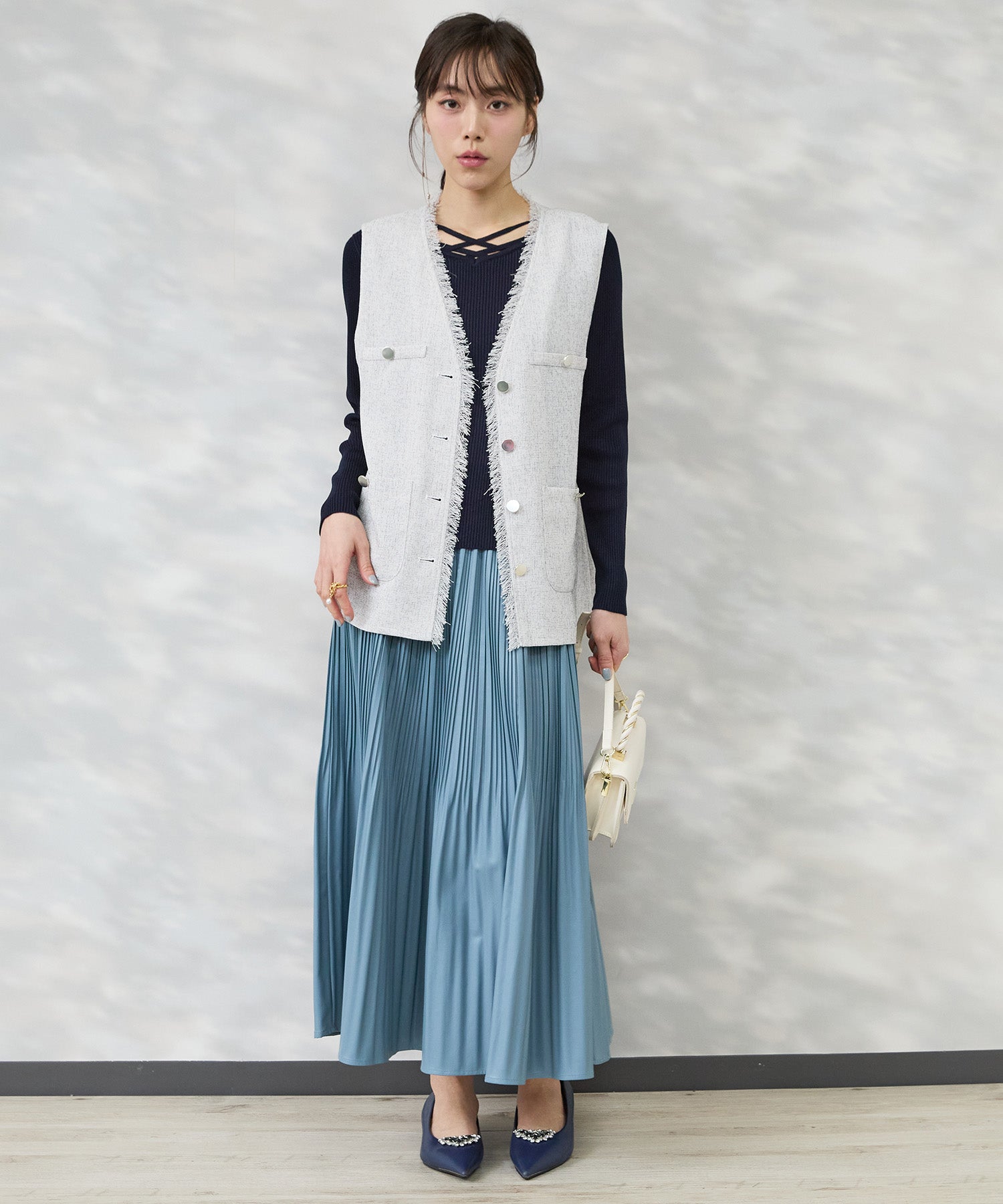 ブラウスやシアートップスに重ねて、きれいめなレイヤードスタイルに。