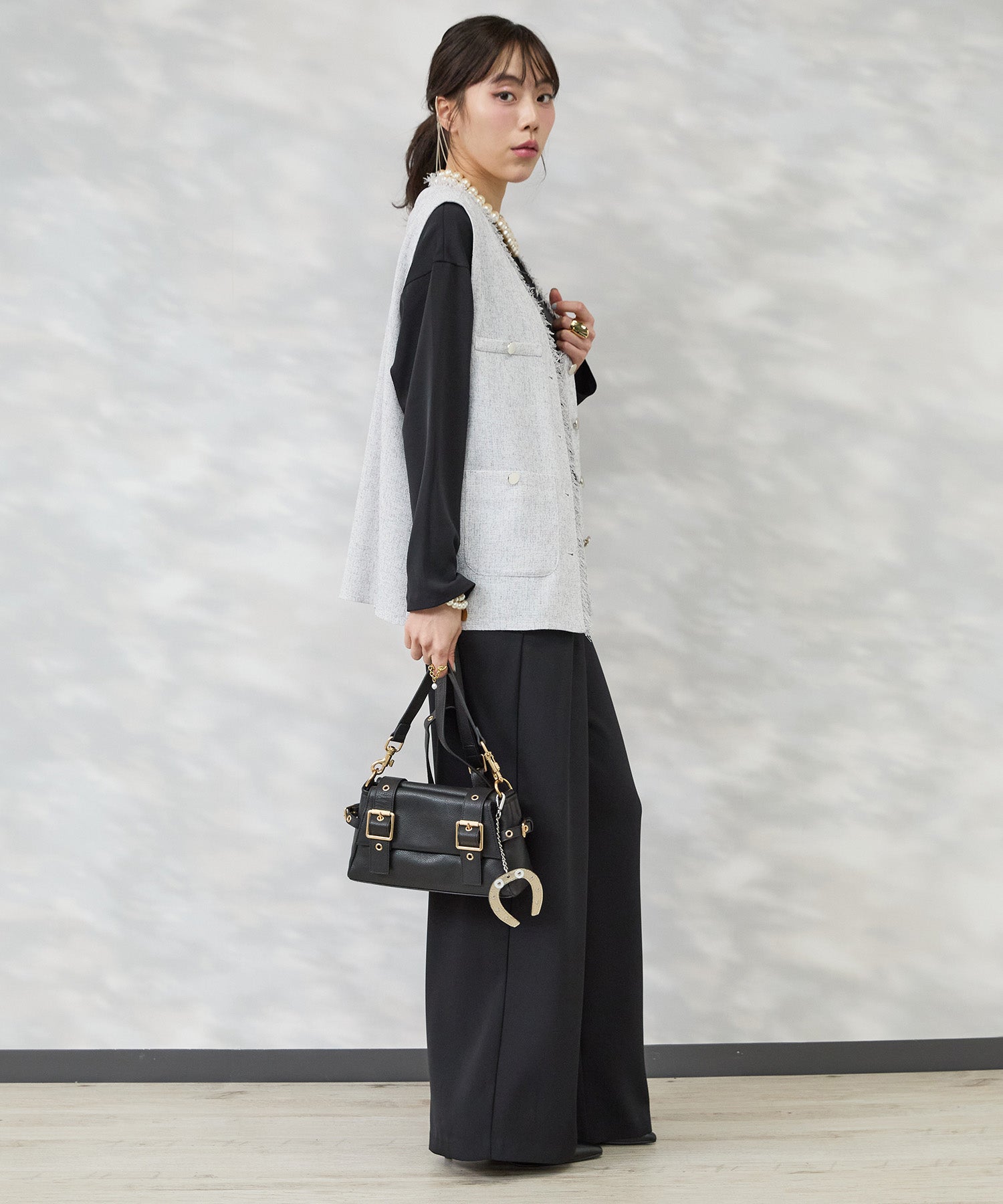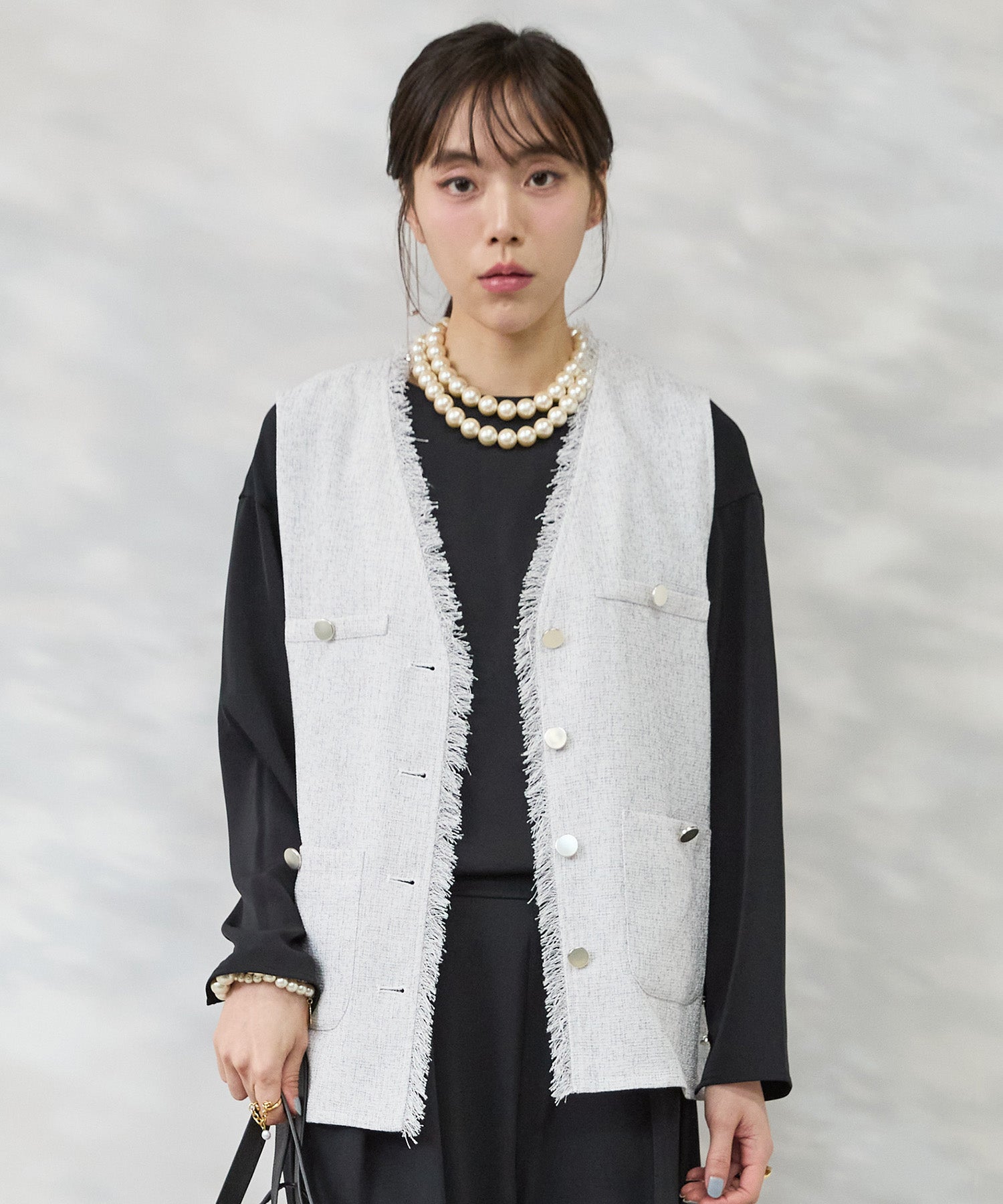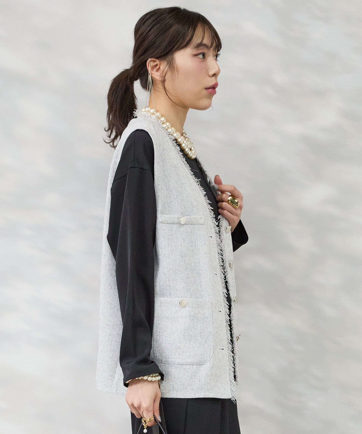 表情豊かなツイード素材に、さりげないフリンジディテールが映えるジレ。