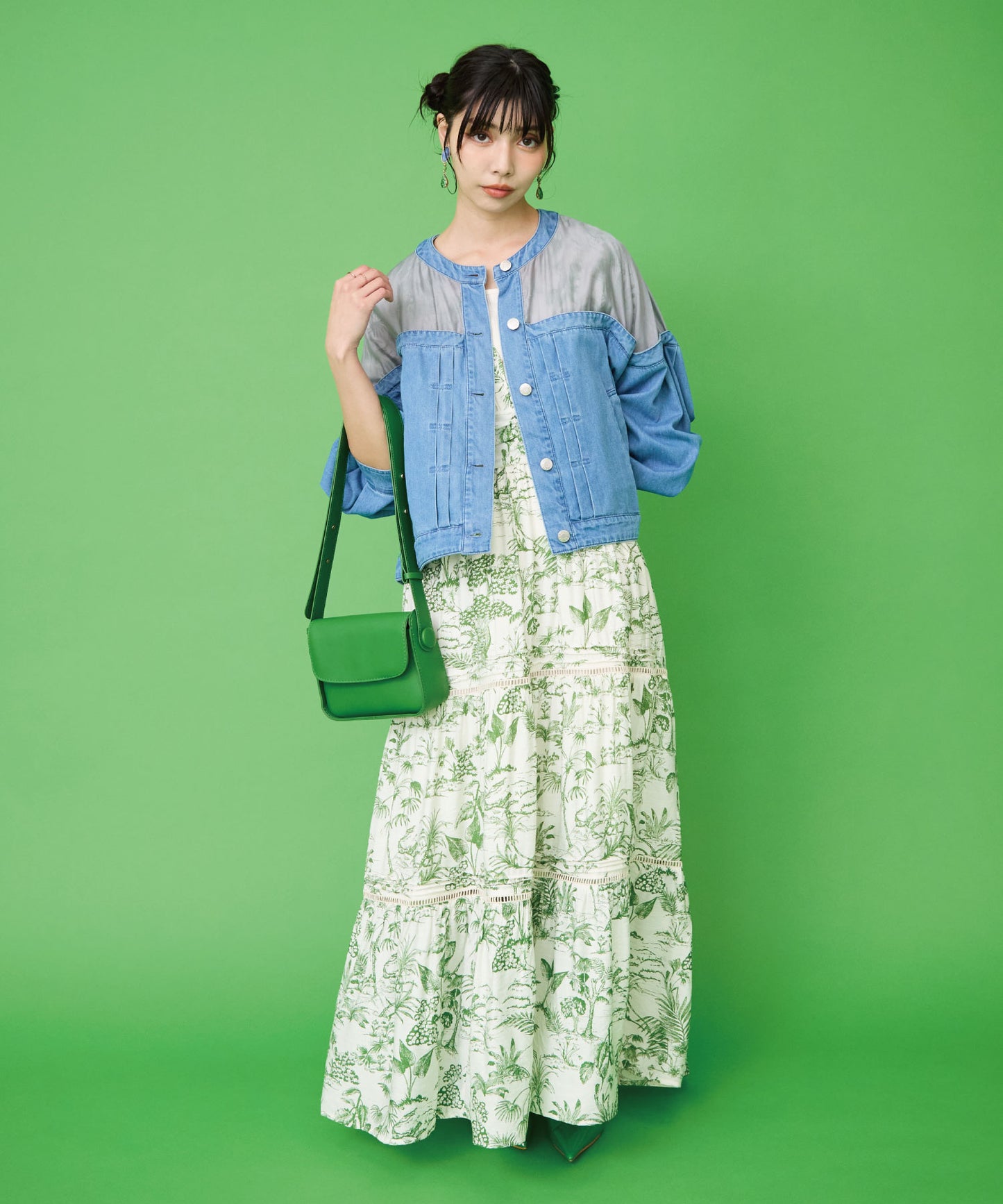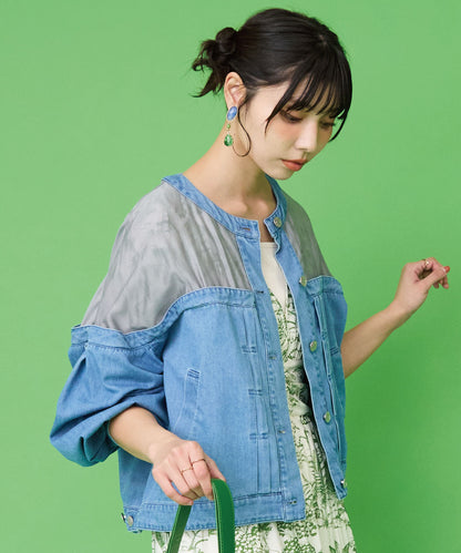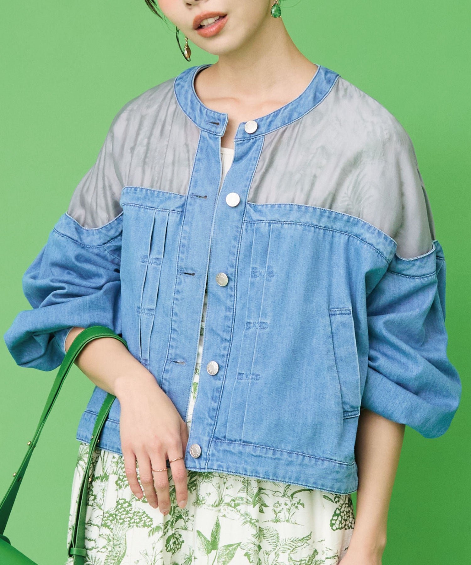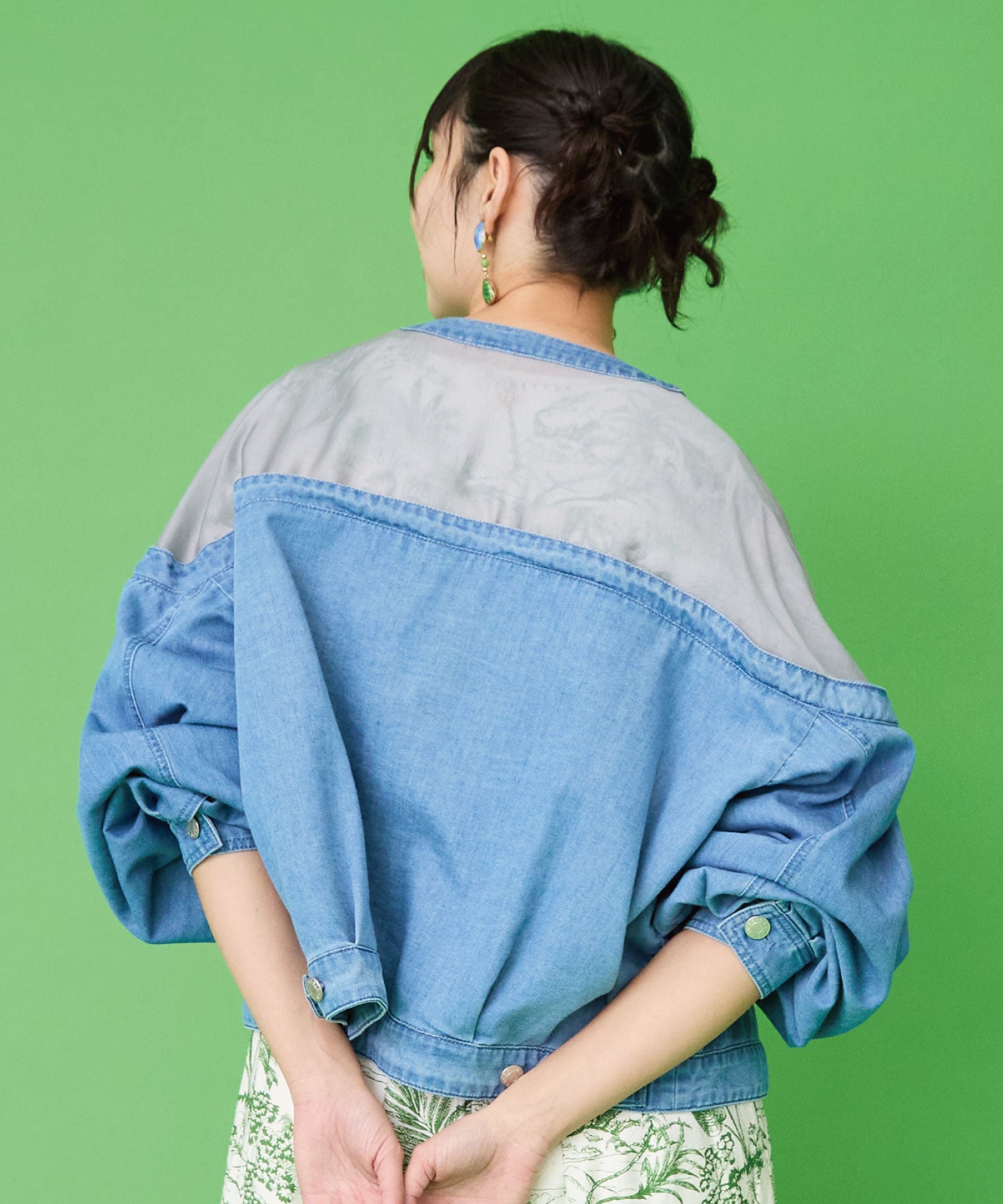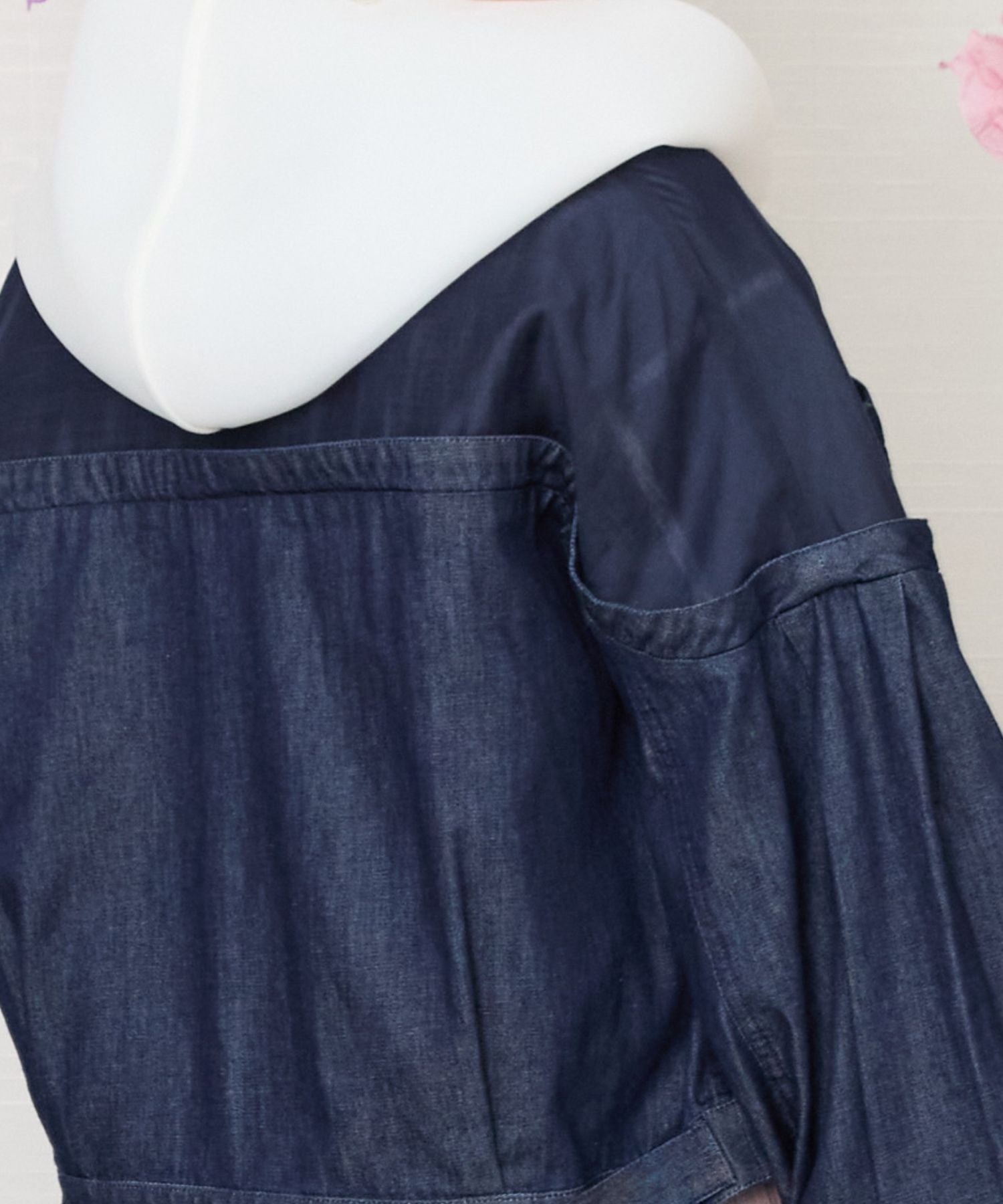 シアー素材の上にオフショルダーデニムを重ねたようなリメイク風デザインが目を引く一枚。