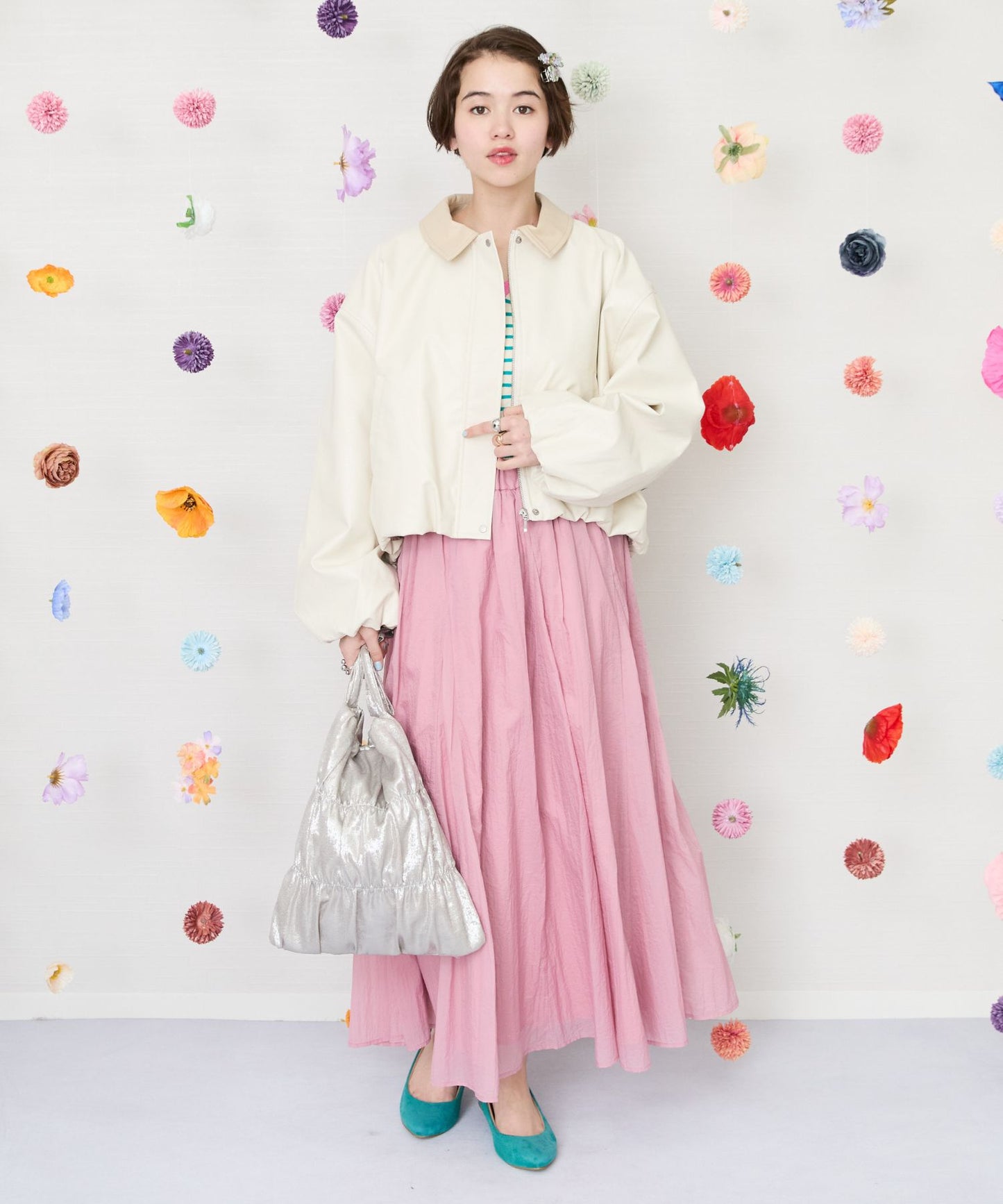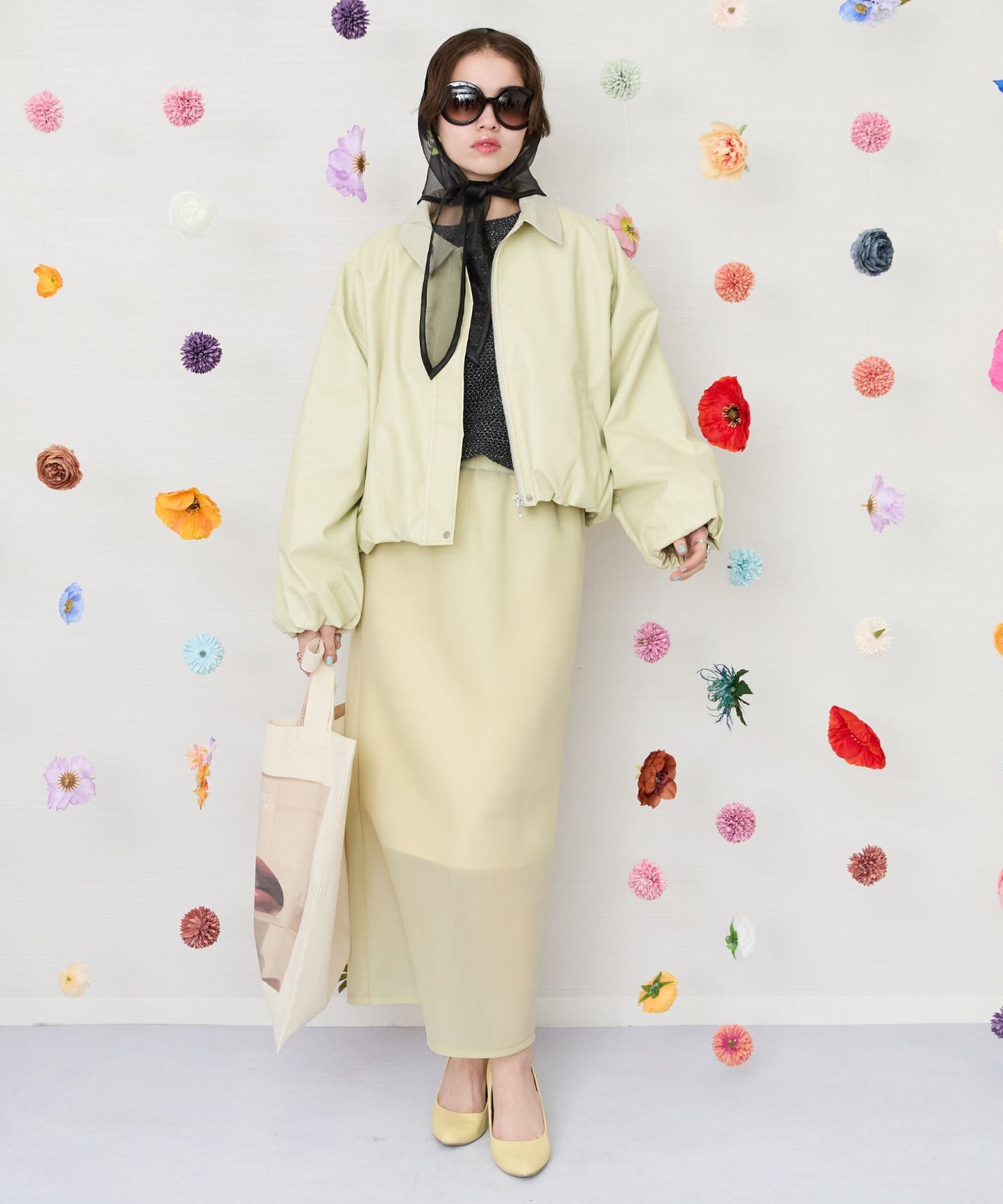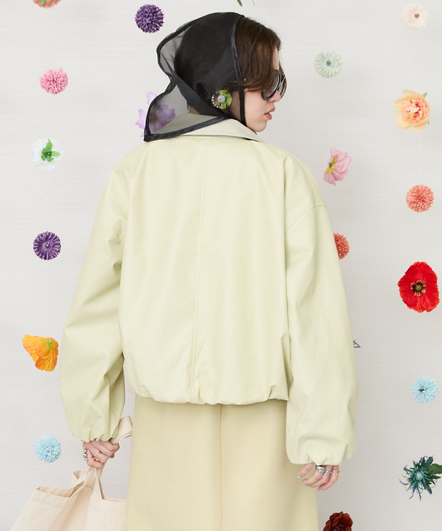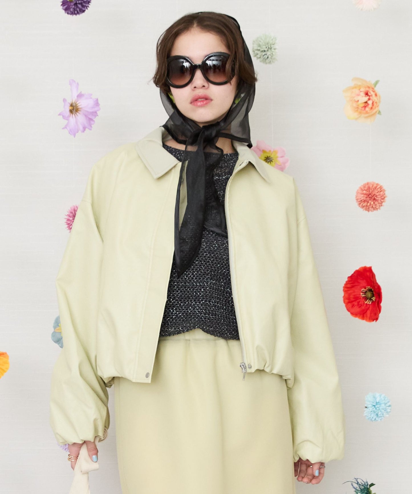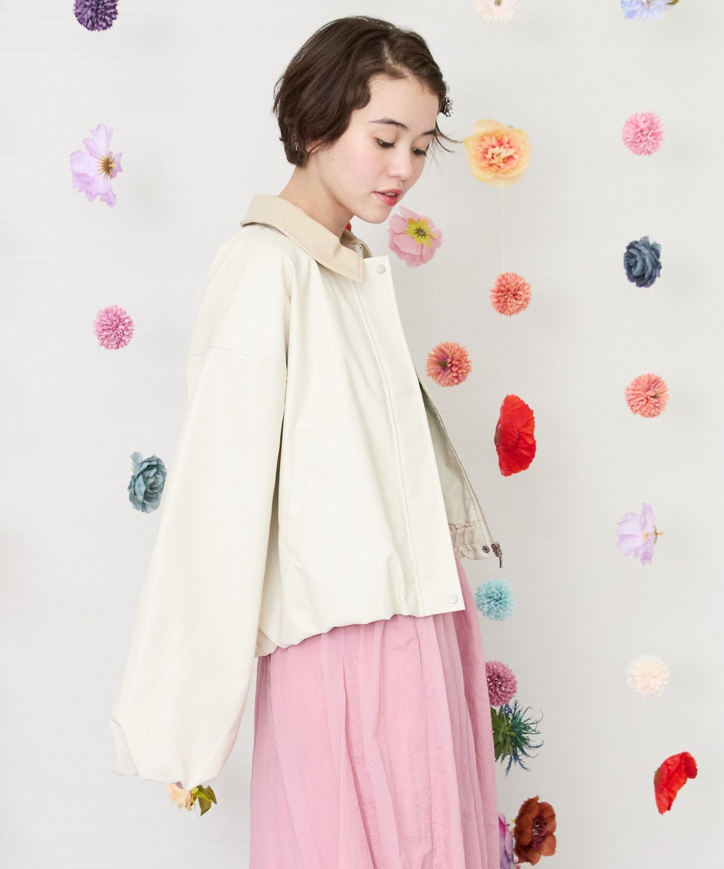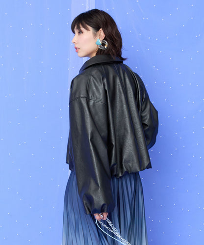 内裾と内袖裾にゴムでギャザーを寄せたバルーンシルエットで、ハードな印象のフェイクレザーも女性らしい雰囲気に。