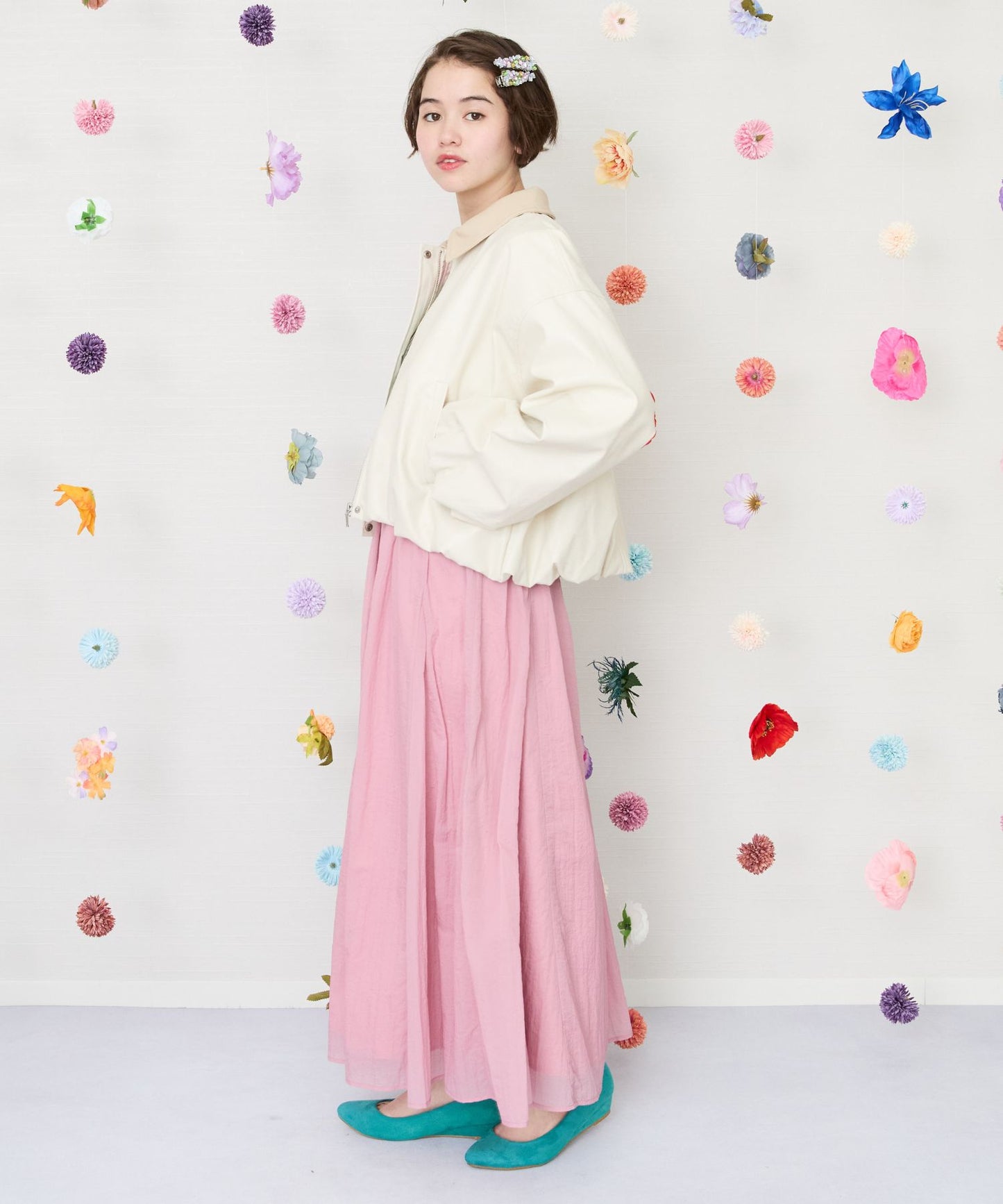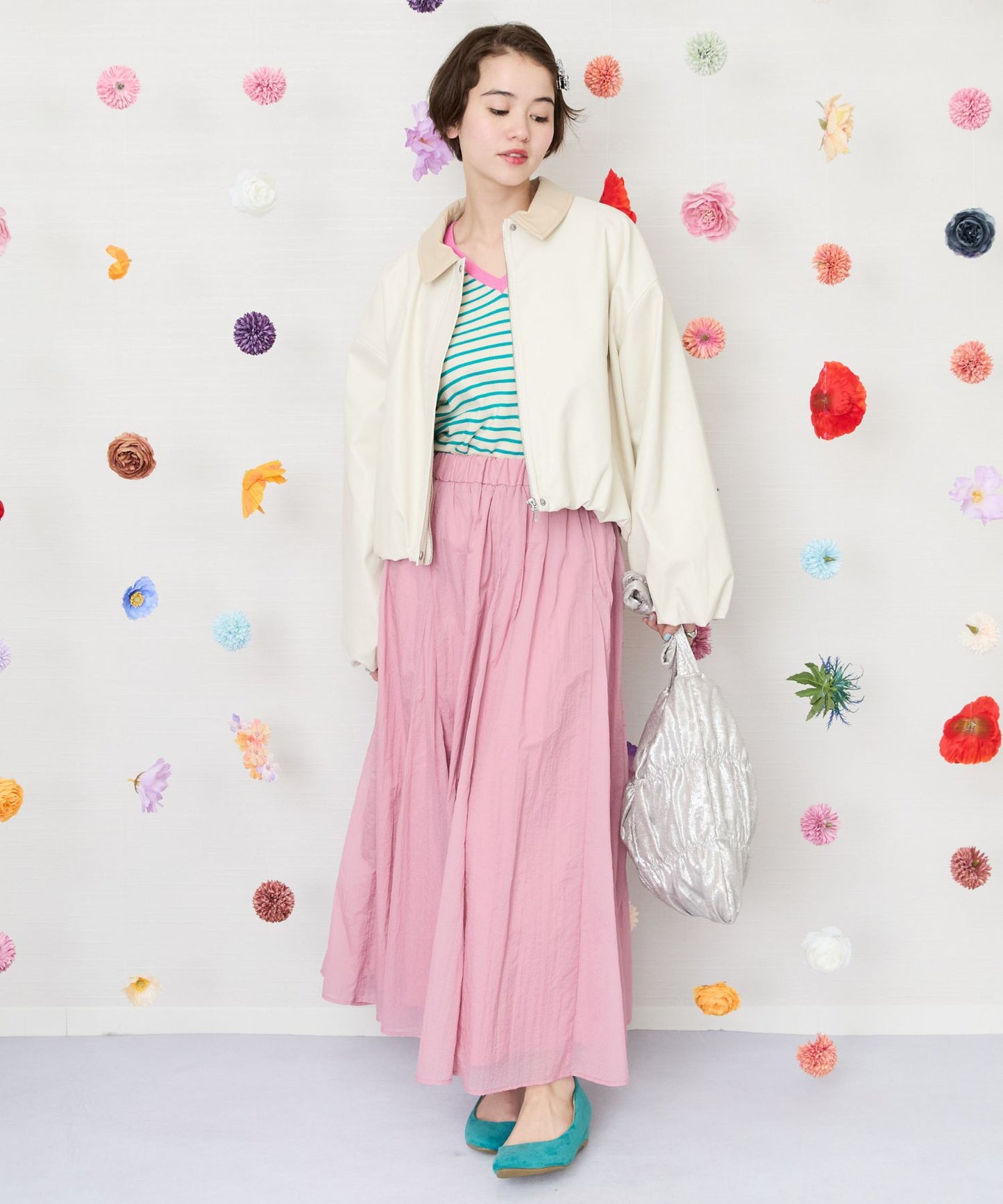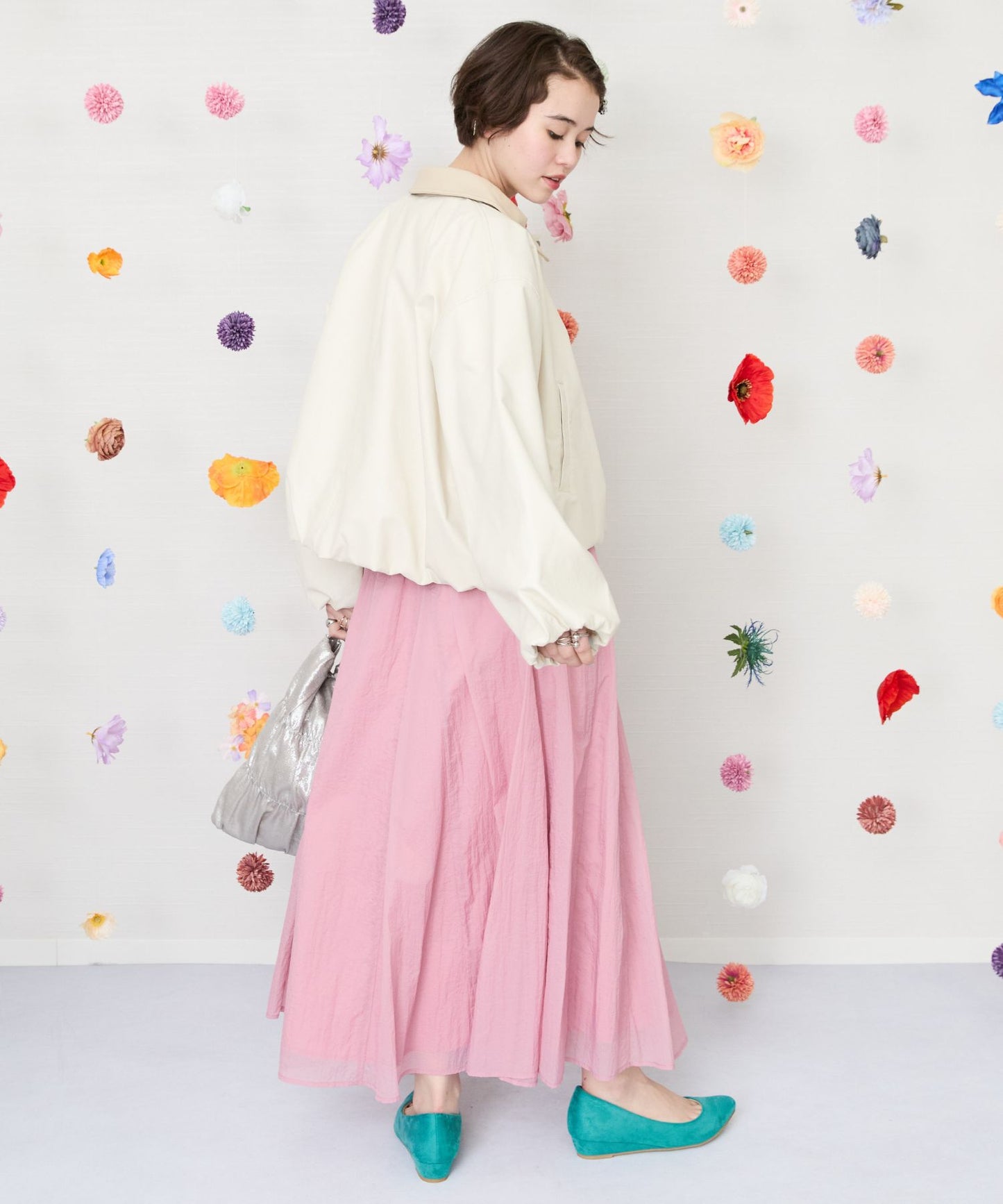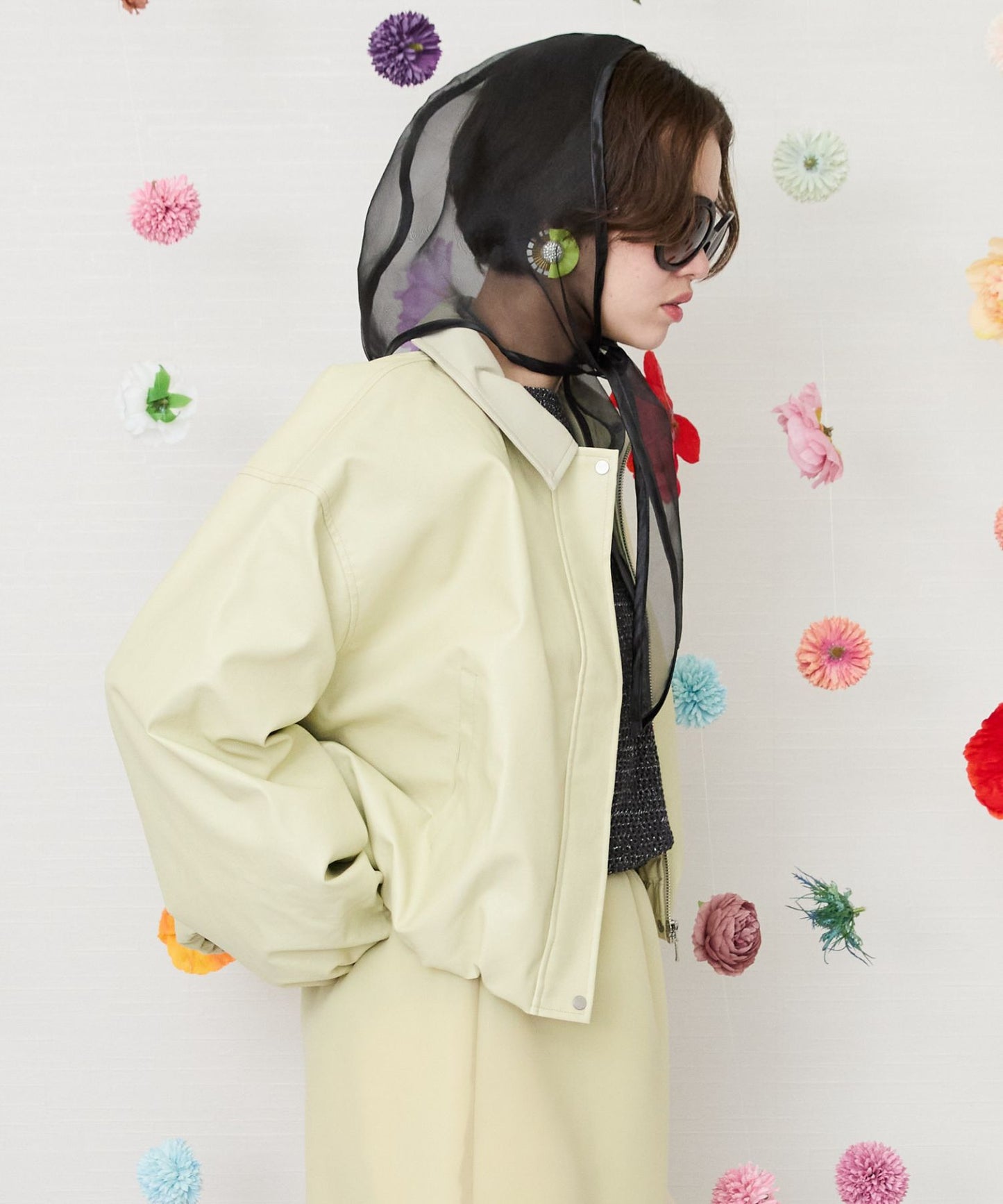 内裾と内袖裾にゴムでギャザーを寄せたバルーンシルエットで、ハードな印象のフェイクレザーも女性らしい雰囲気に。