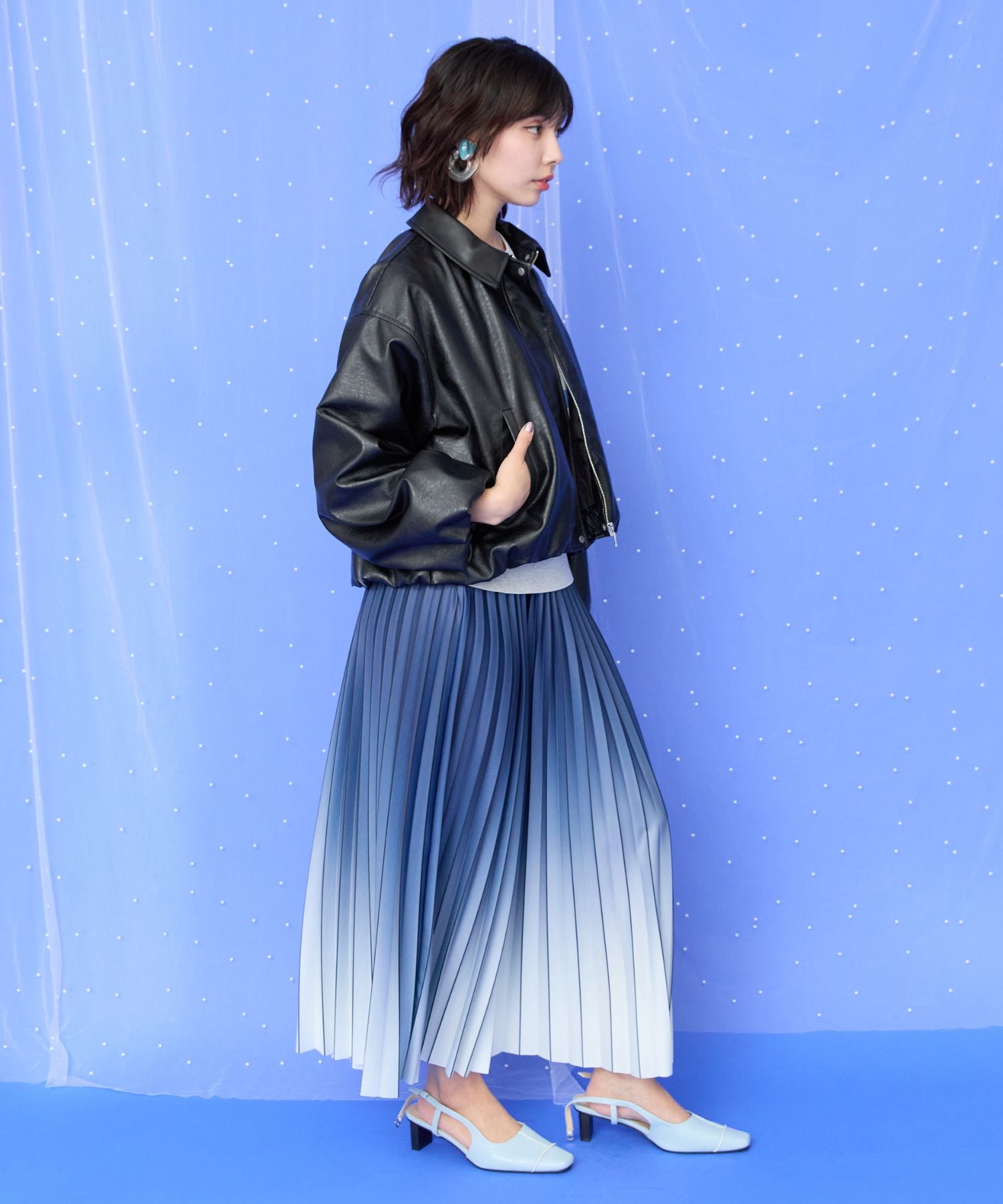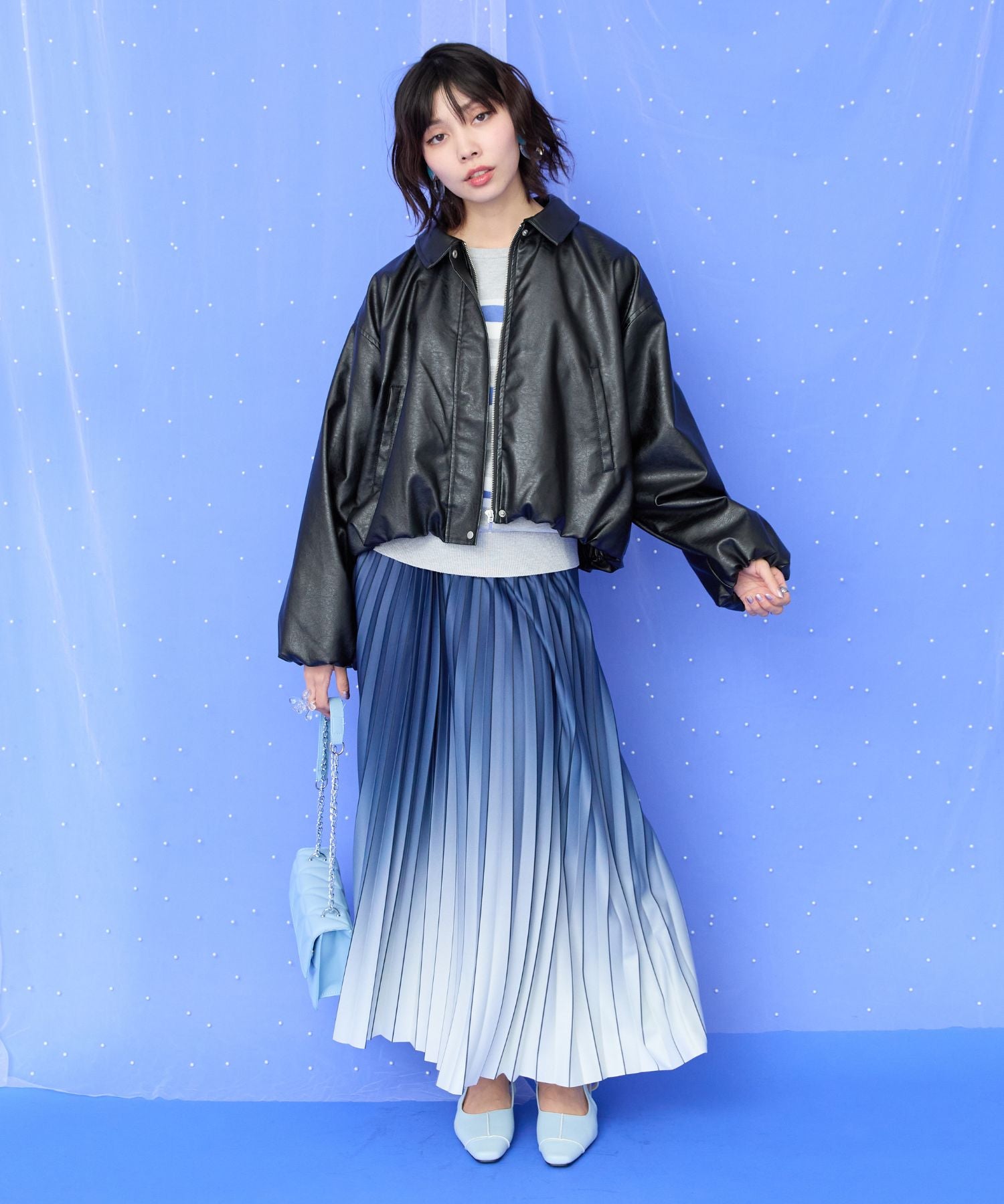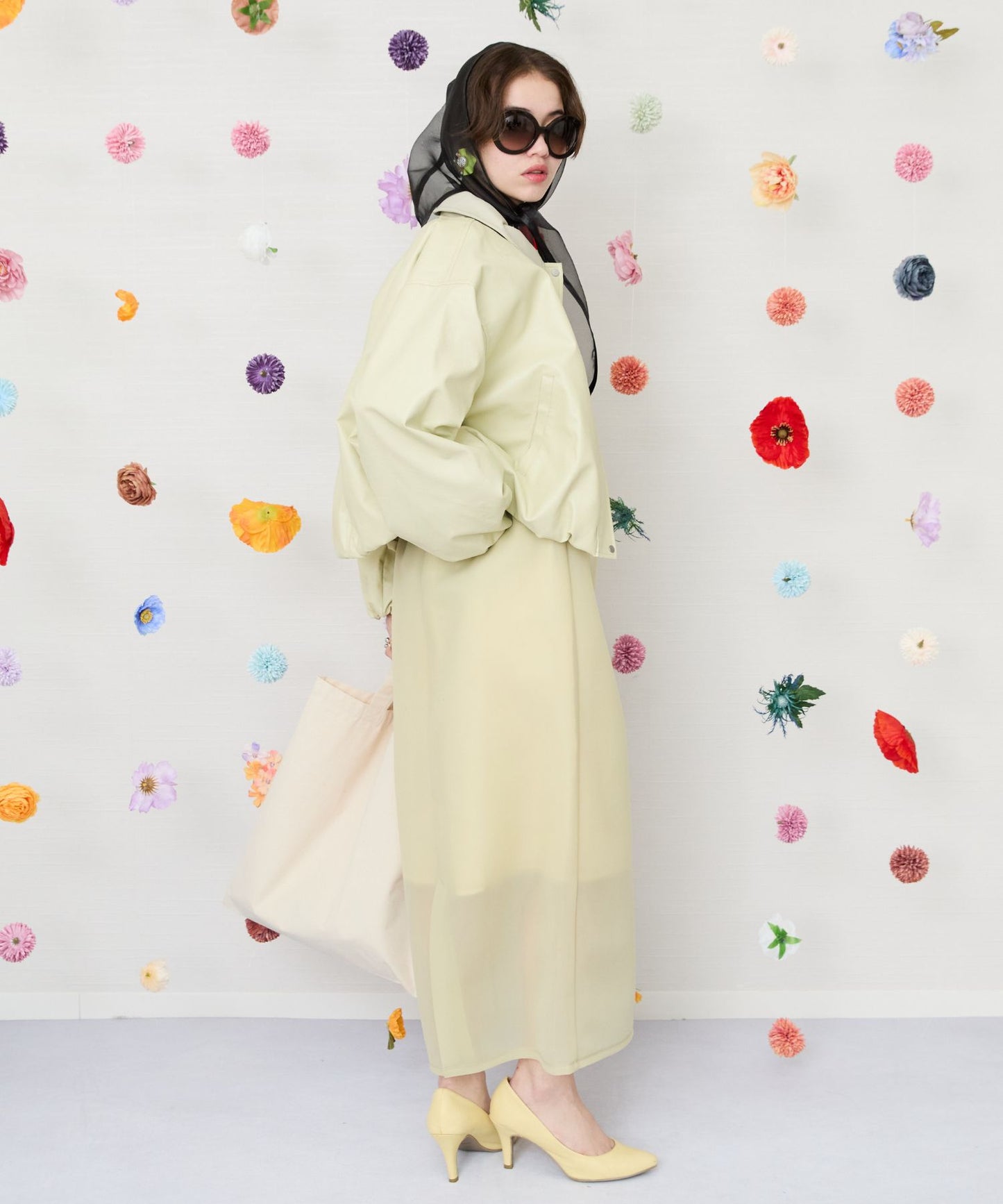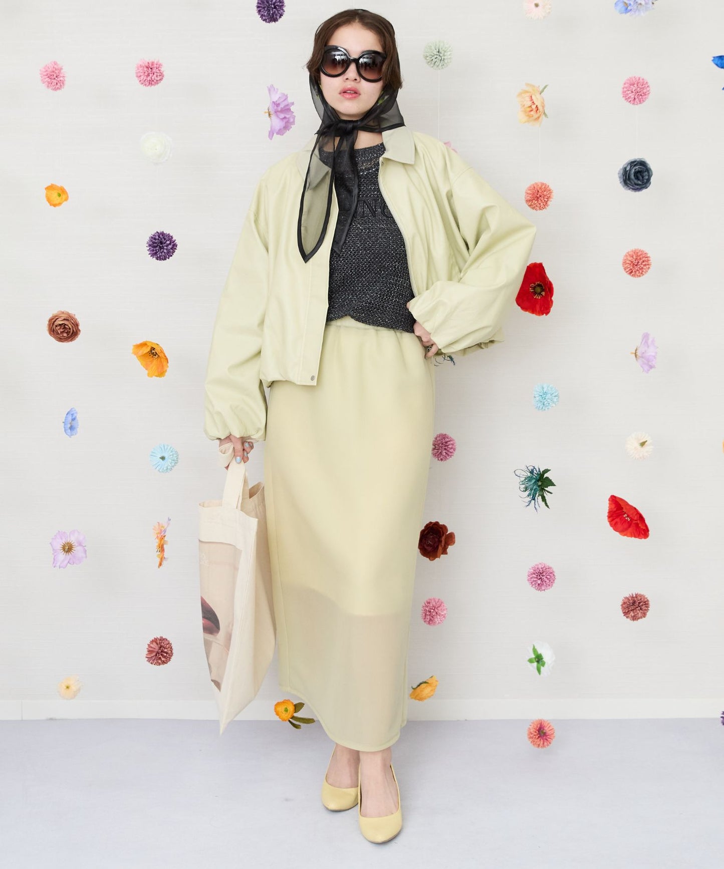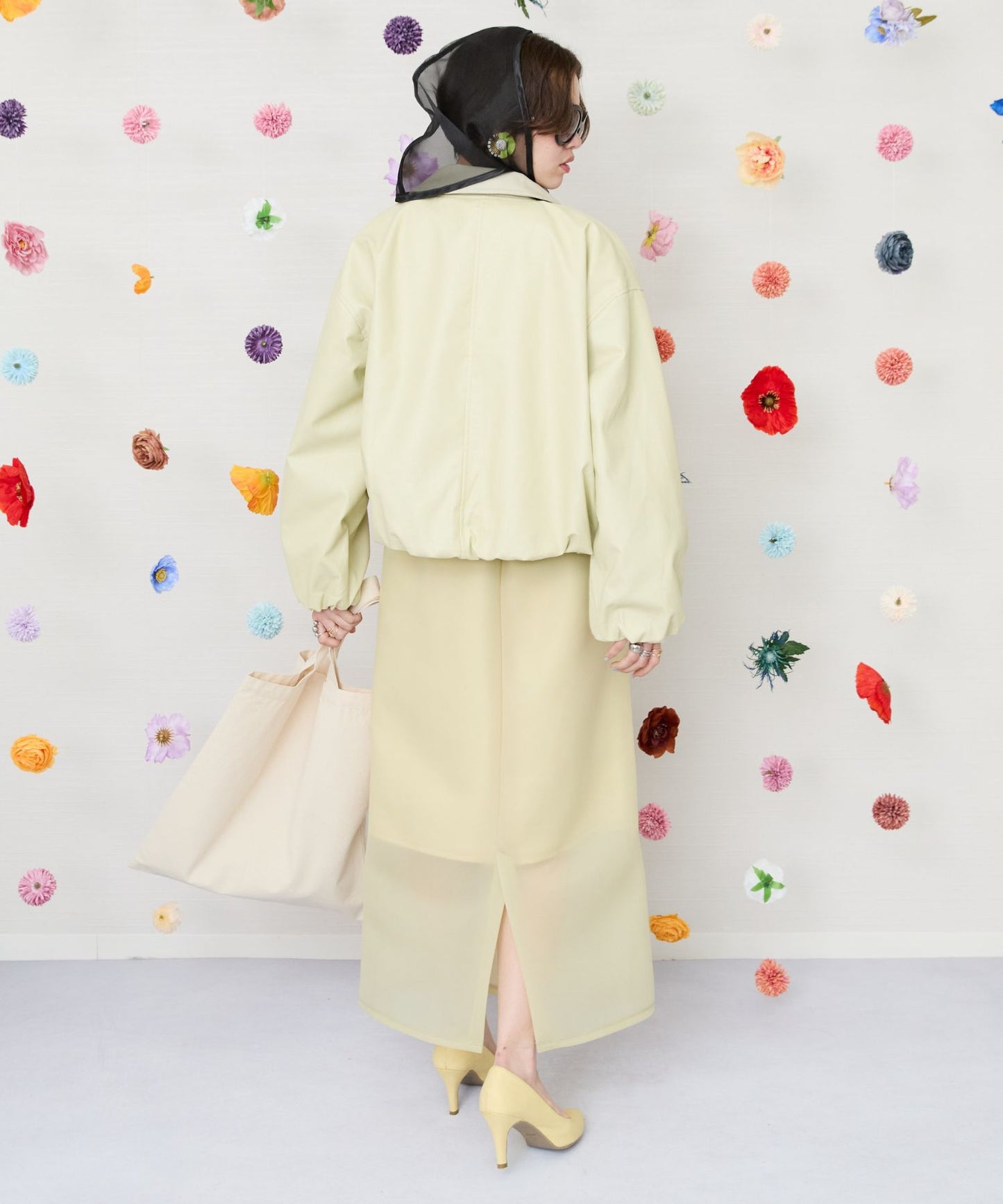 内裾と内袖裾にゴムでギャザーを寄せたバルーンシルエットで、ハードな印象のフェイクレザーも女性らしい雰囲気に。