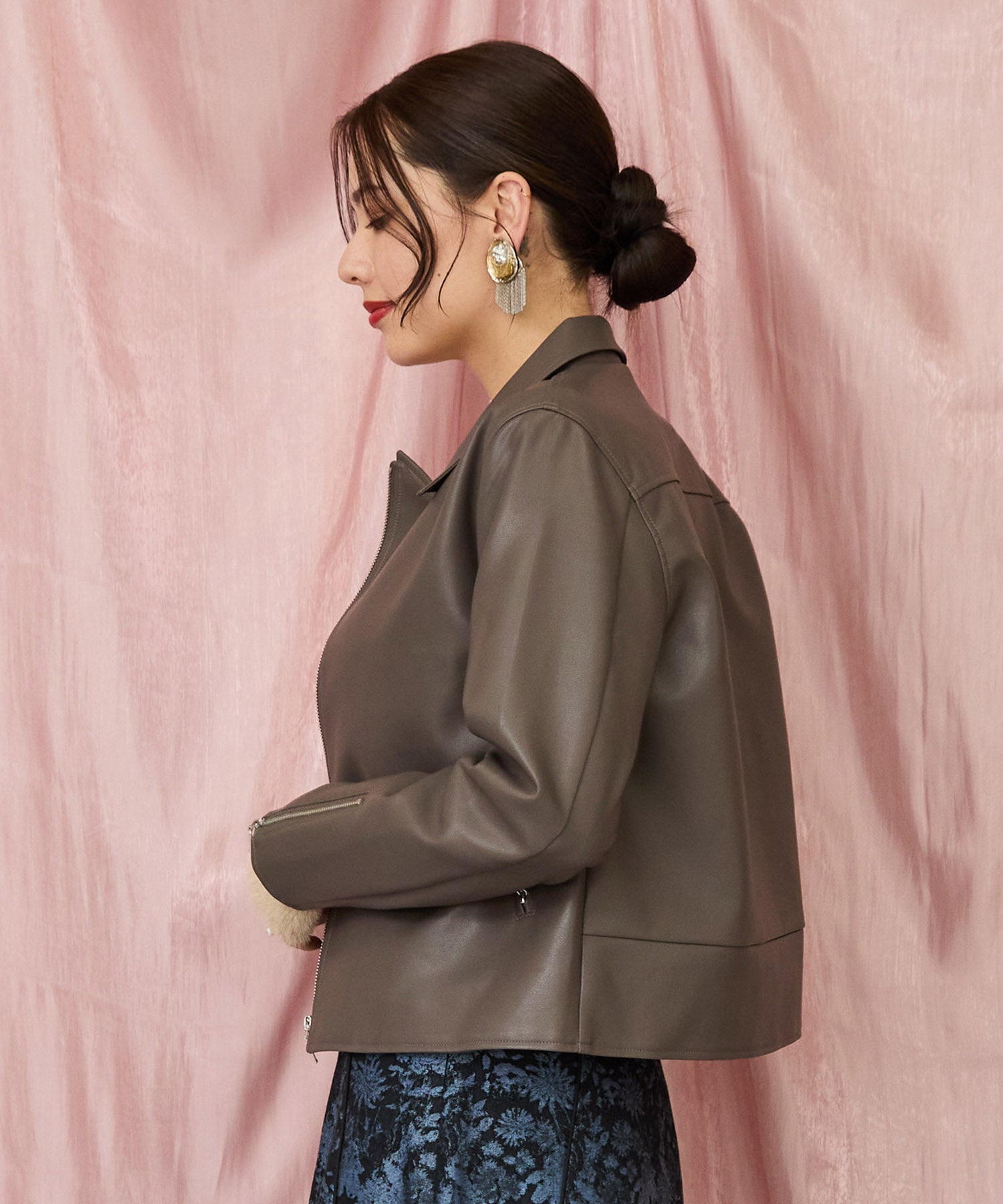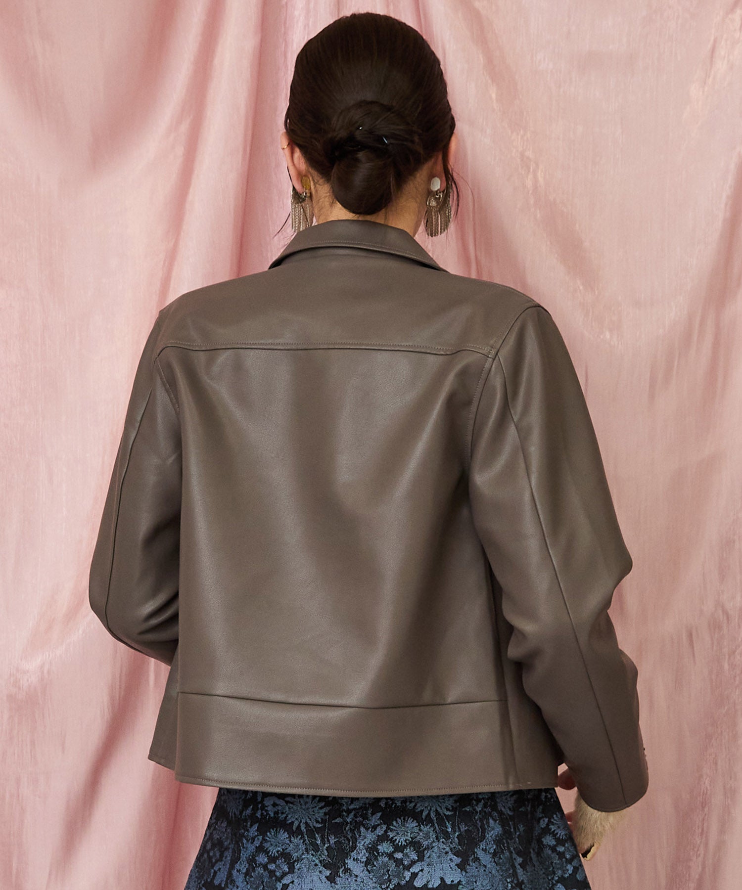落ち着いたブラウングレーのカラーが上品な印象を与えるフェイクレザージャケット。