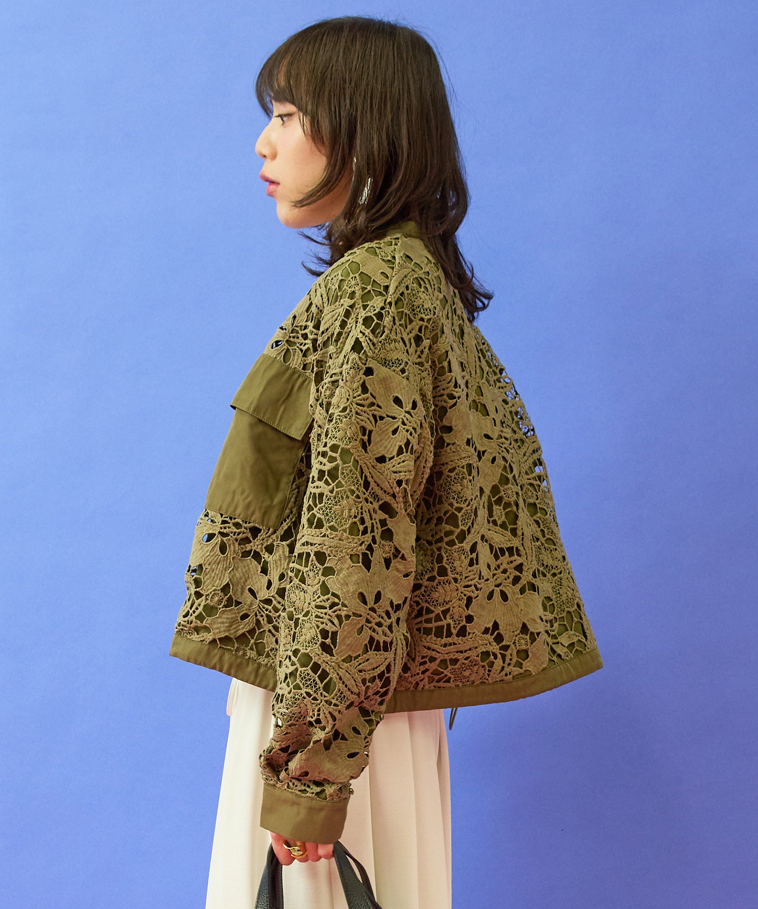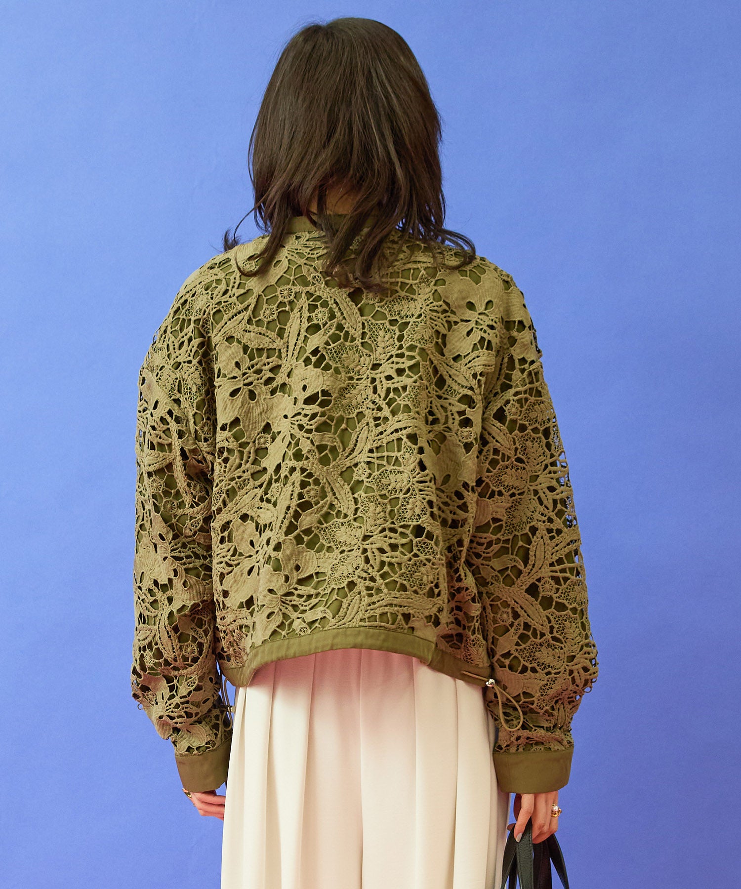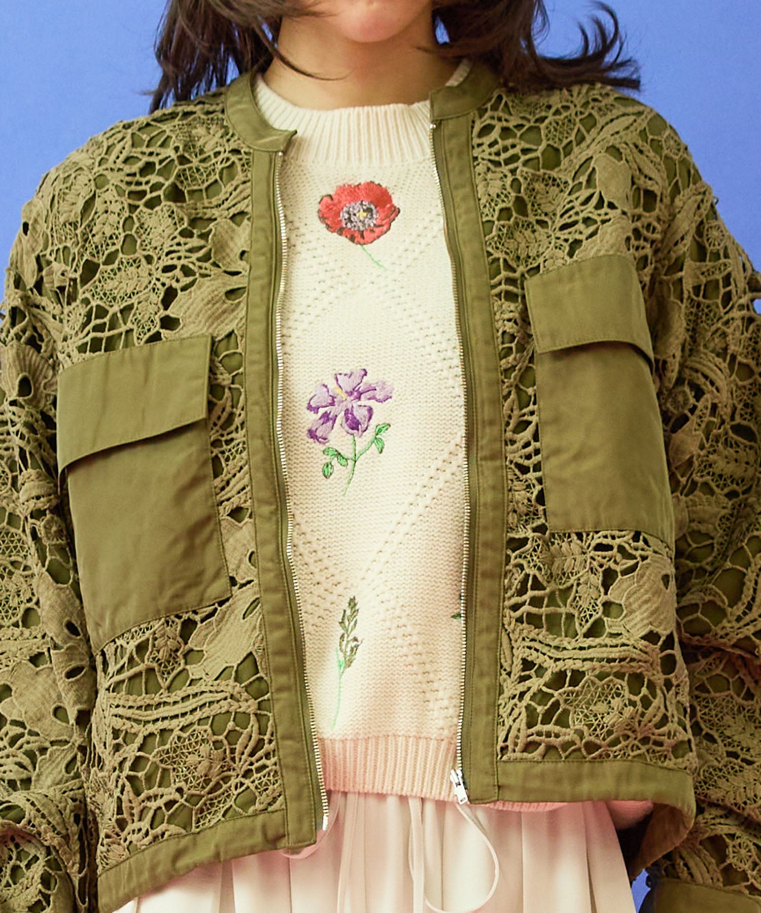 ボタニカルモチーフのレースが、軽やかで上品な表情を演出するブルゾン。