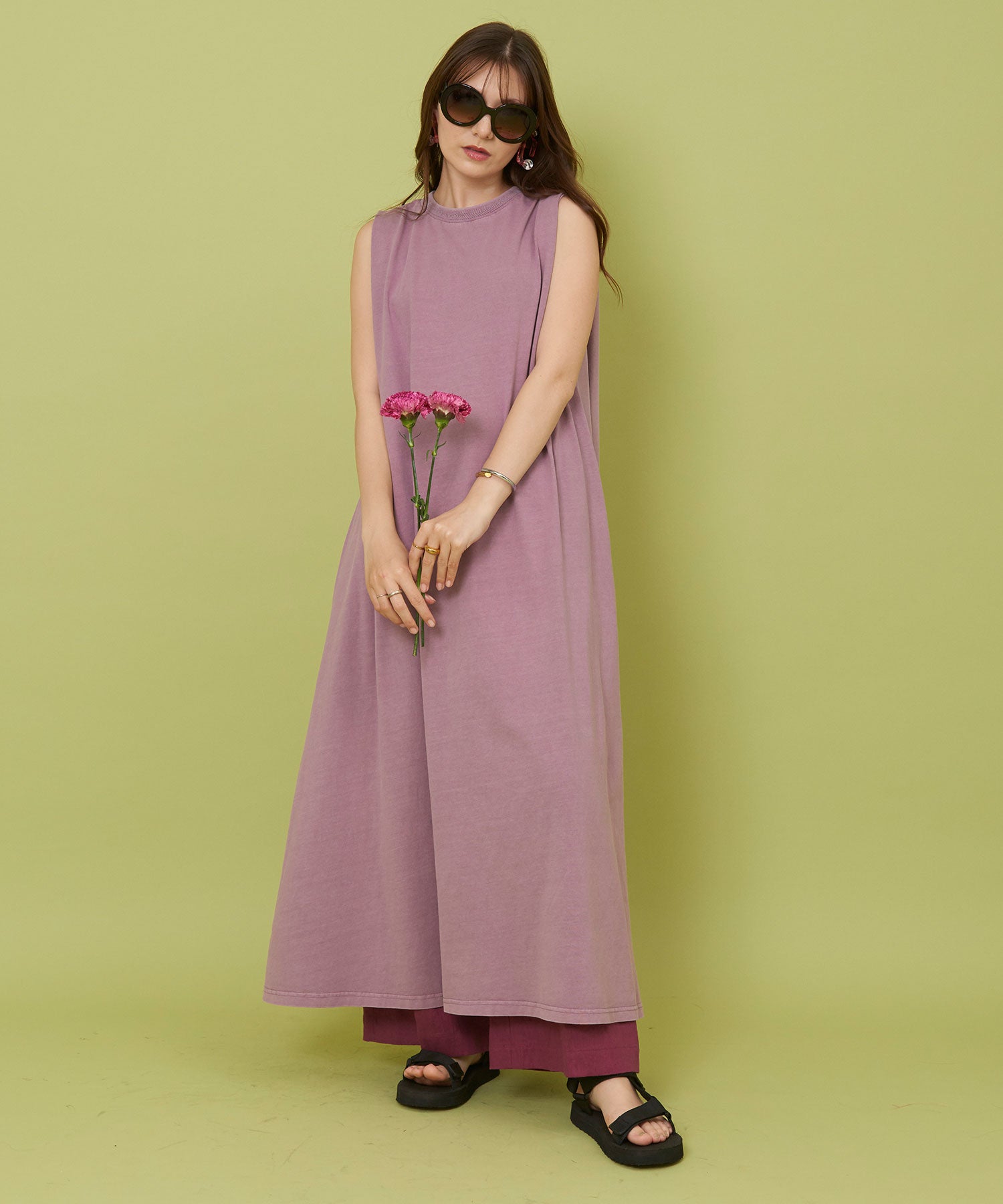 くすみカラーが洒落た印象のノースリーブマキシワンピース。