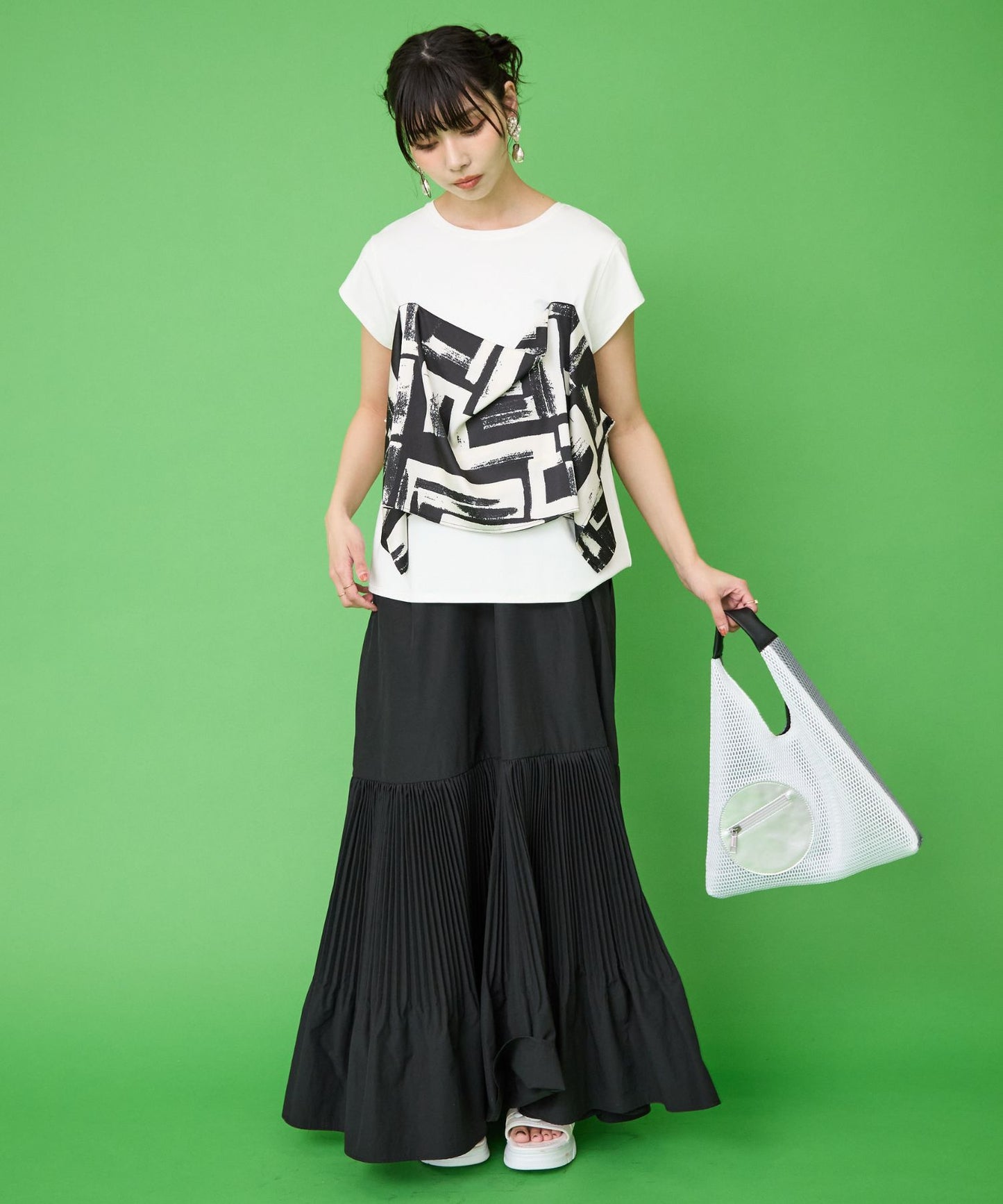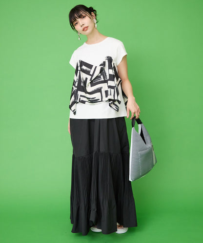 ワンティアードがデザインポイントになることで目線が散り、お腹周りや腰周りのカバーもアシスト。
