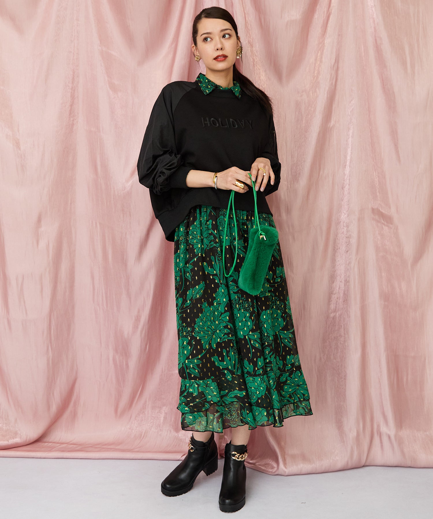 ブラックベースに深みのあるグリーンの植物柄が映え、大人の秋冬スタイルにぴったり。