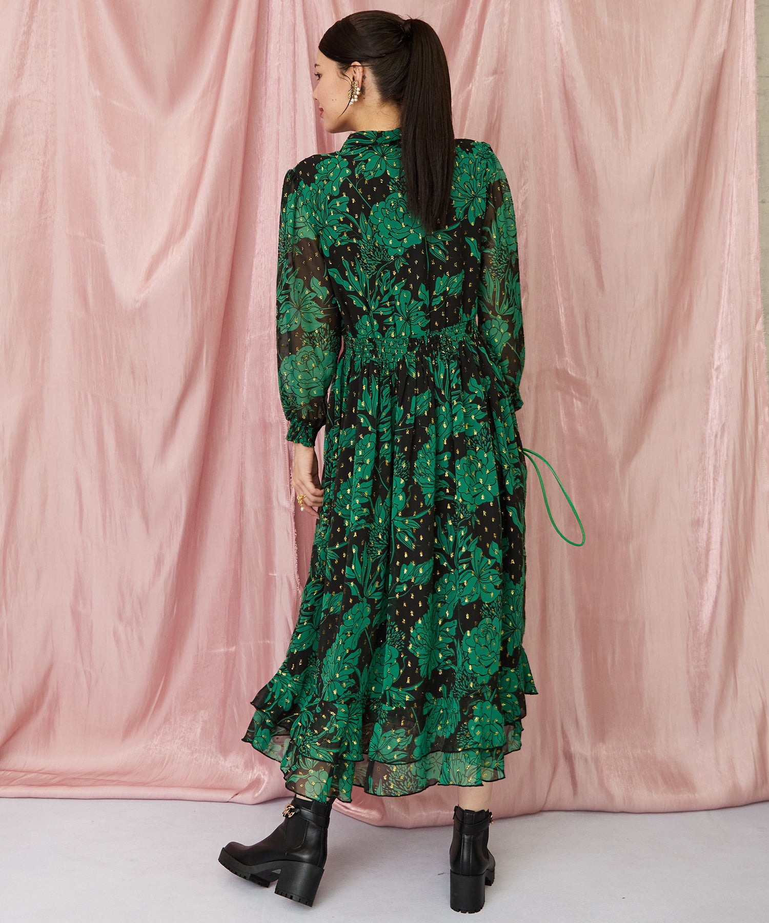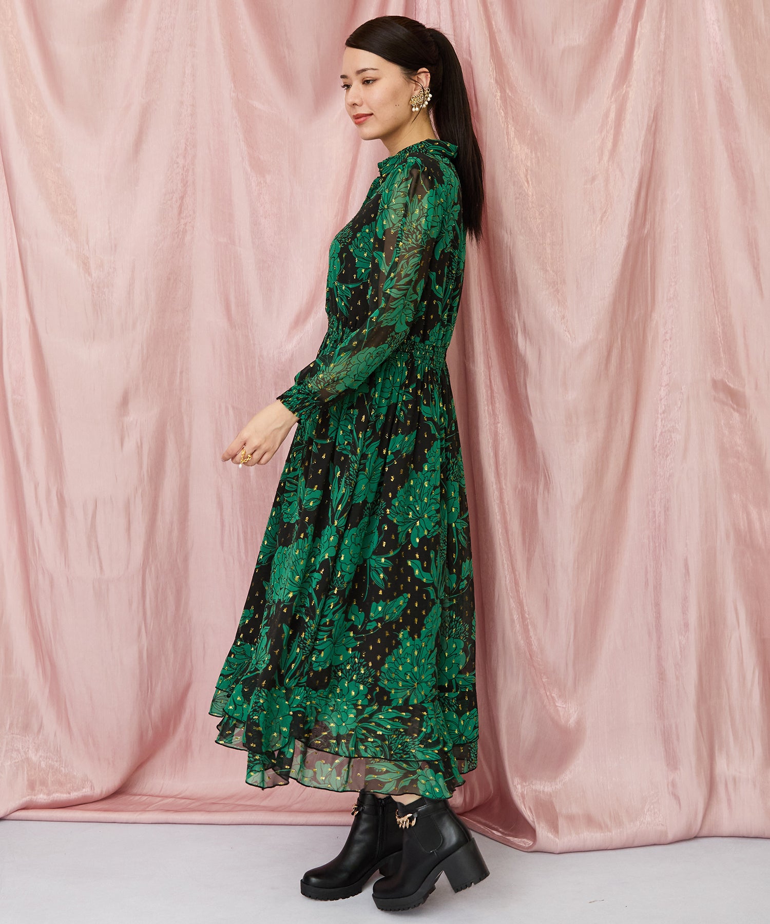 軽やかな透け感が上品な、ボタニカル柄の長袖ワンピース。