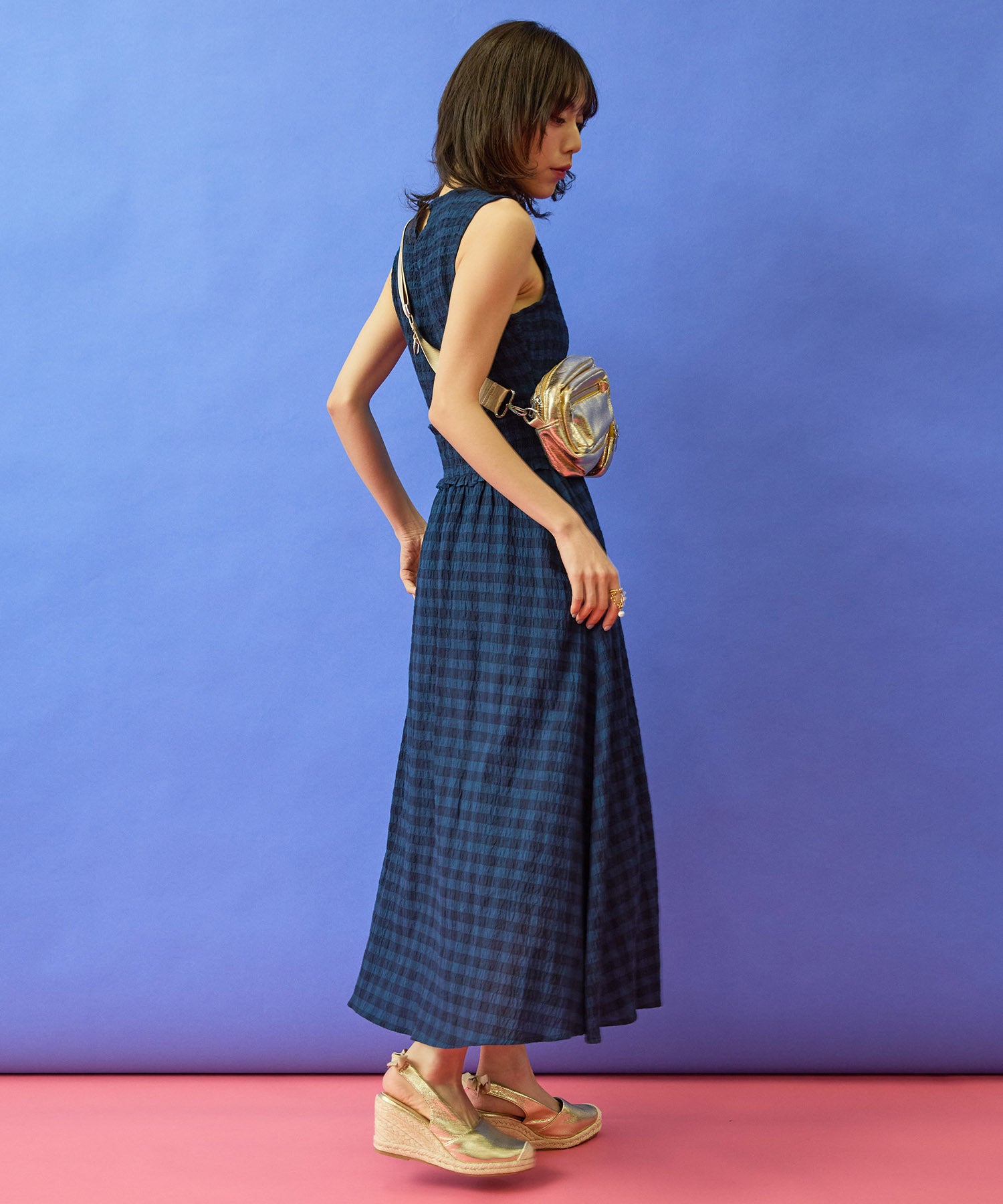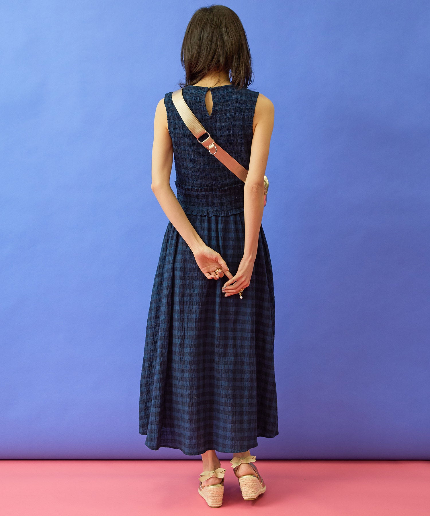 ダークトーンのギンガムチェックが、落ち着いた華やかさを添えるワンピース。