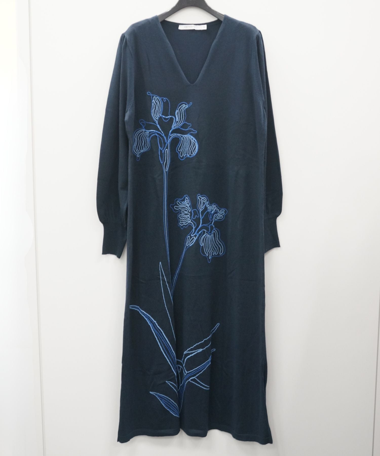 【優美に咲く、アートフラワーエンブロイダリーニットワンピース】