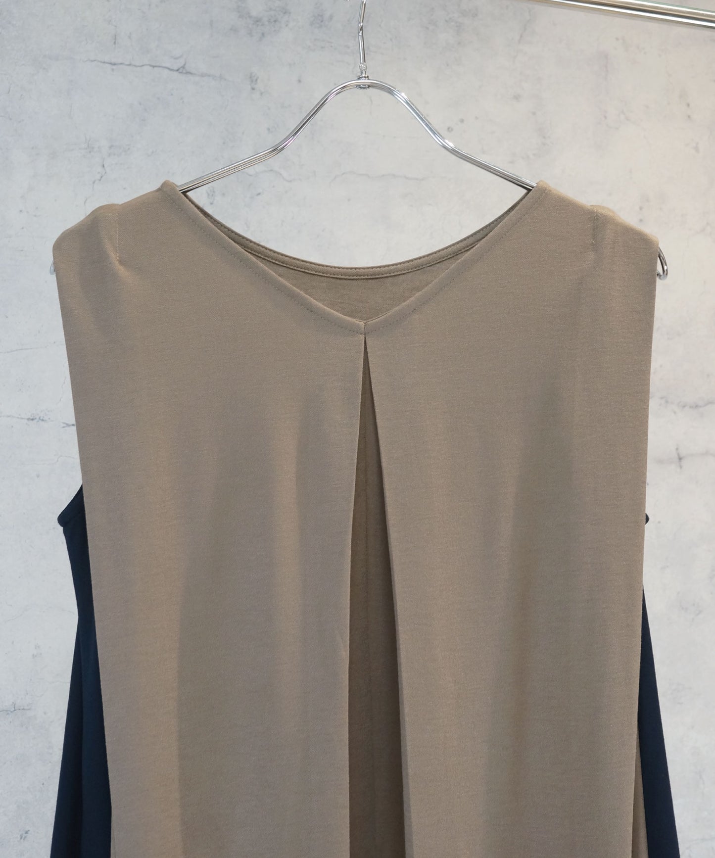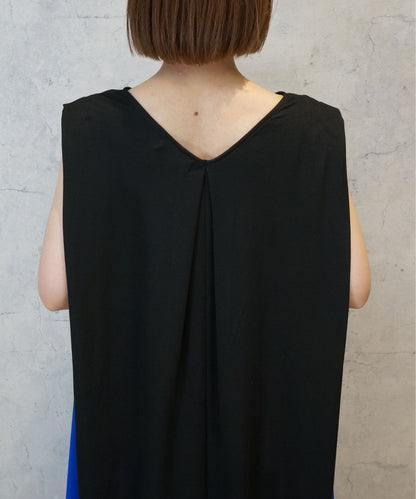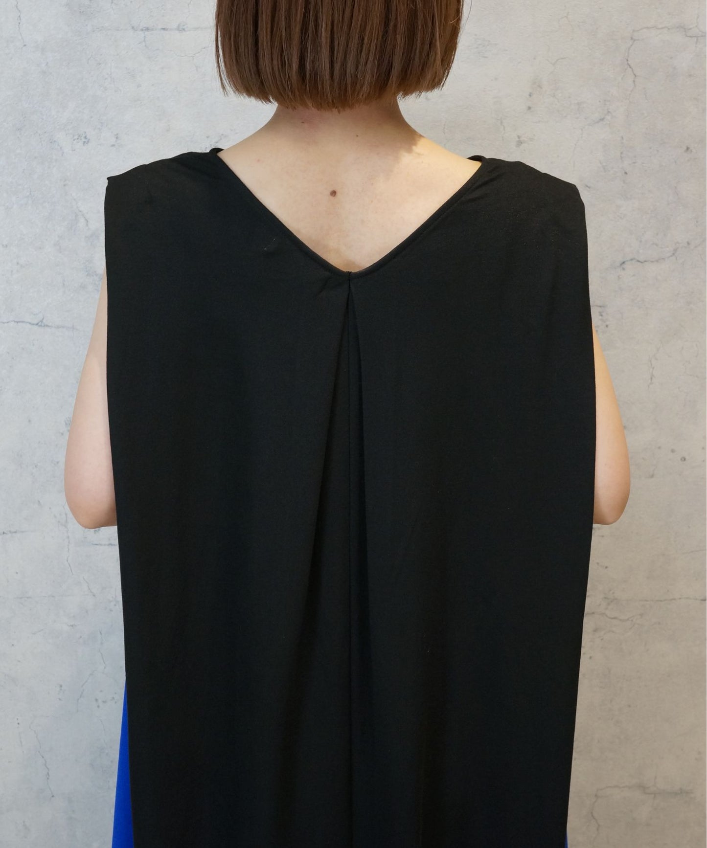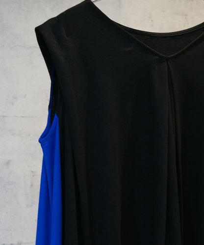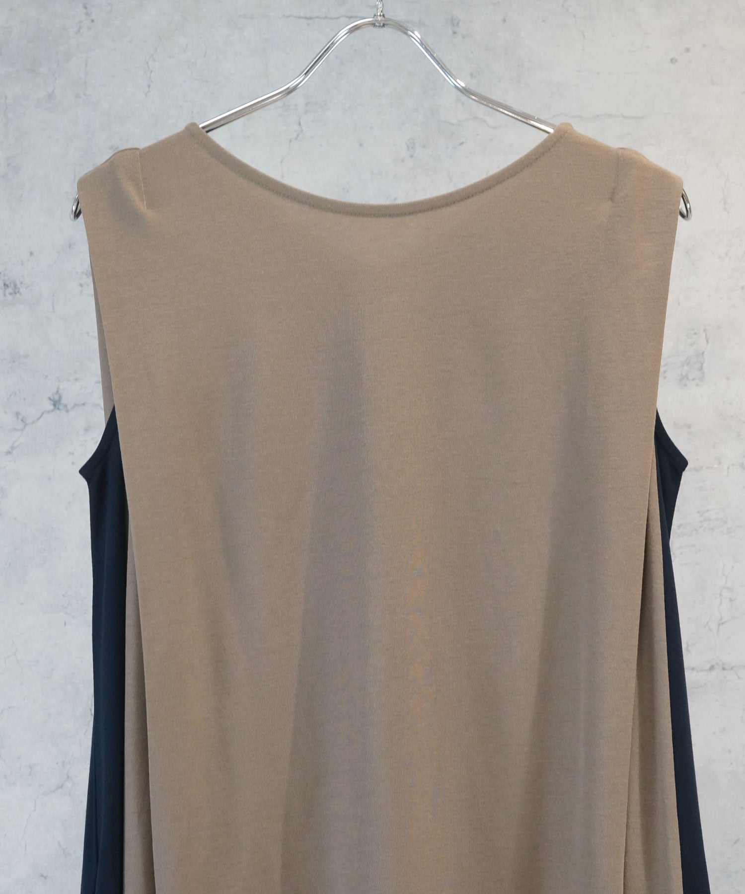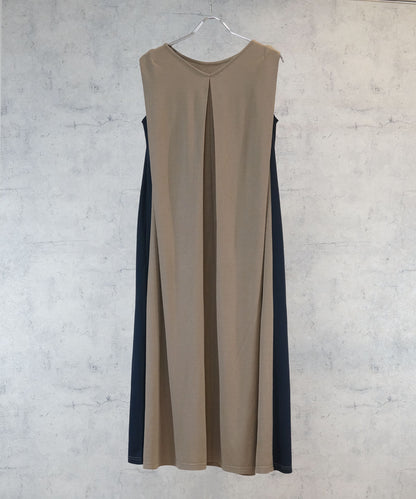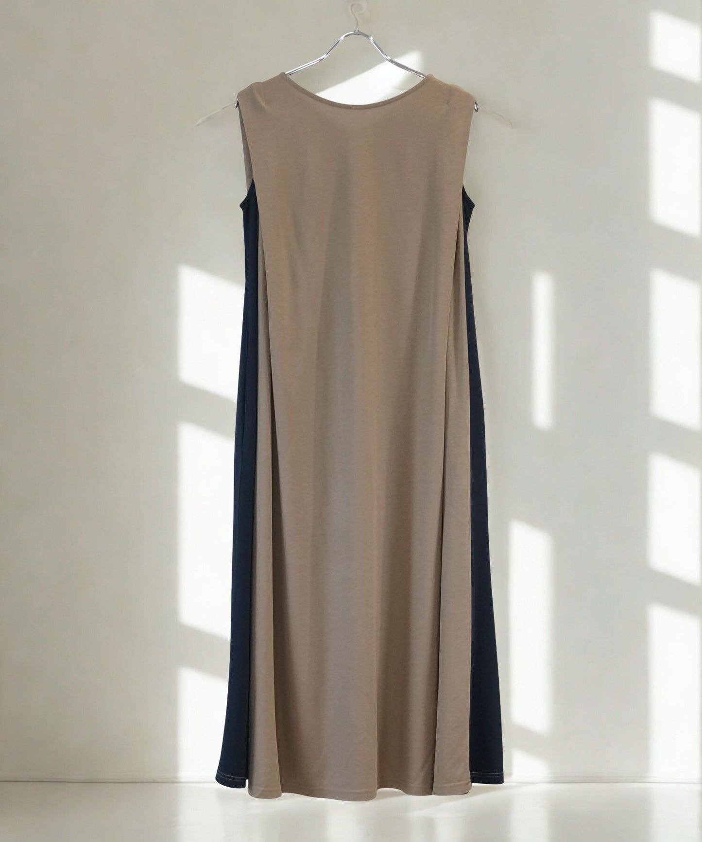 バイカラーデザインが目を引く、ノースリーブのフレアワンピース。