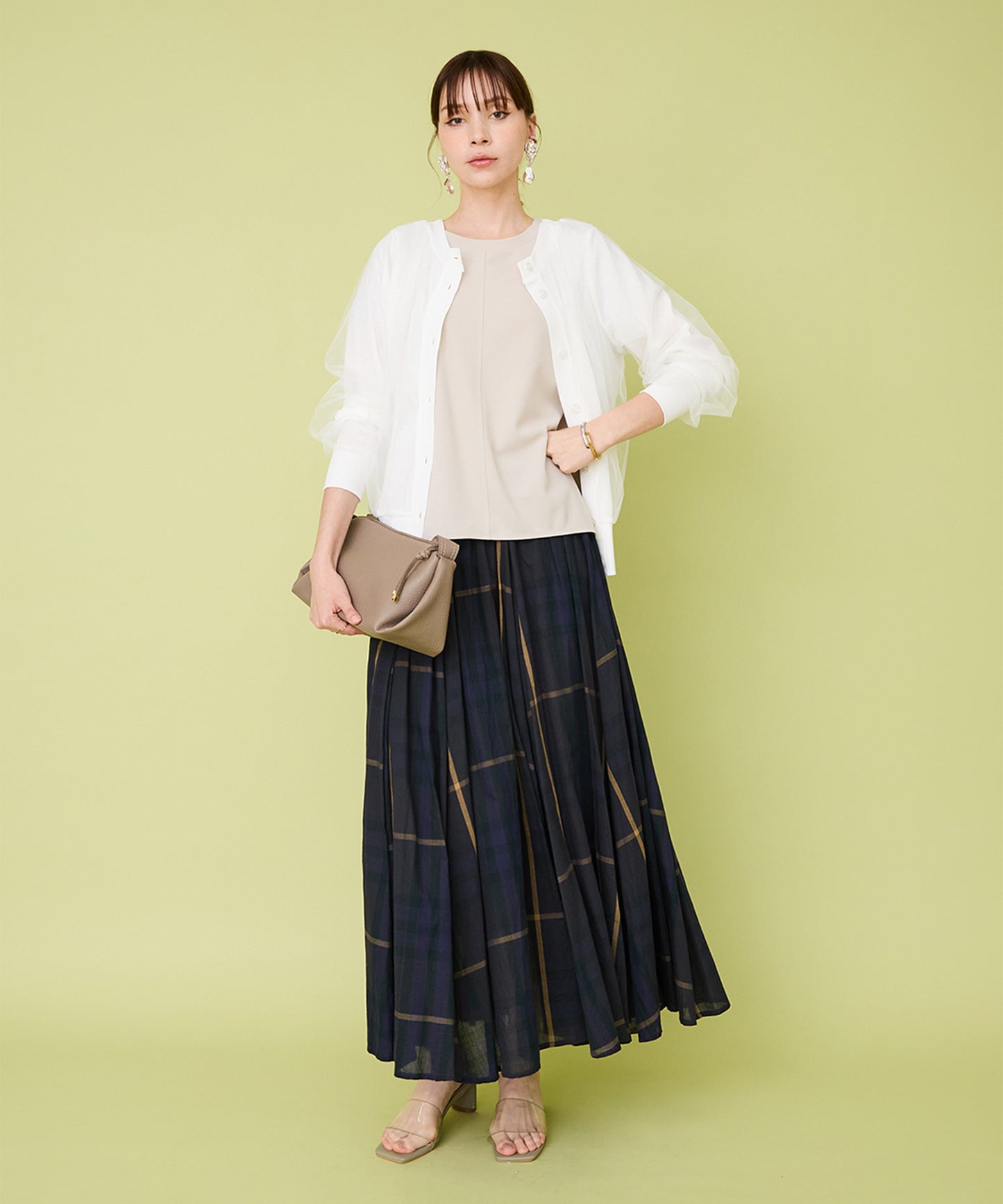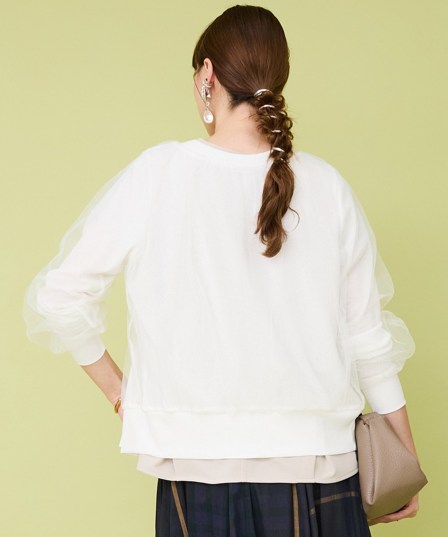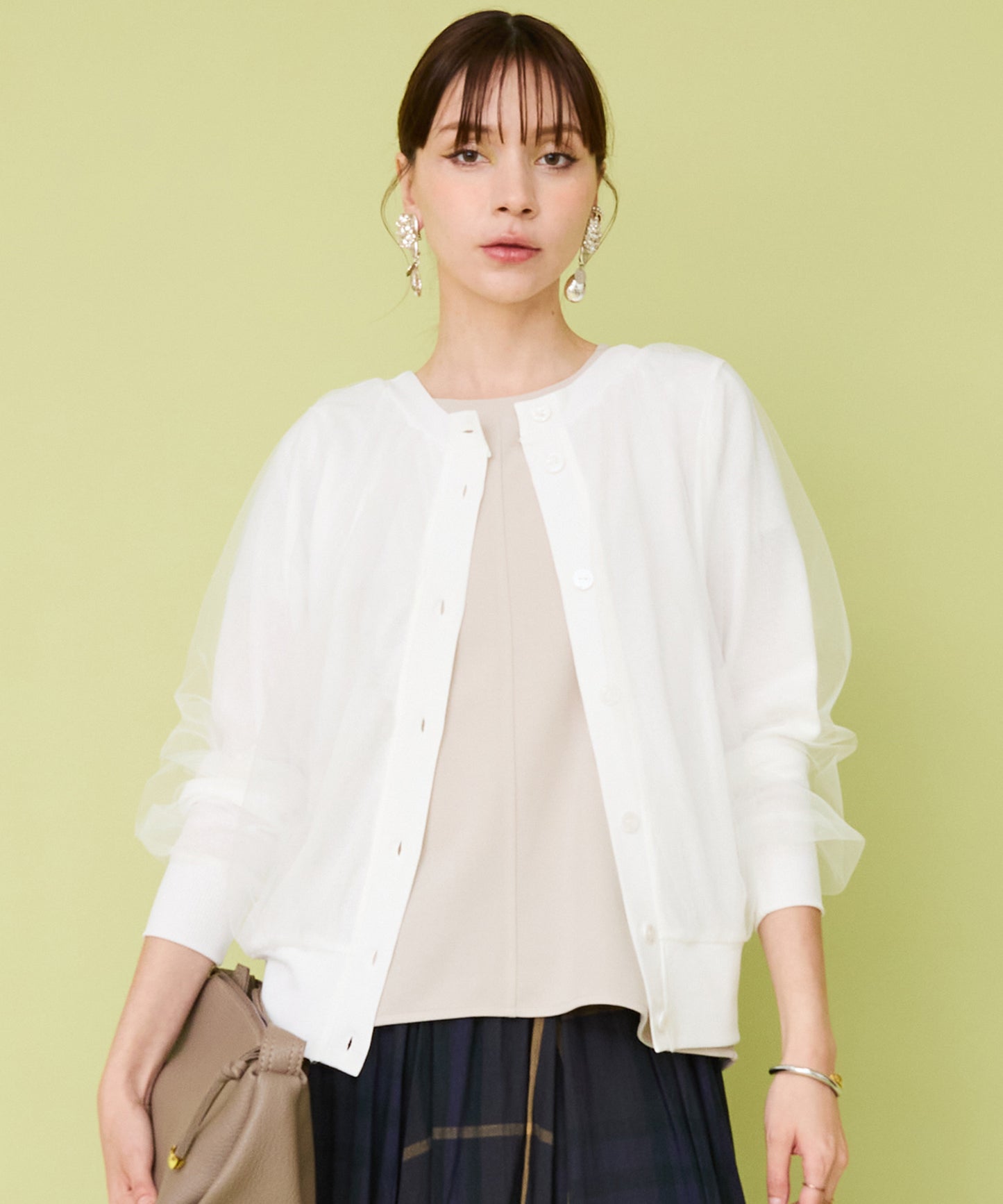 チュールレイヤードが目を惹く女性らしいカーディガン