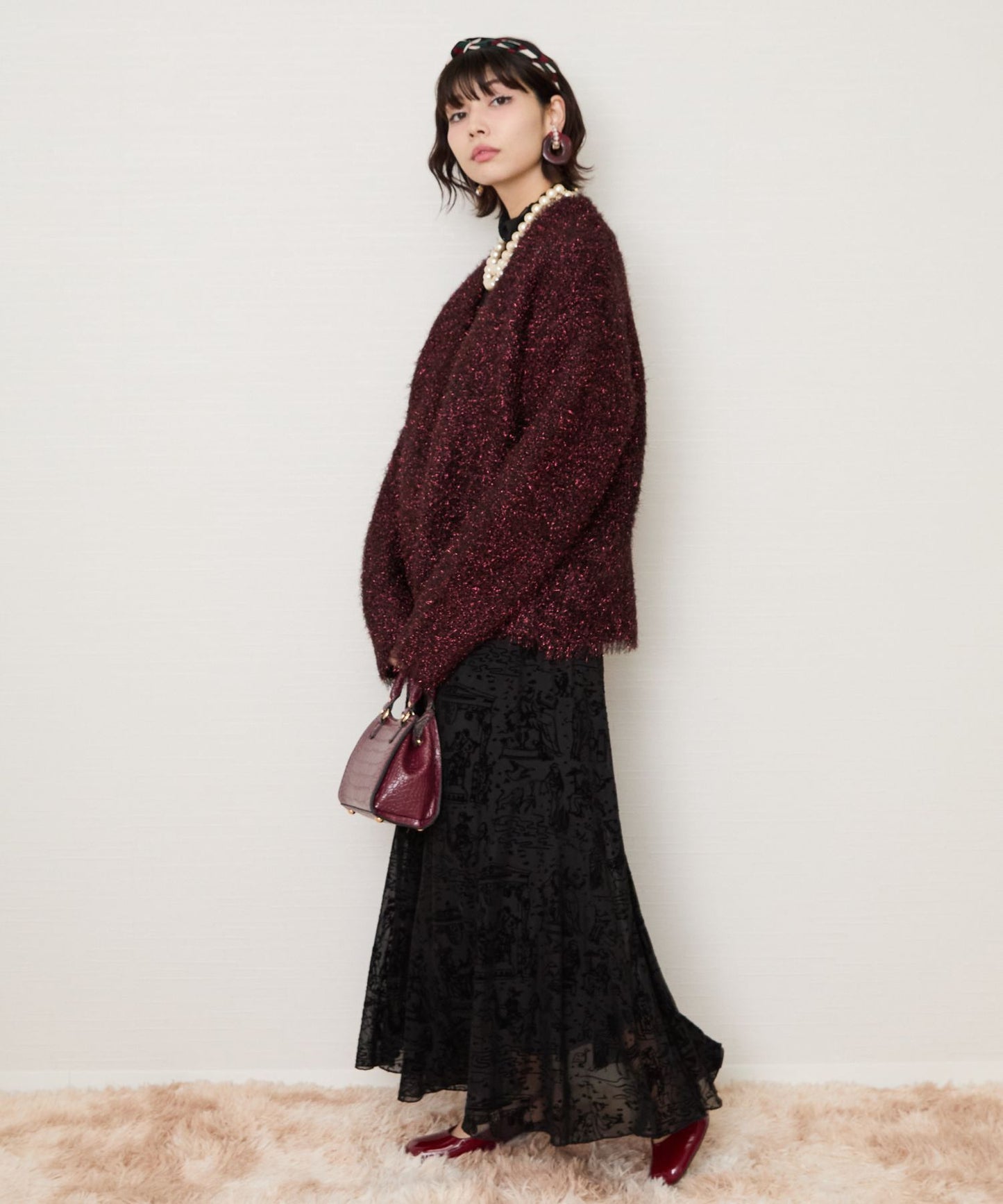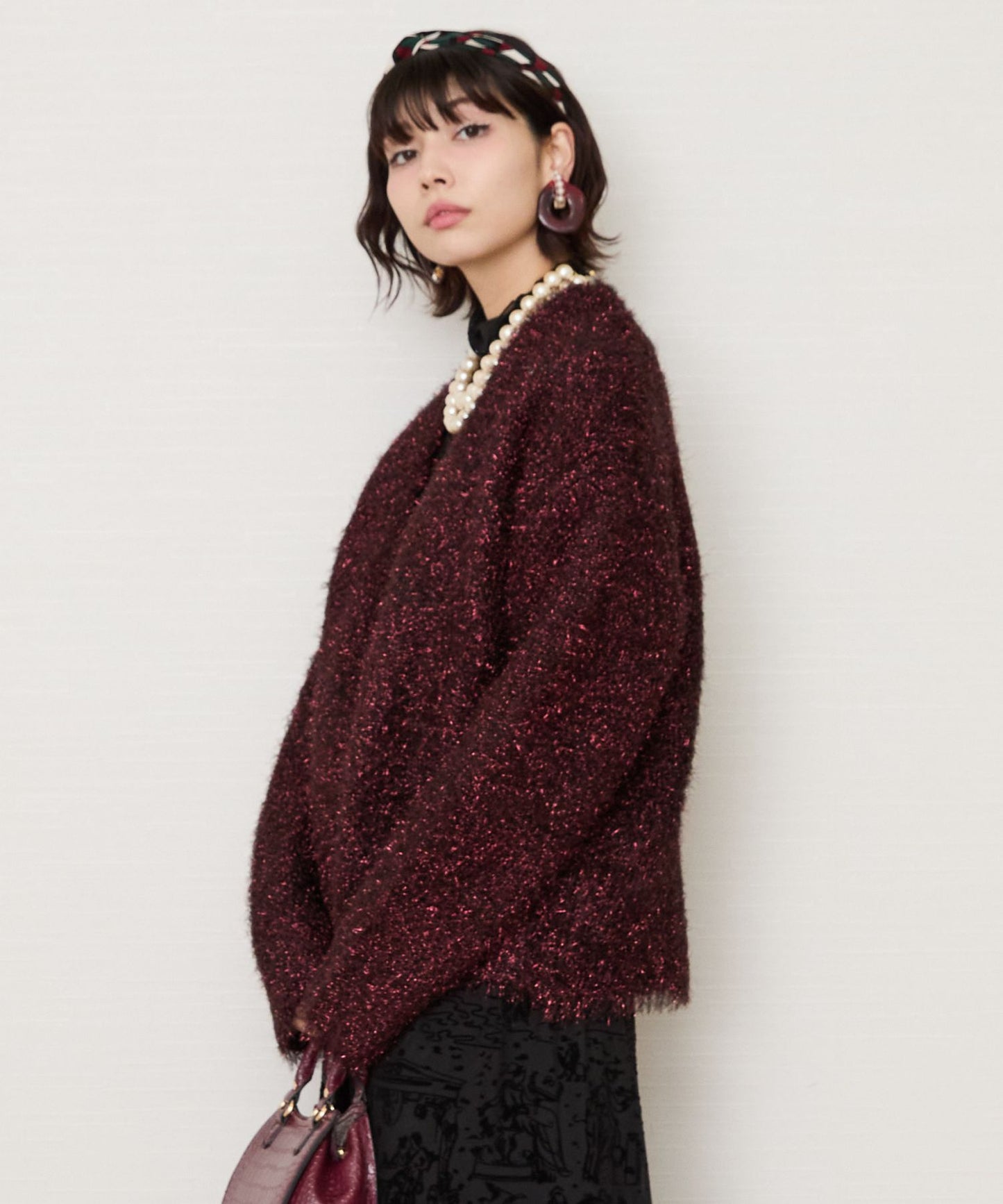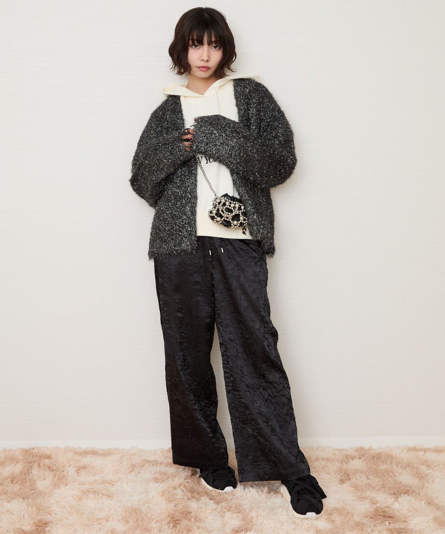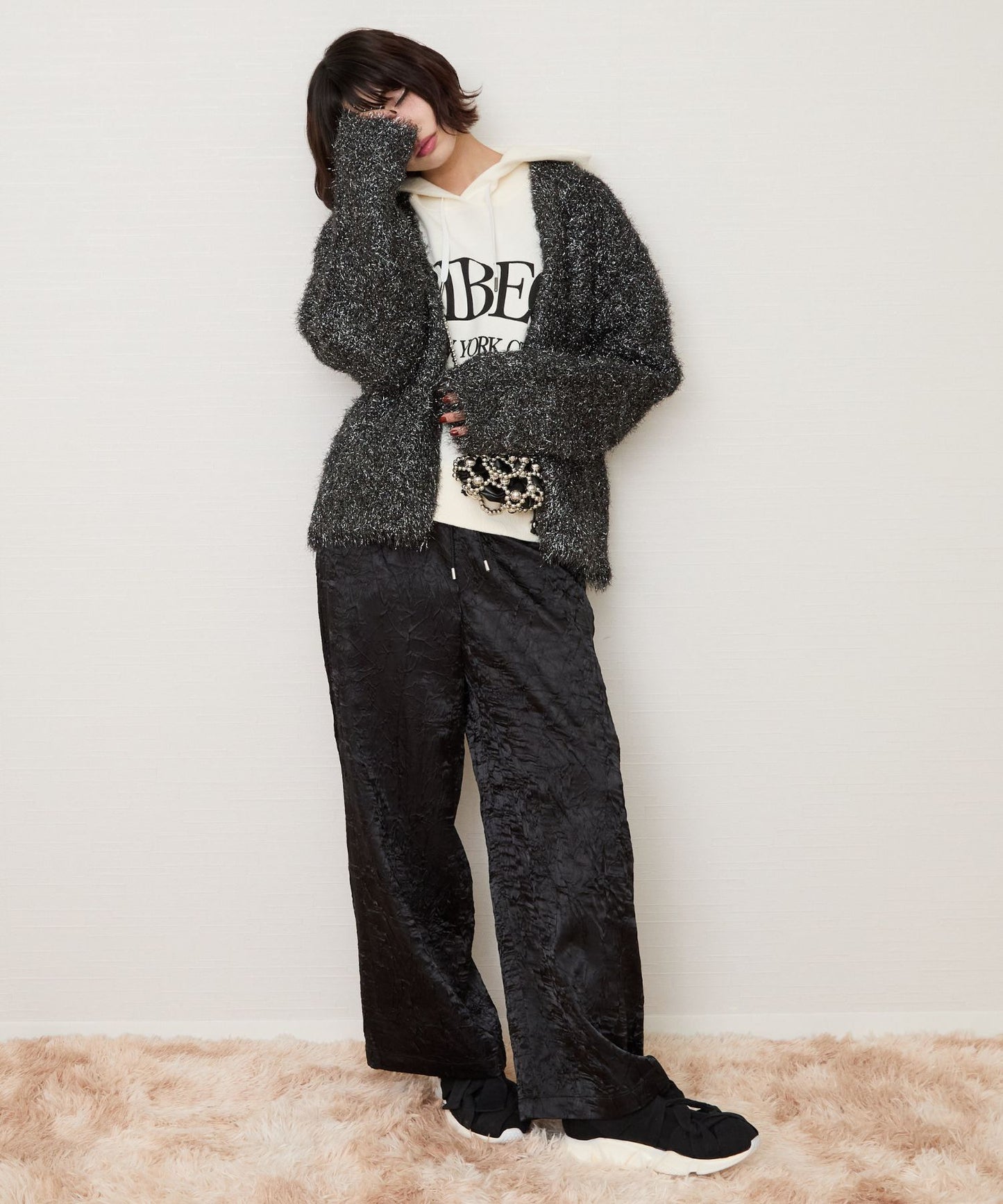 ゆったりとしたシルエットがリラックス感を演出しつつも、きらきらと動きのある素材がエレガントなアクセントに。