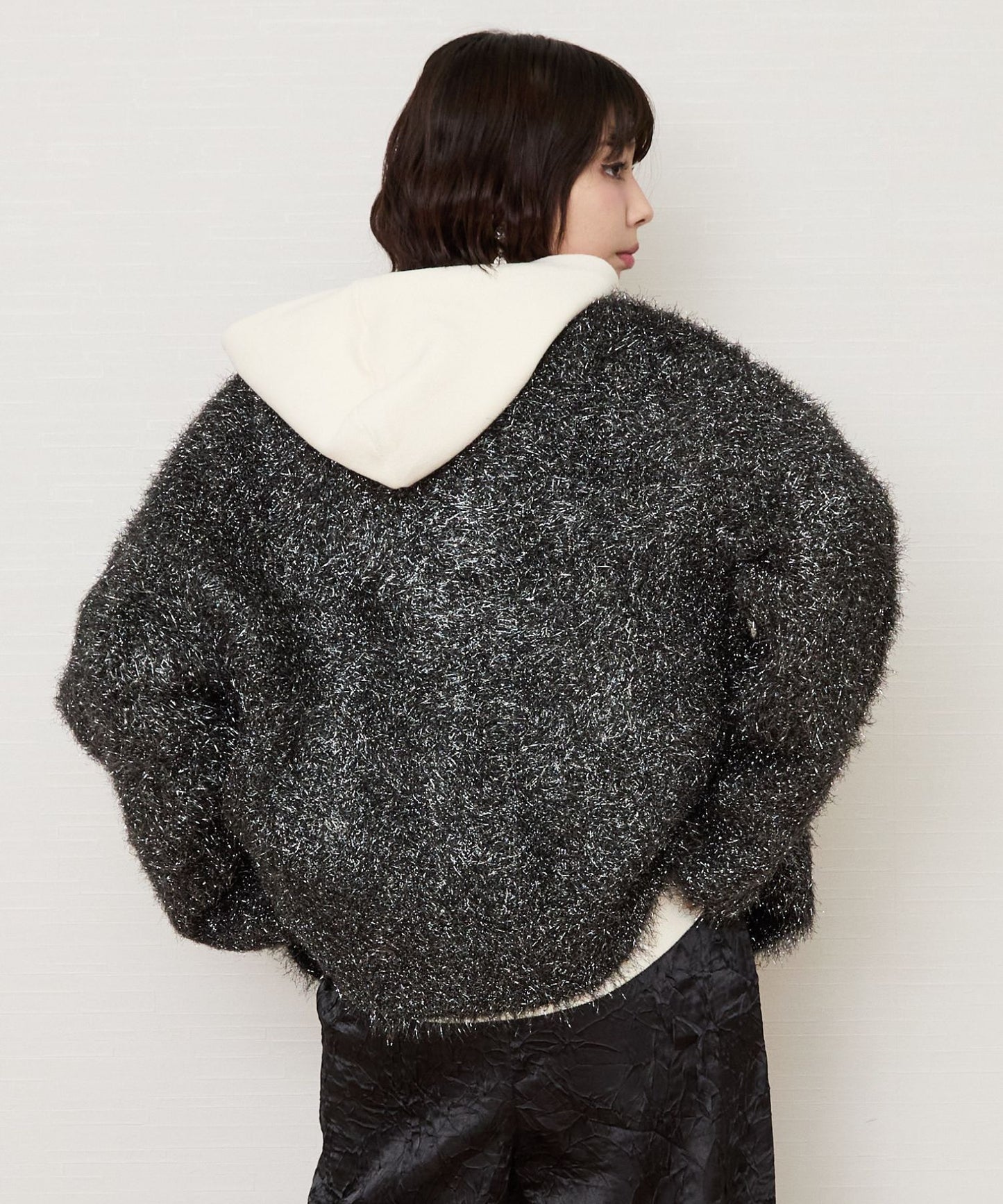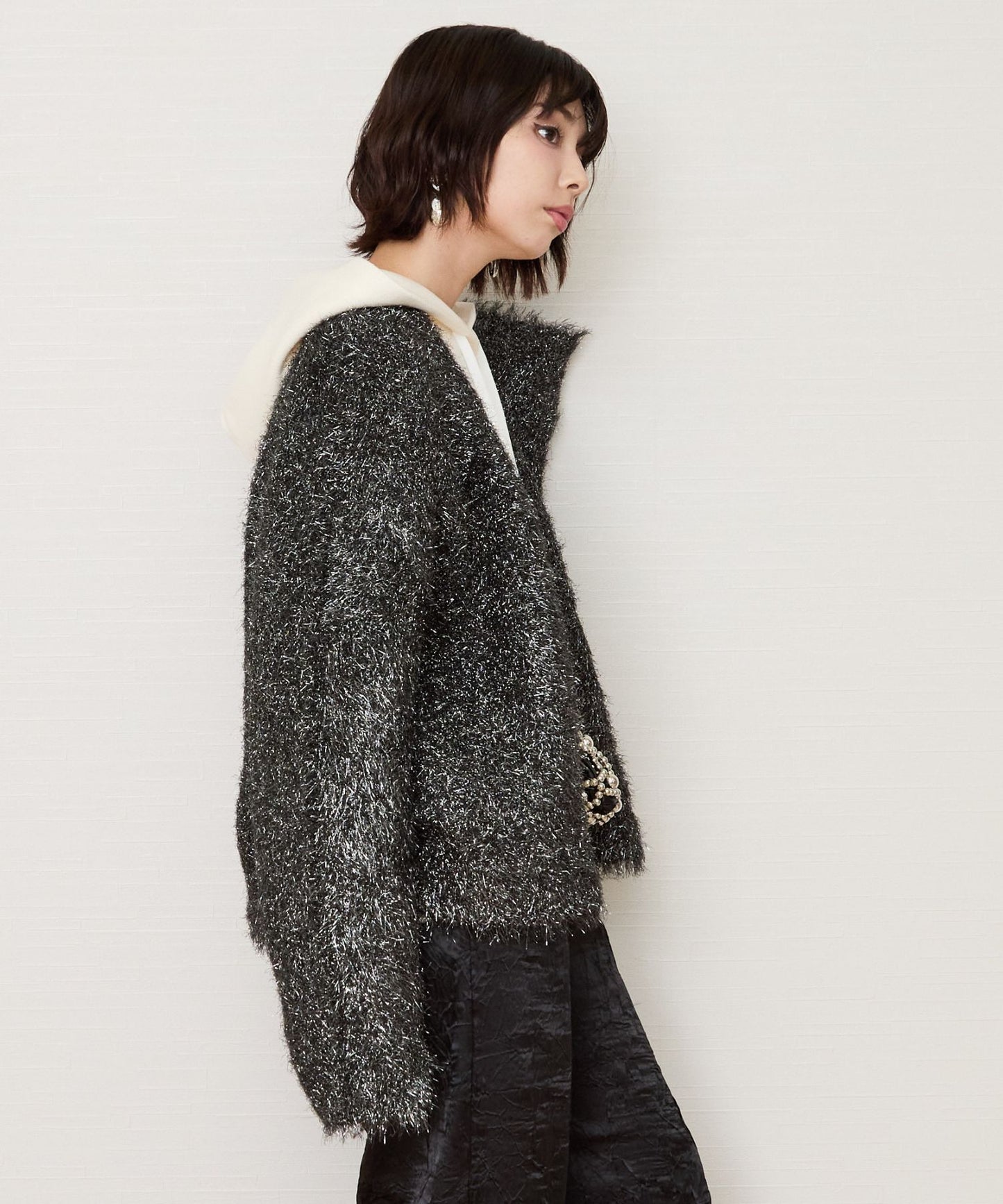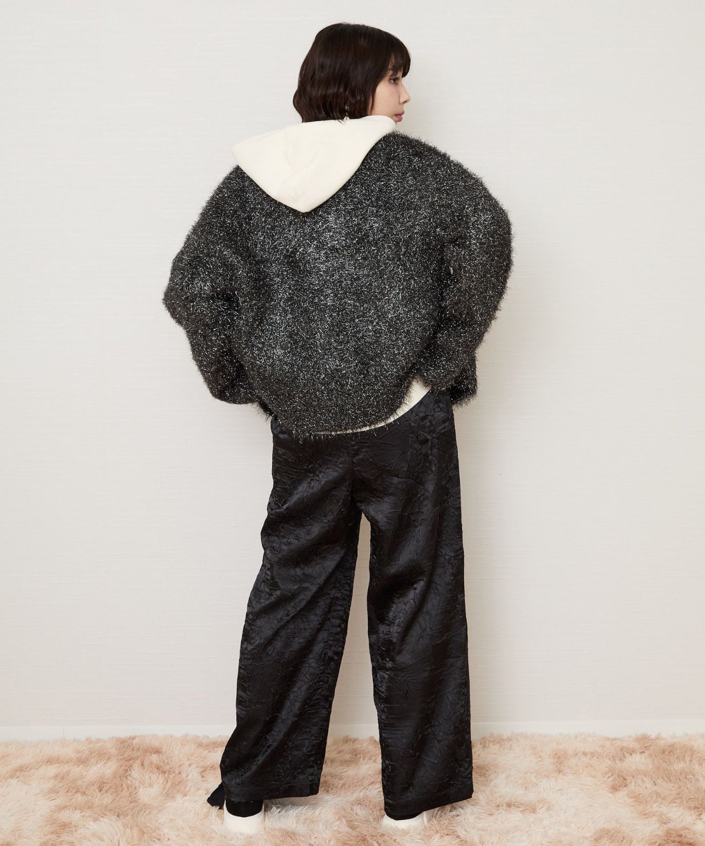 ふわふわとした毛足のシャギー素材が特徴で、動くたびにさりげなく輝くラメが美しく映えます。