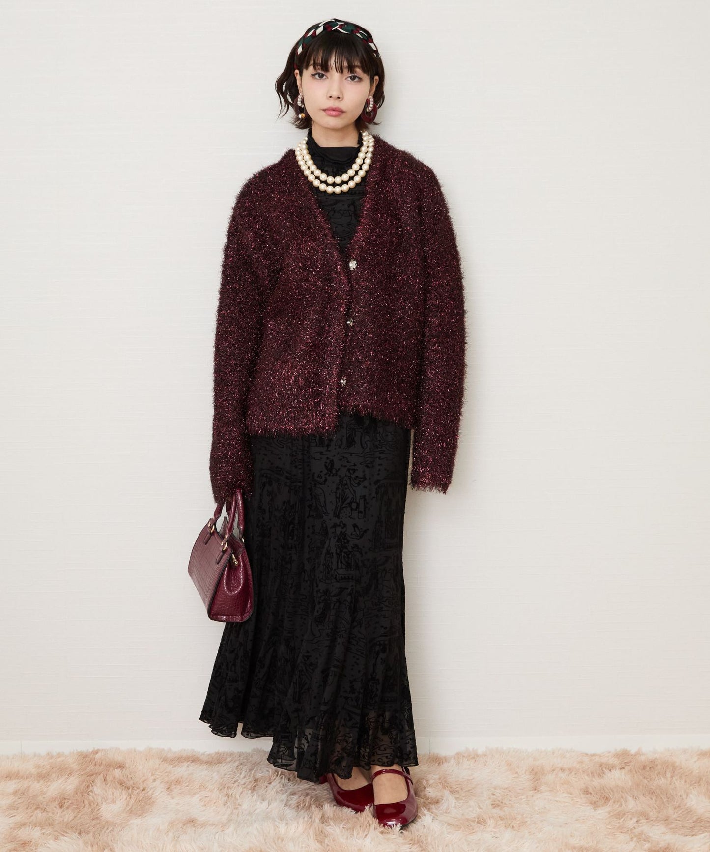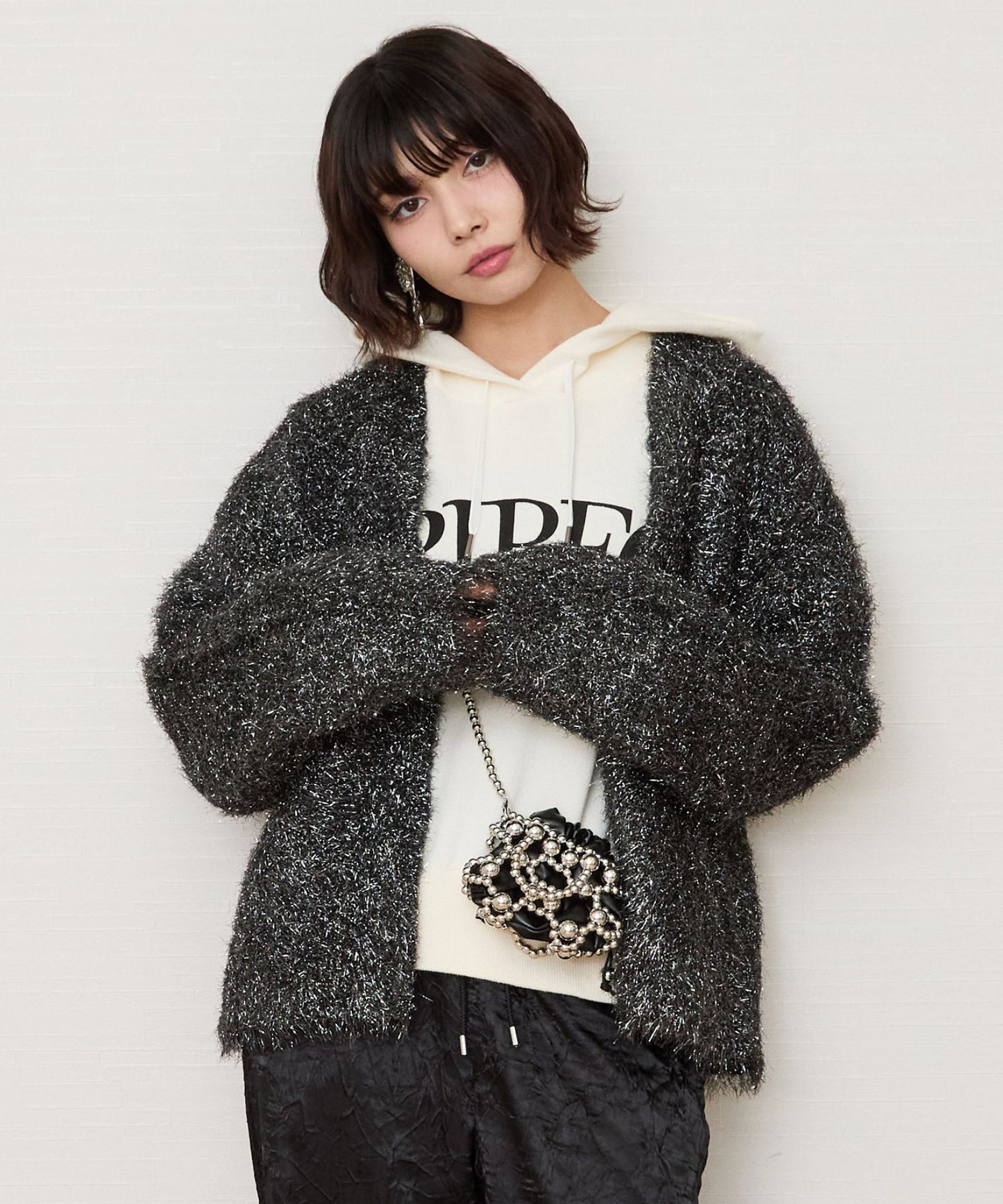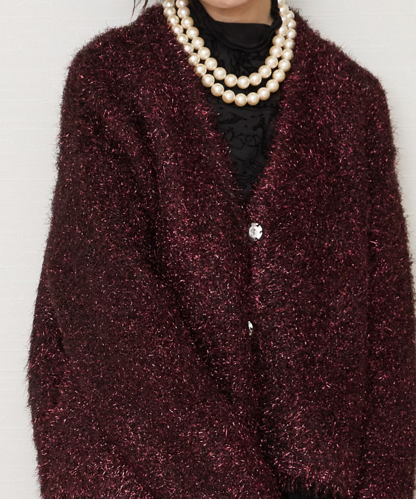 ふわふわとした毛足のシャギー素材が特徴で、動くたびにさりげなく輝くラメが美しく映えます。