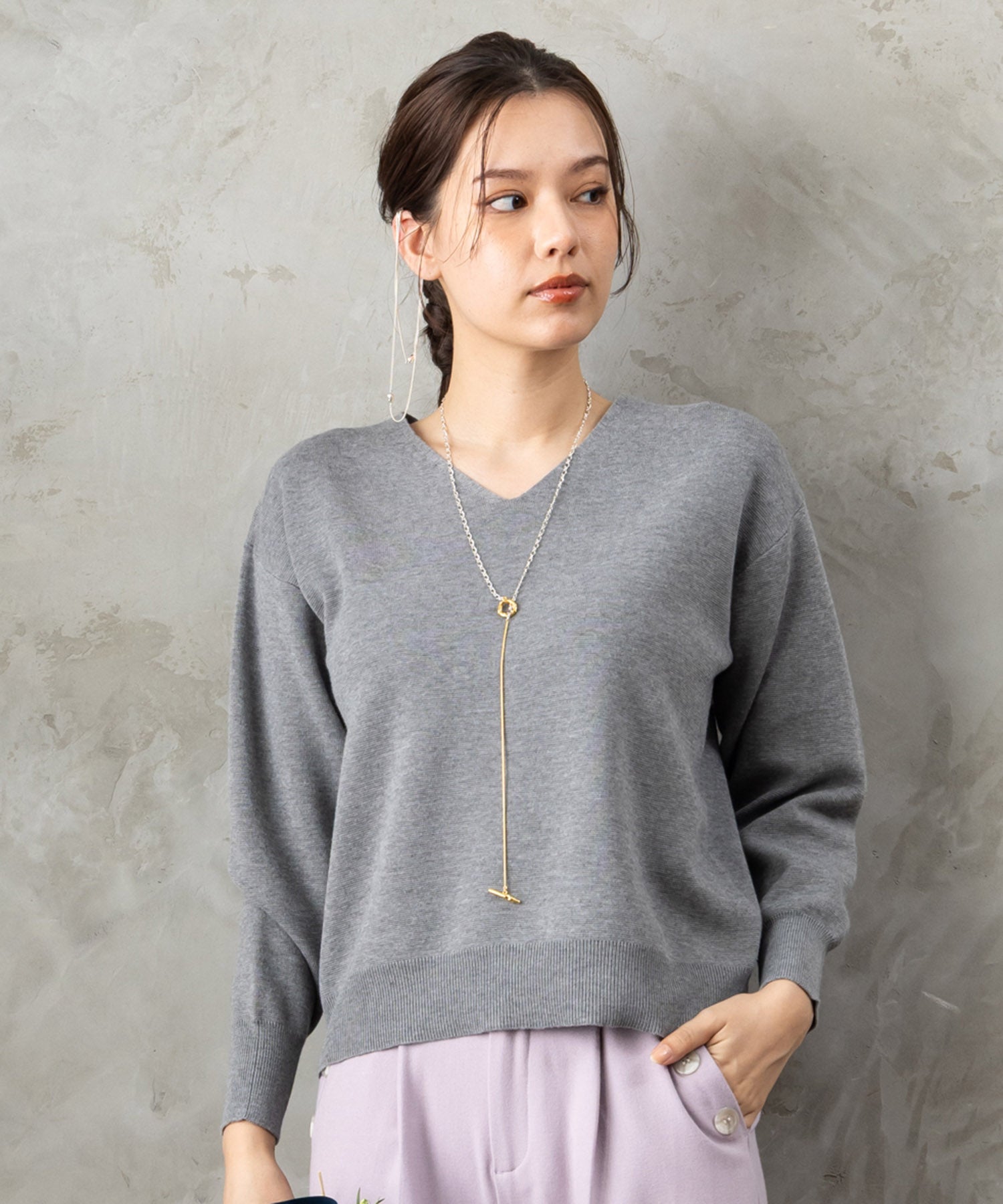 ほどよい肉感とVネックラインが、顔まわりをすっきり見せてくれます。