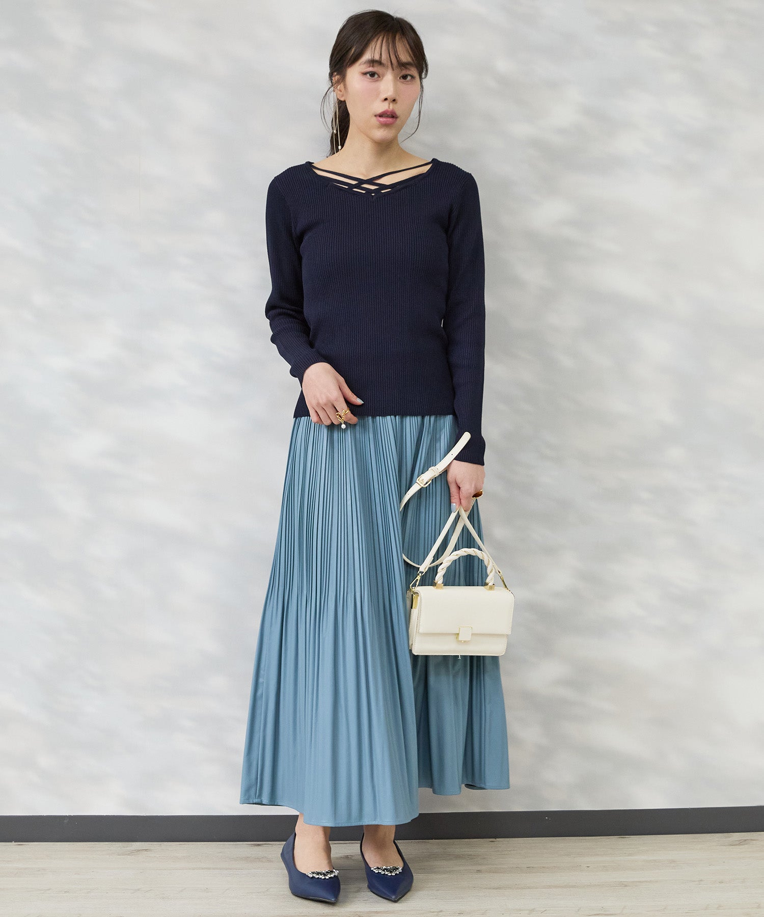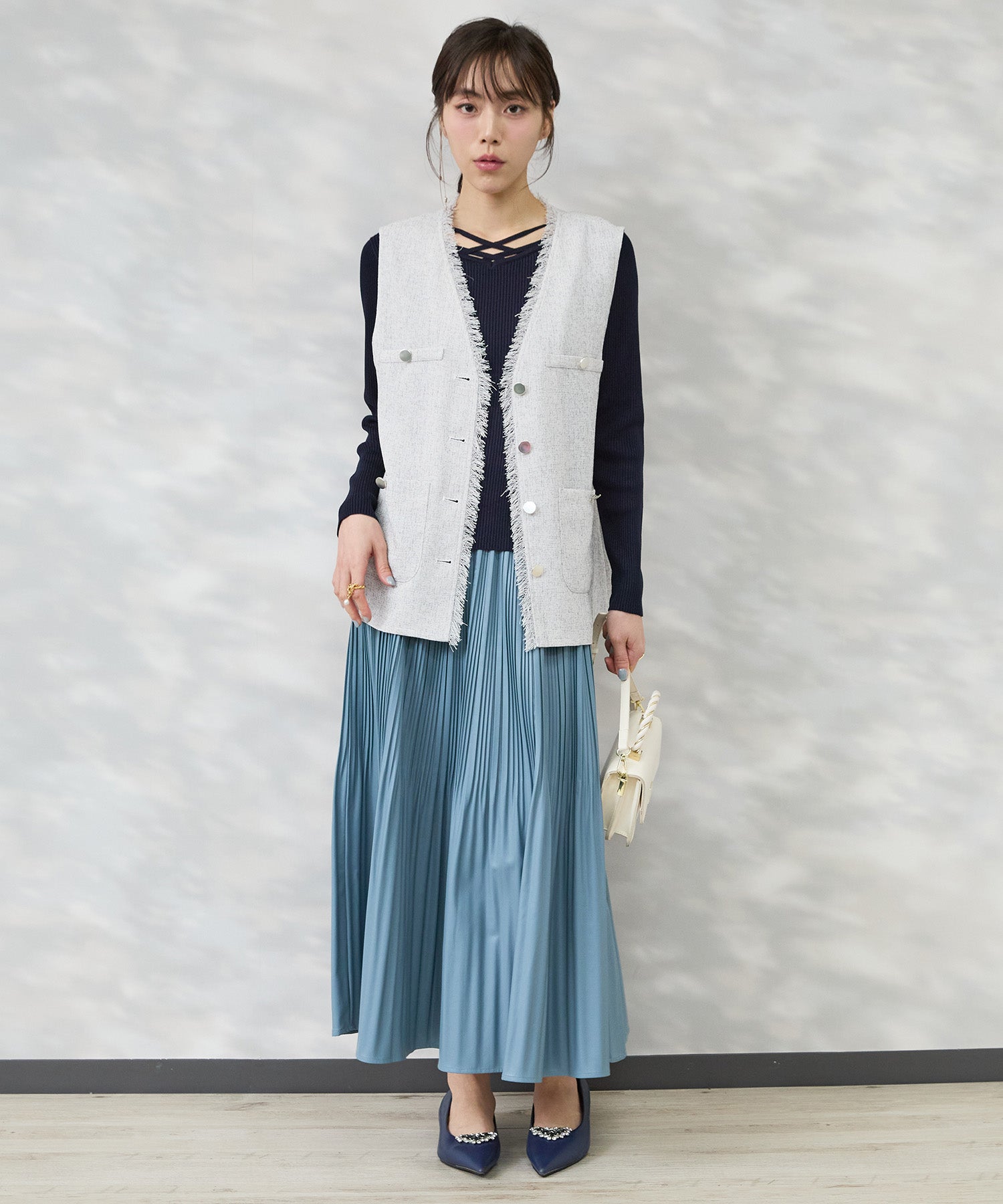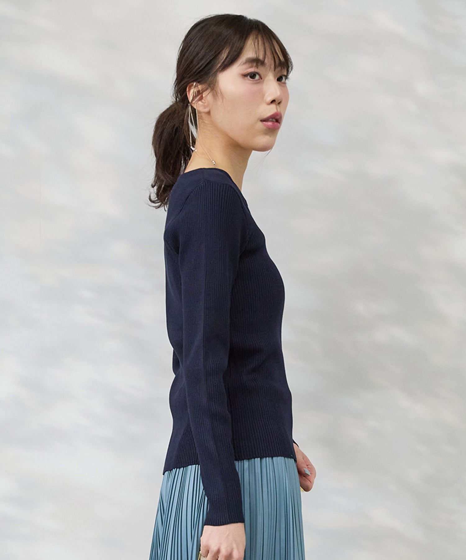 繊細な表情が上品に映え、一枚でもレイヤードでも洗練された印象に。