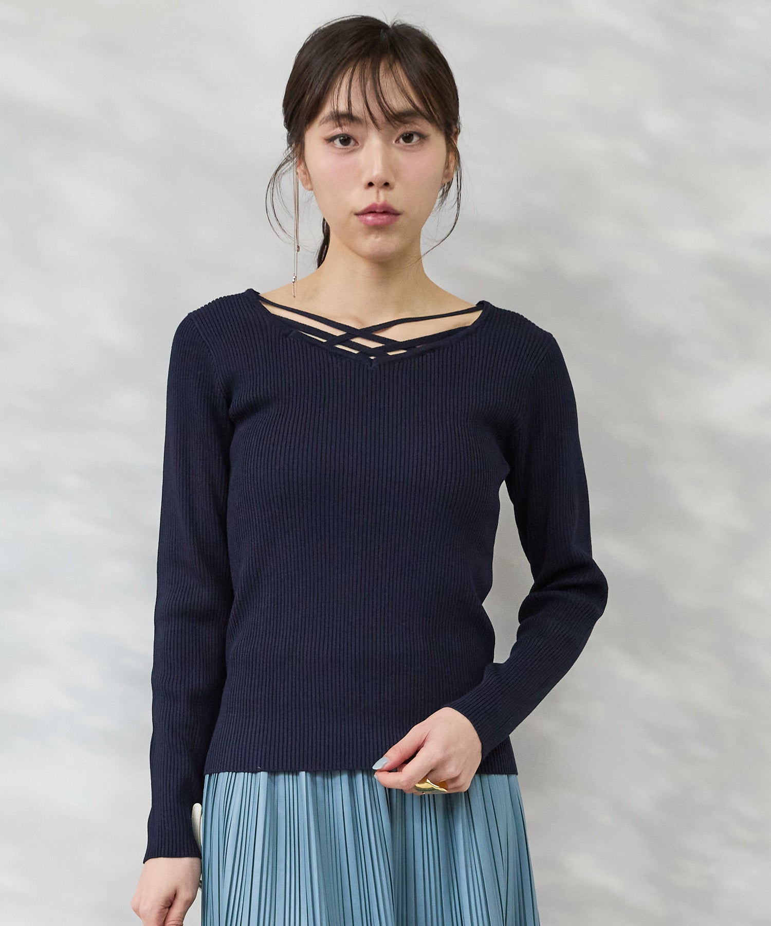 ダイヤモンドカットのようなネックラインが、顔まわりをすっきりと見せるリブニット。