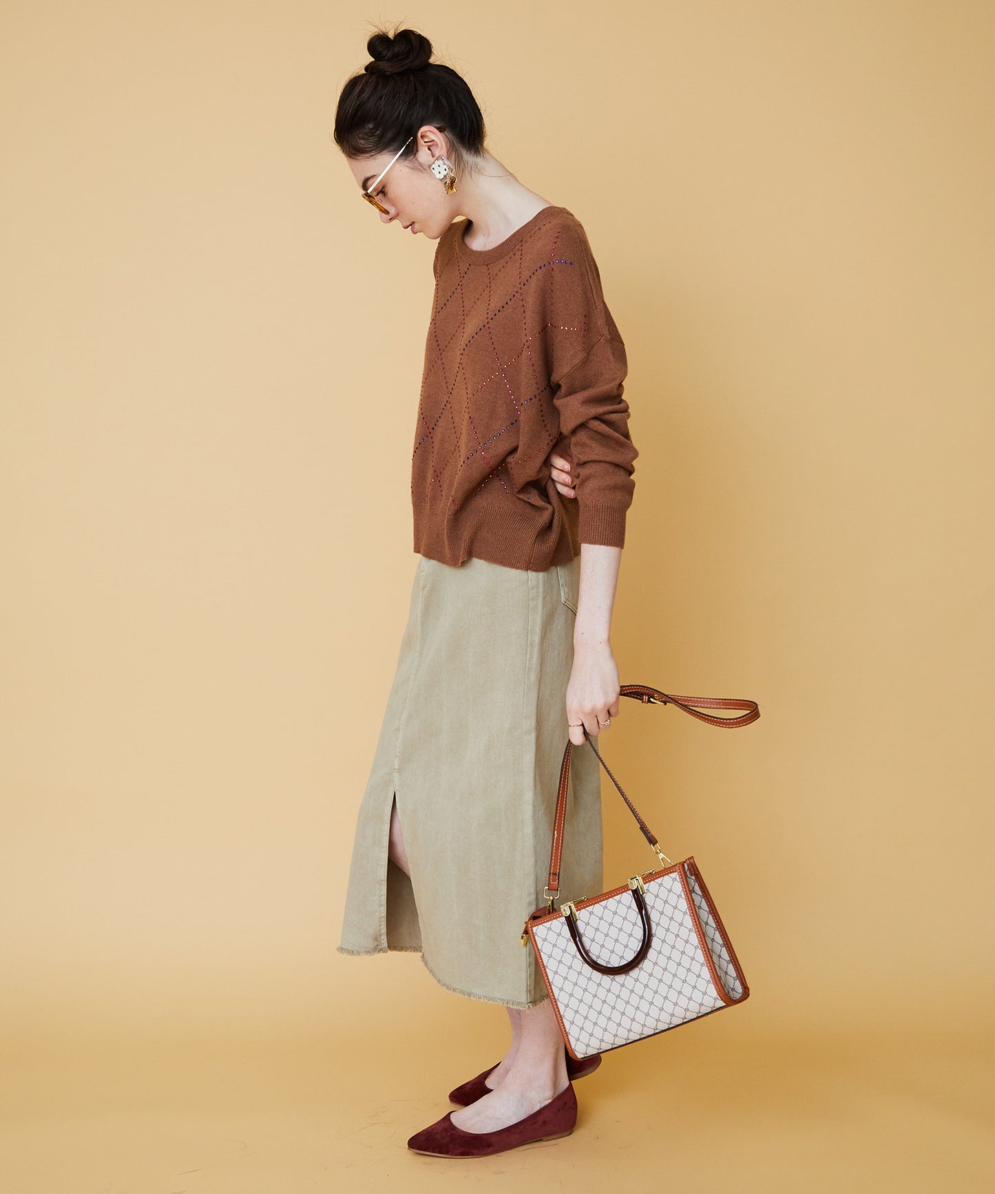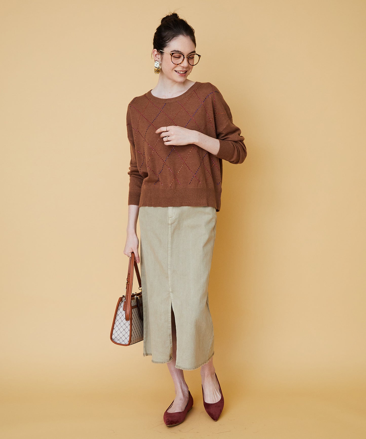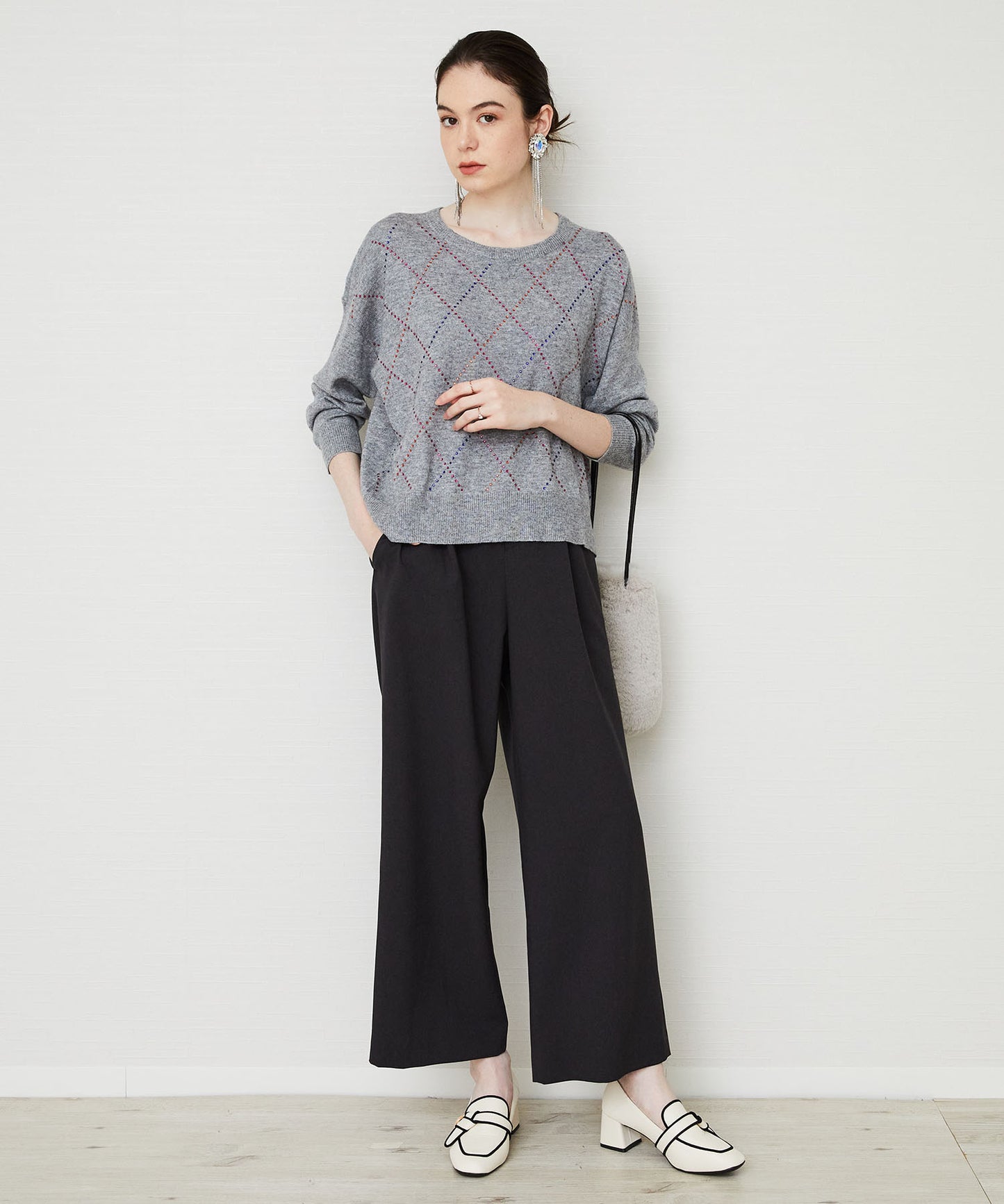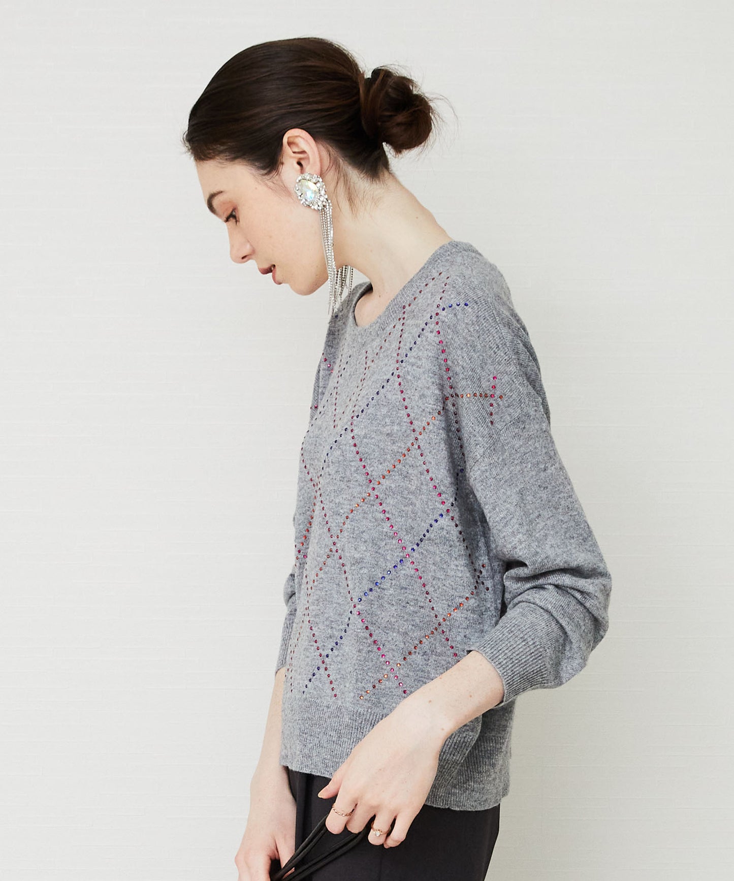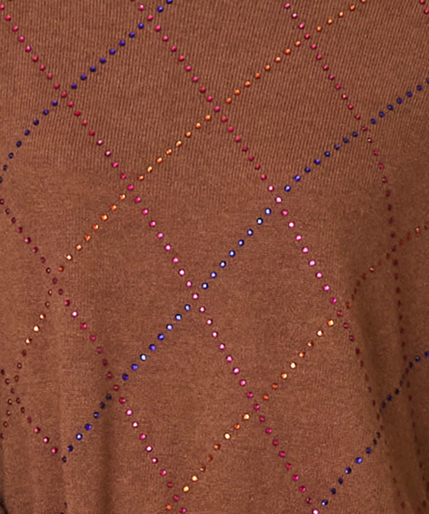 カラフルなビジューが煌めくダイヤ柄ニット