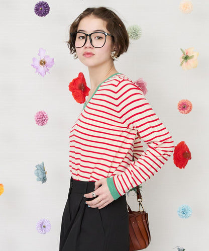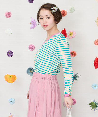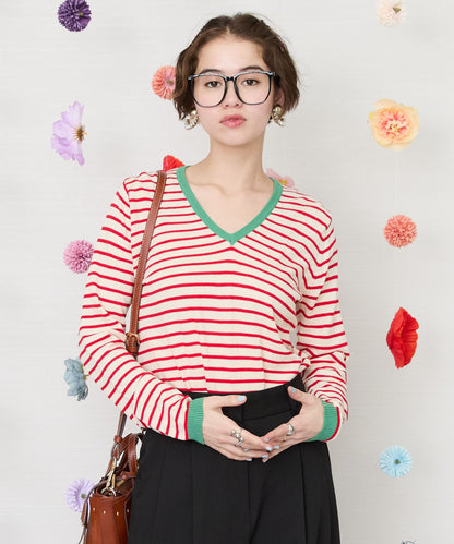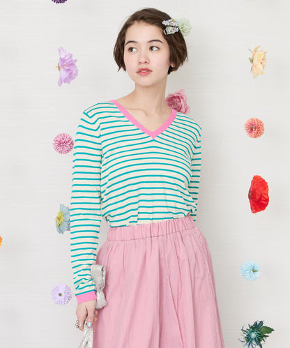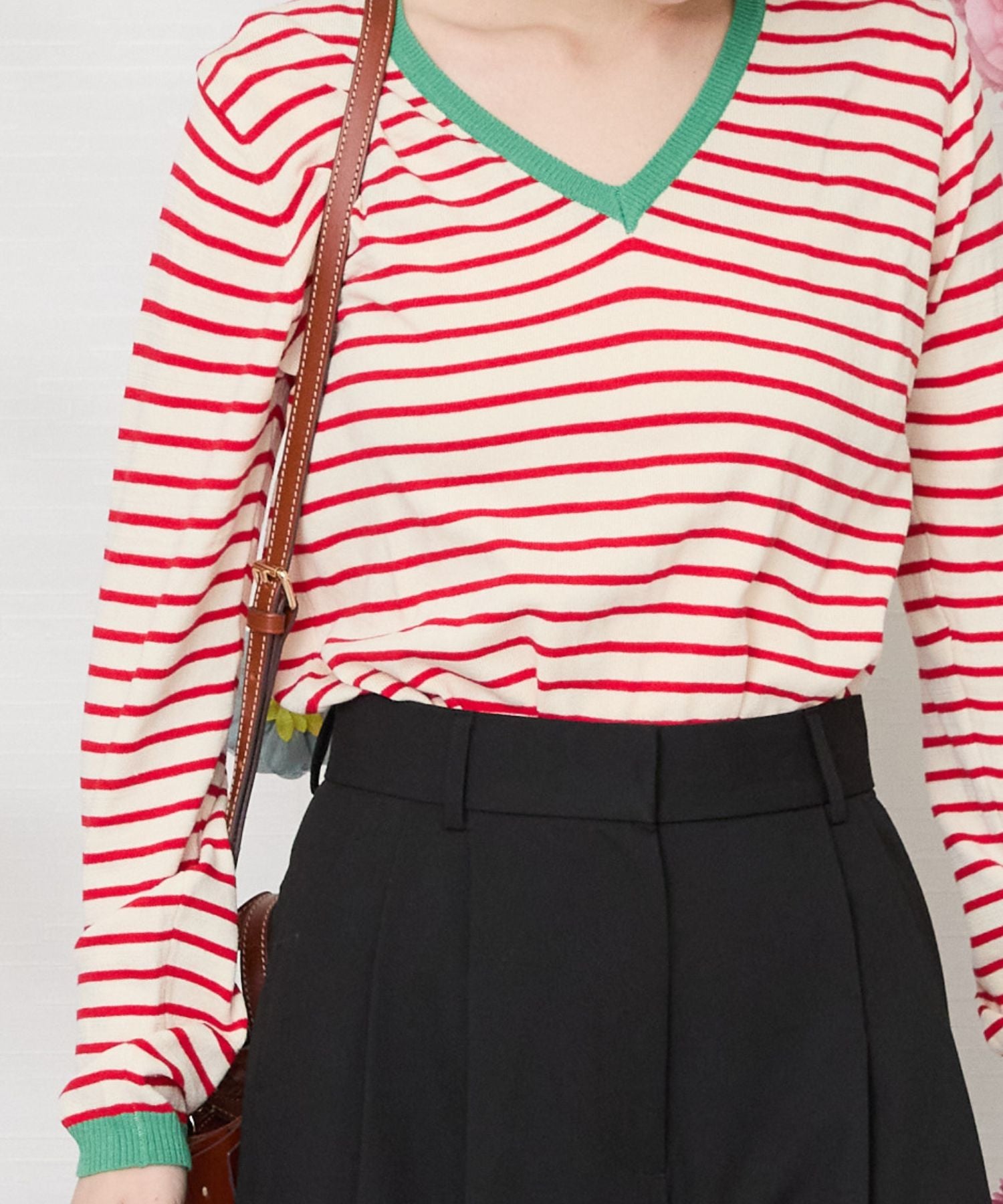 ヘルシーなVネックデザインが顔まわりをすっきりと見せ、首元と袖口の配色ラインがさりげないアクセントに。