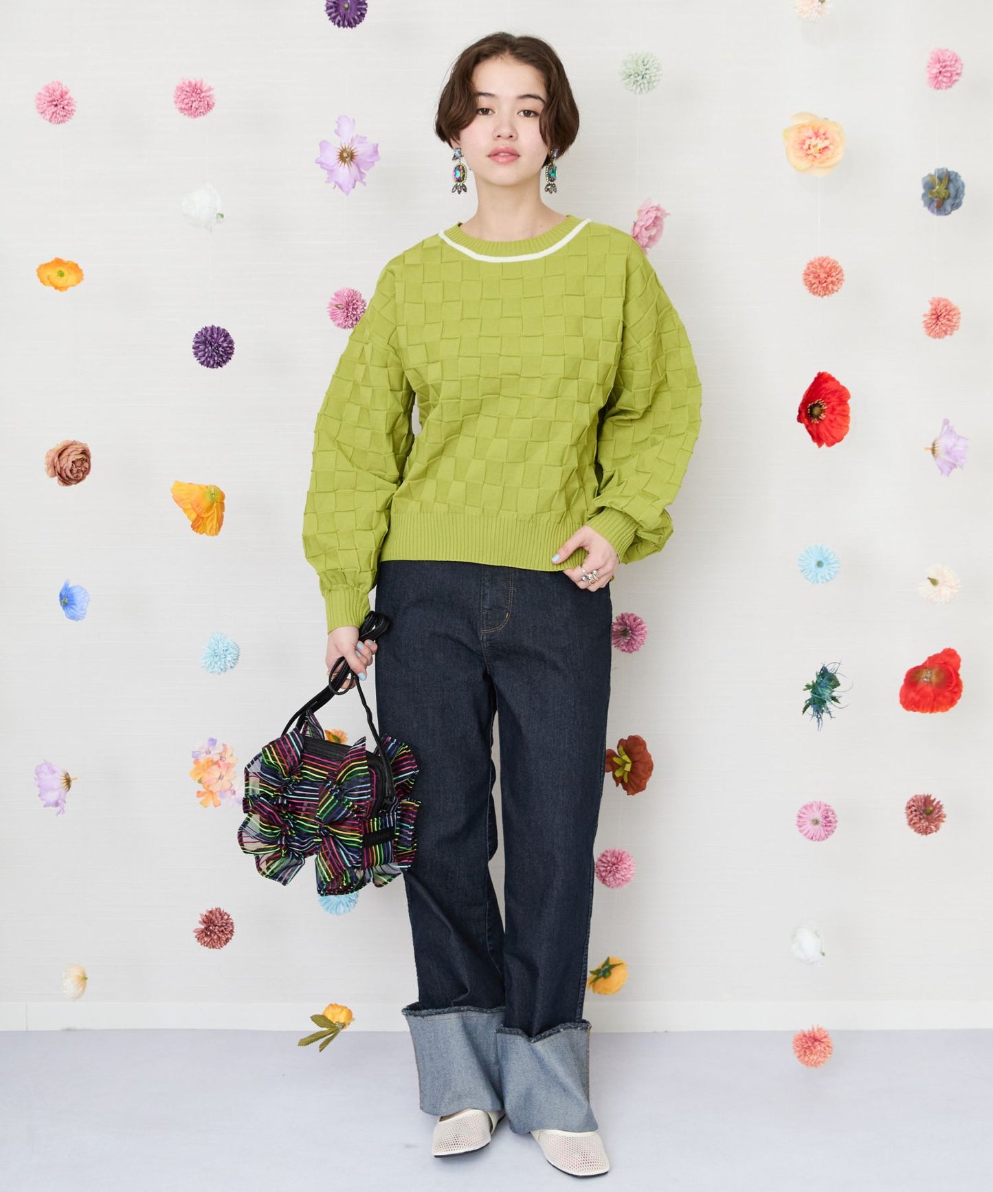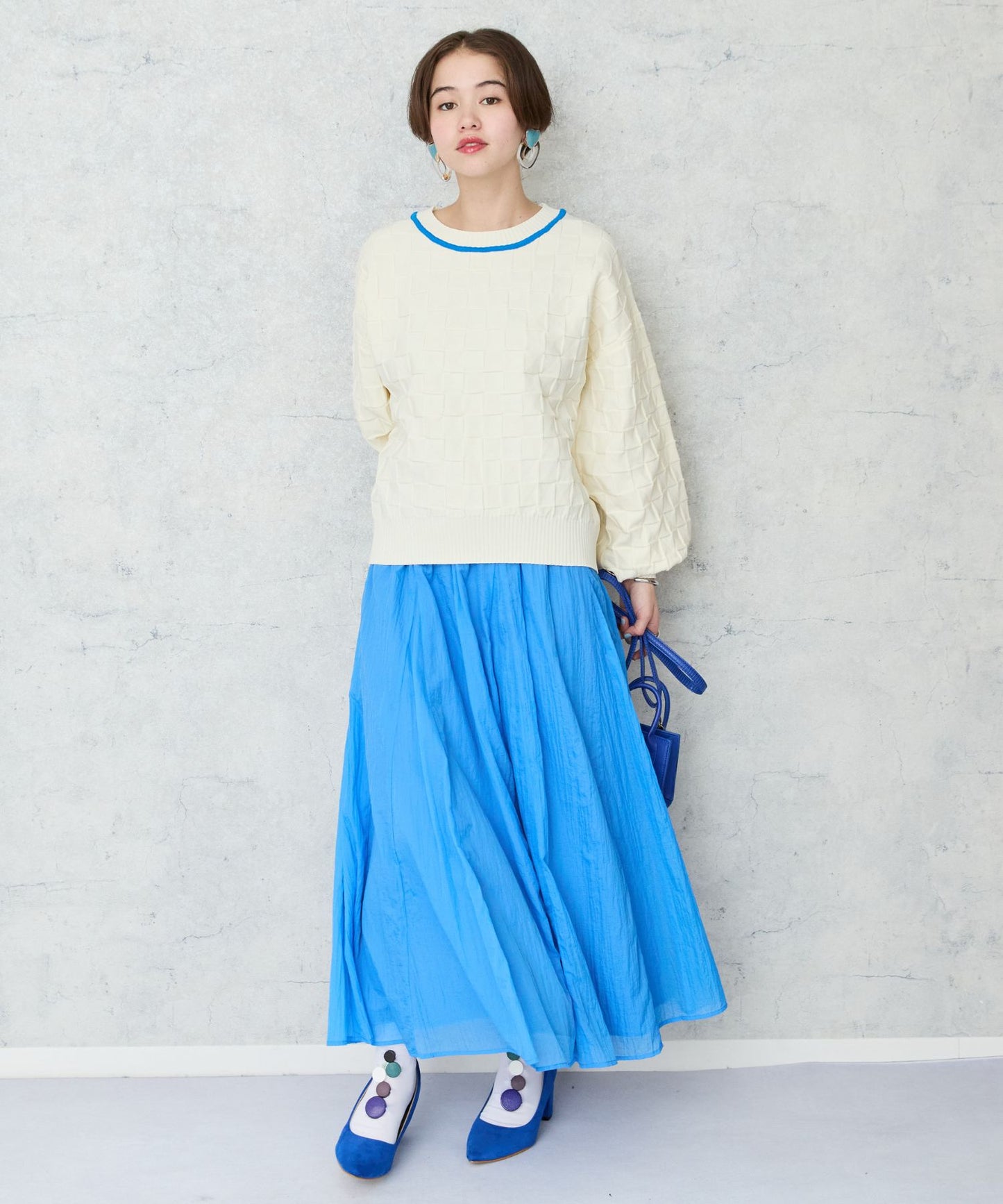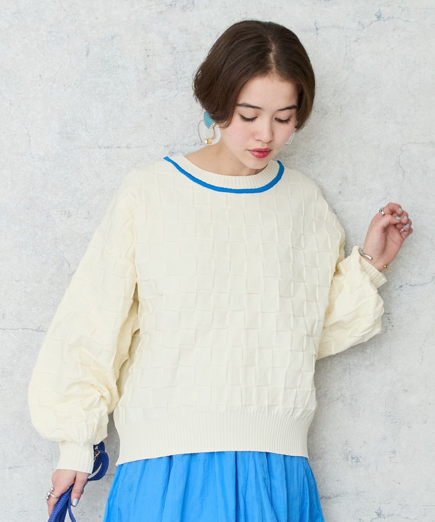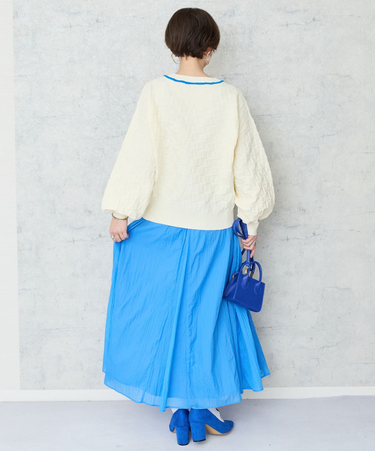 きれいな編地とネック部分の配色が華やかさをプラスします。