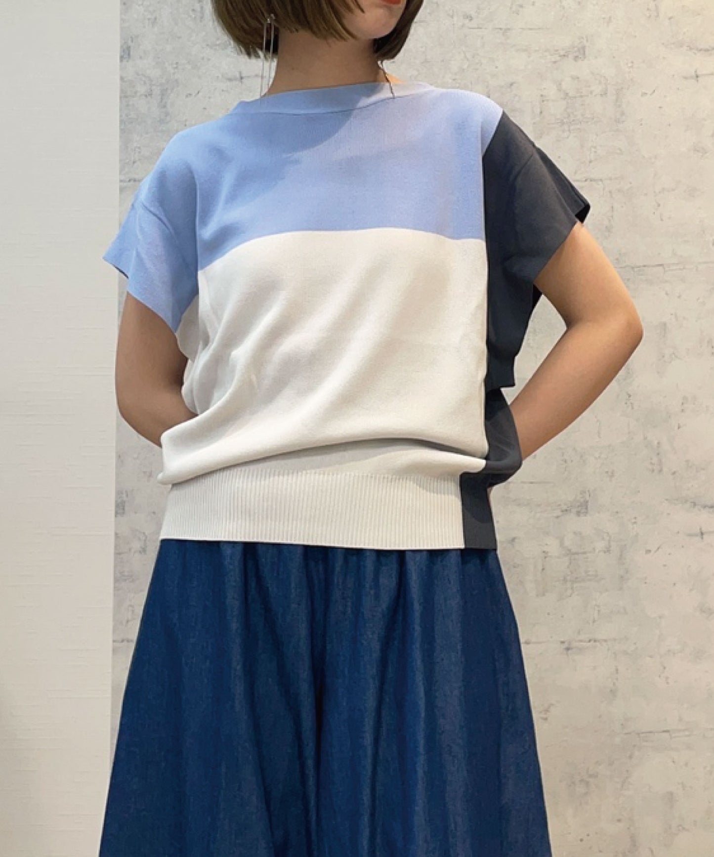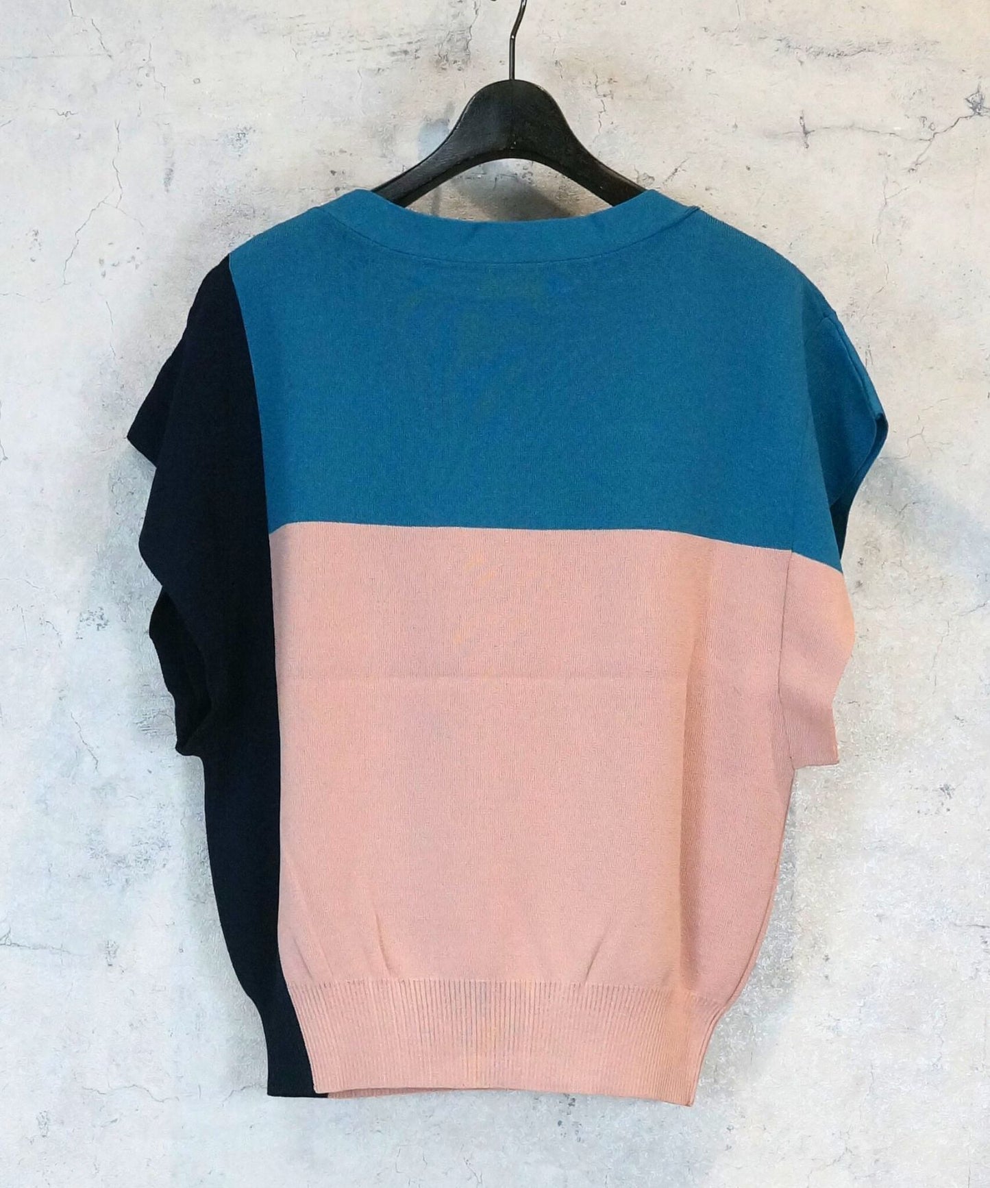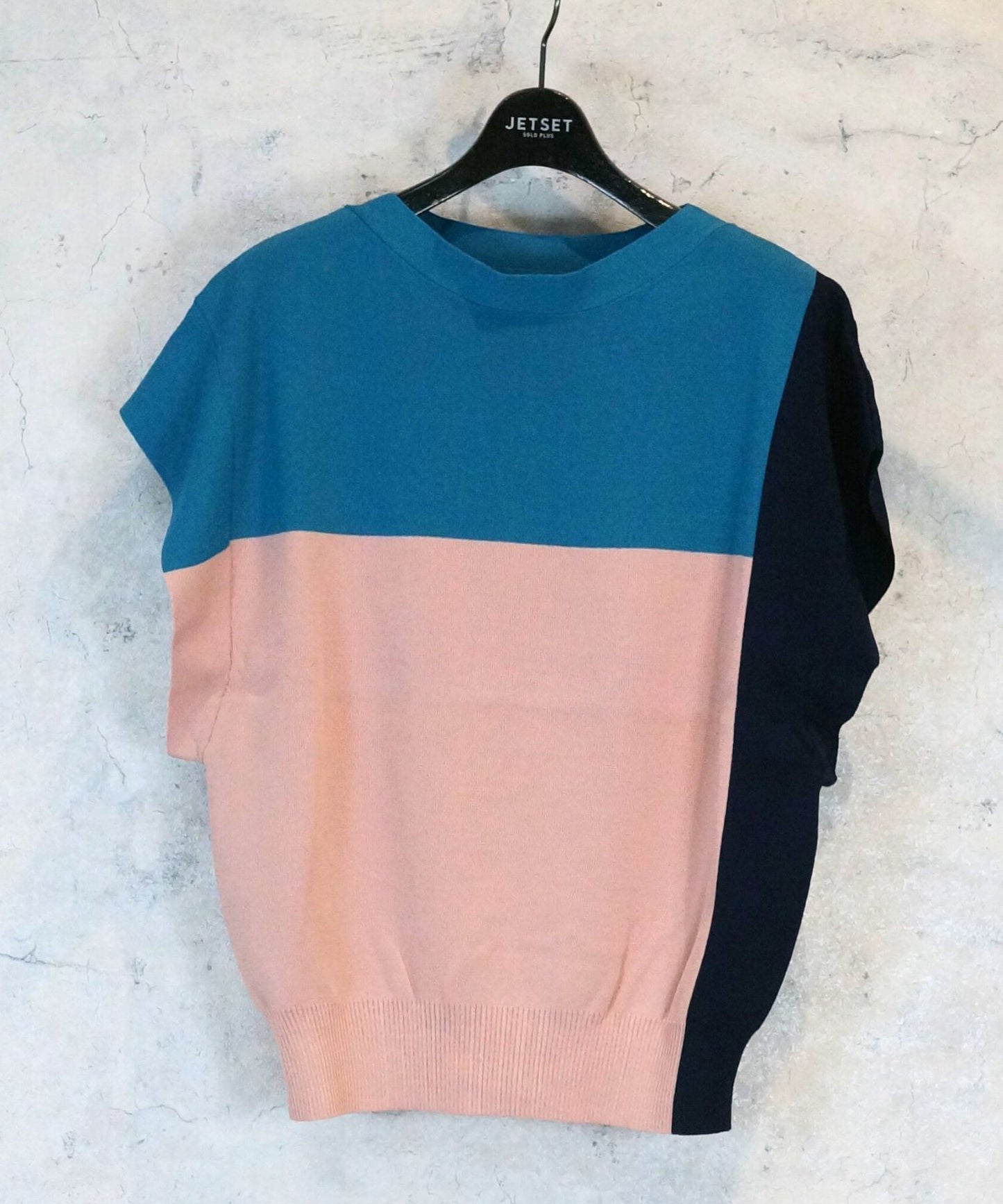 インターシャ編みのカラーブロックデザインは左肩を濃色にして視覚的に引き締め効果をプラスし、さらにシェードパステルを差し込んだ配色で、真夏から初秋まで長く楽しめる絶妙なカラーリング。