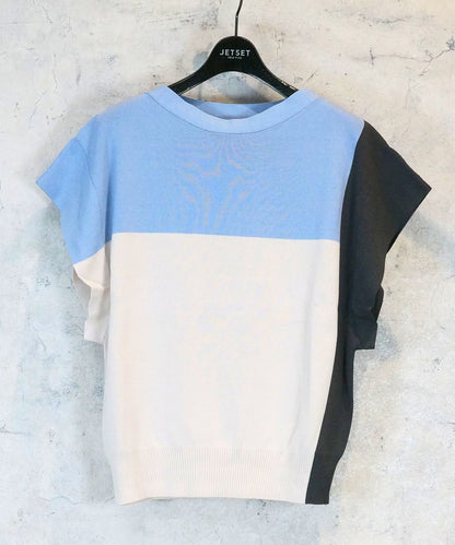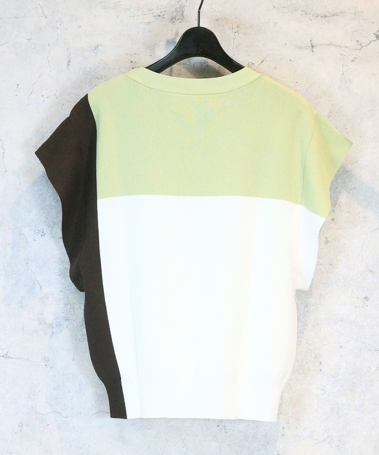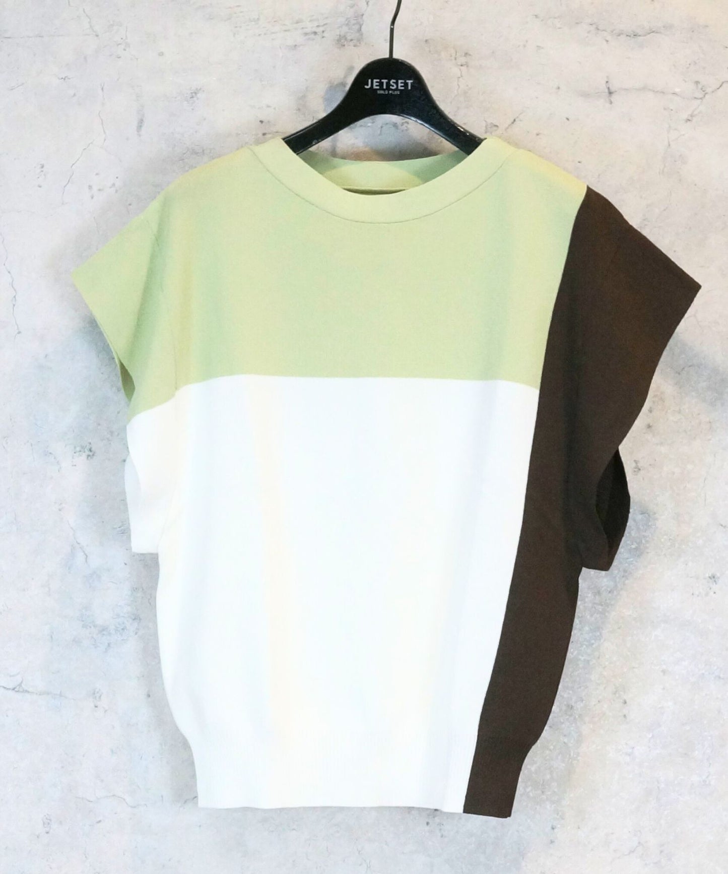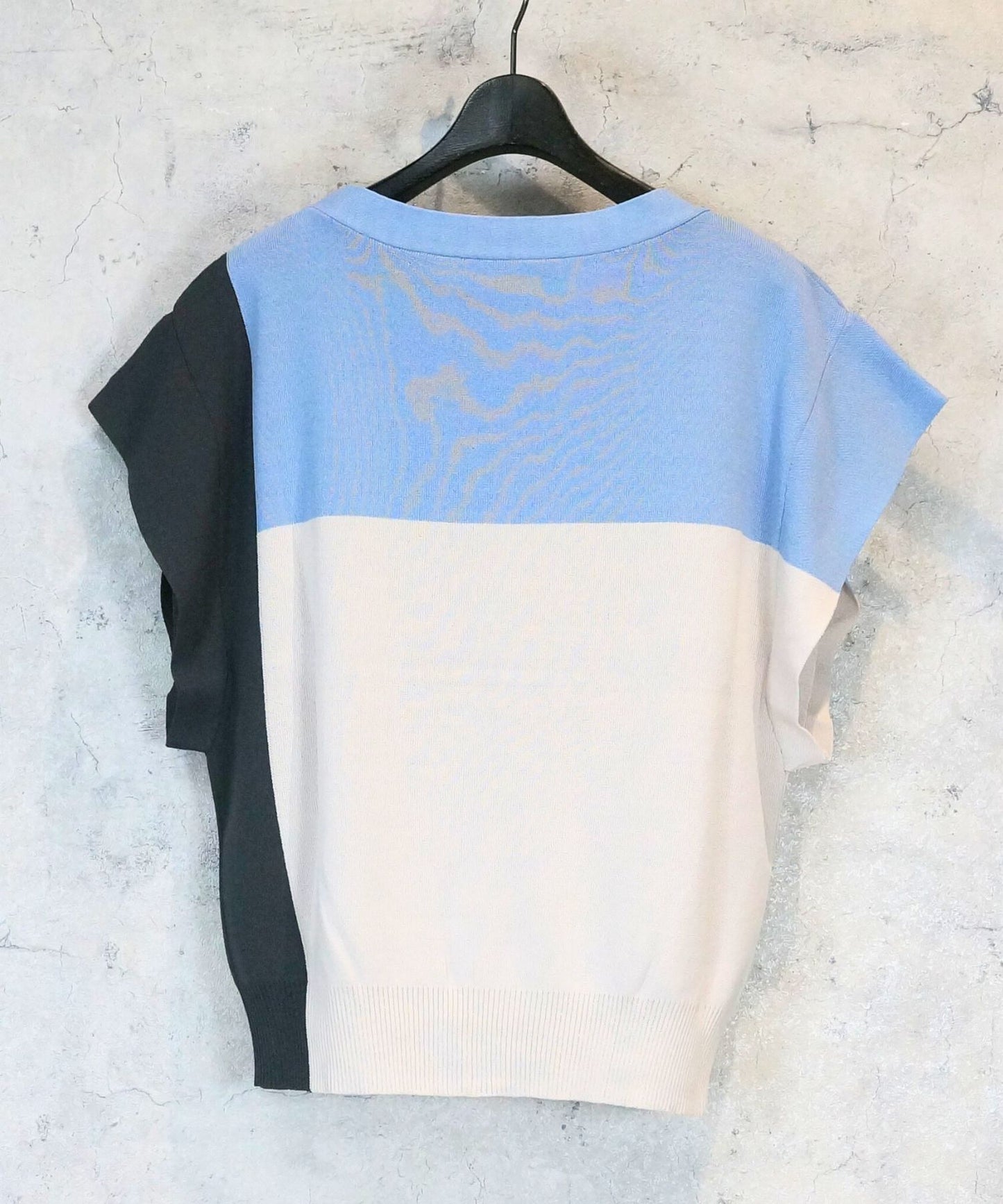 インターシャ編みのカラーブロックデザインは左肩を濃色にして視覚的に引き締め効果をプラスし、さらにシェードパステルを差し込んだ配色で、真夏から初秋まで長く楽しめる絶妙なカラーリング。