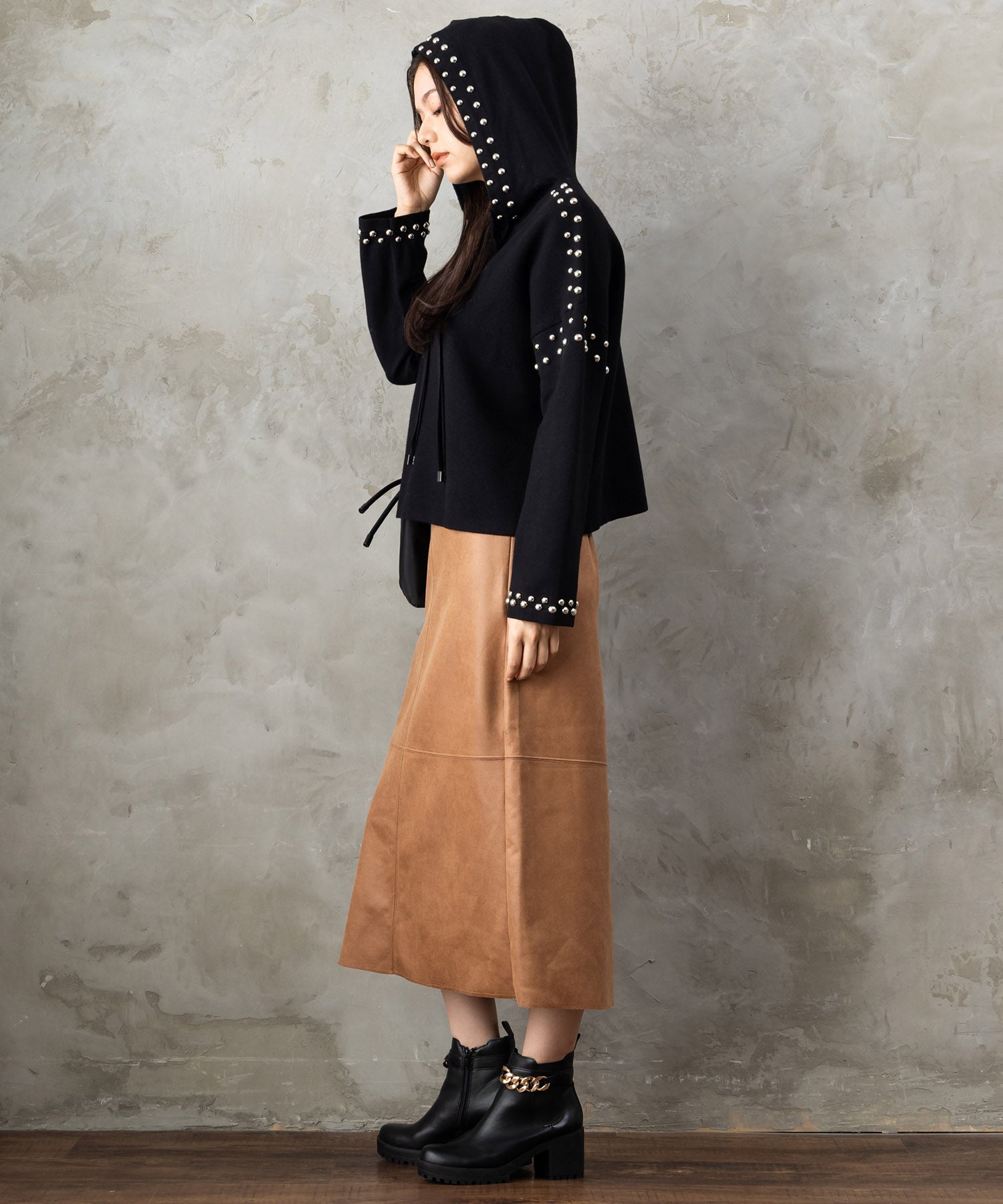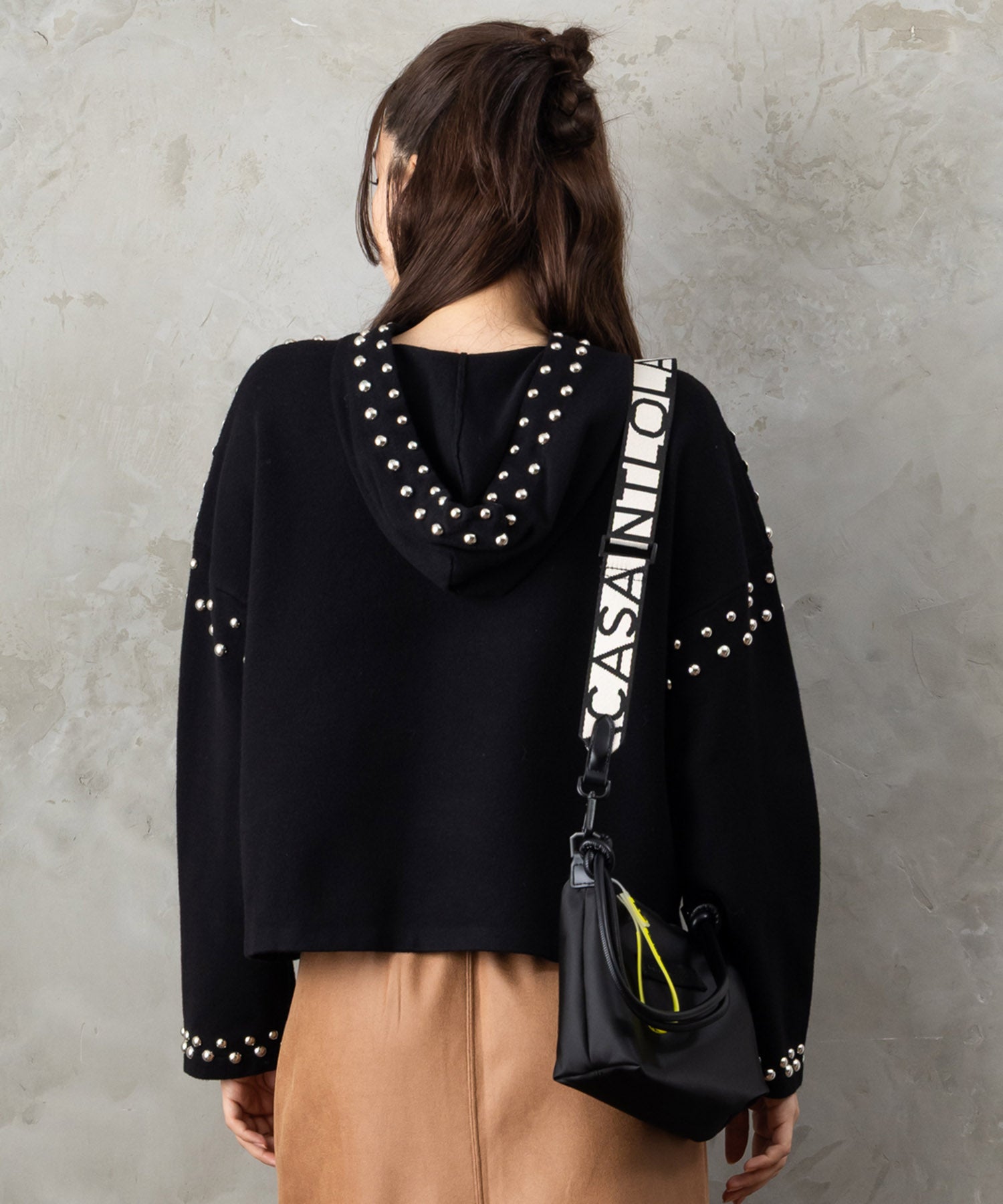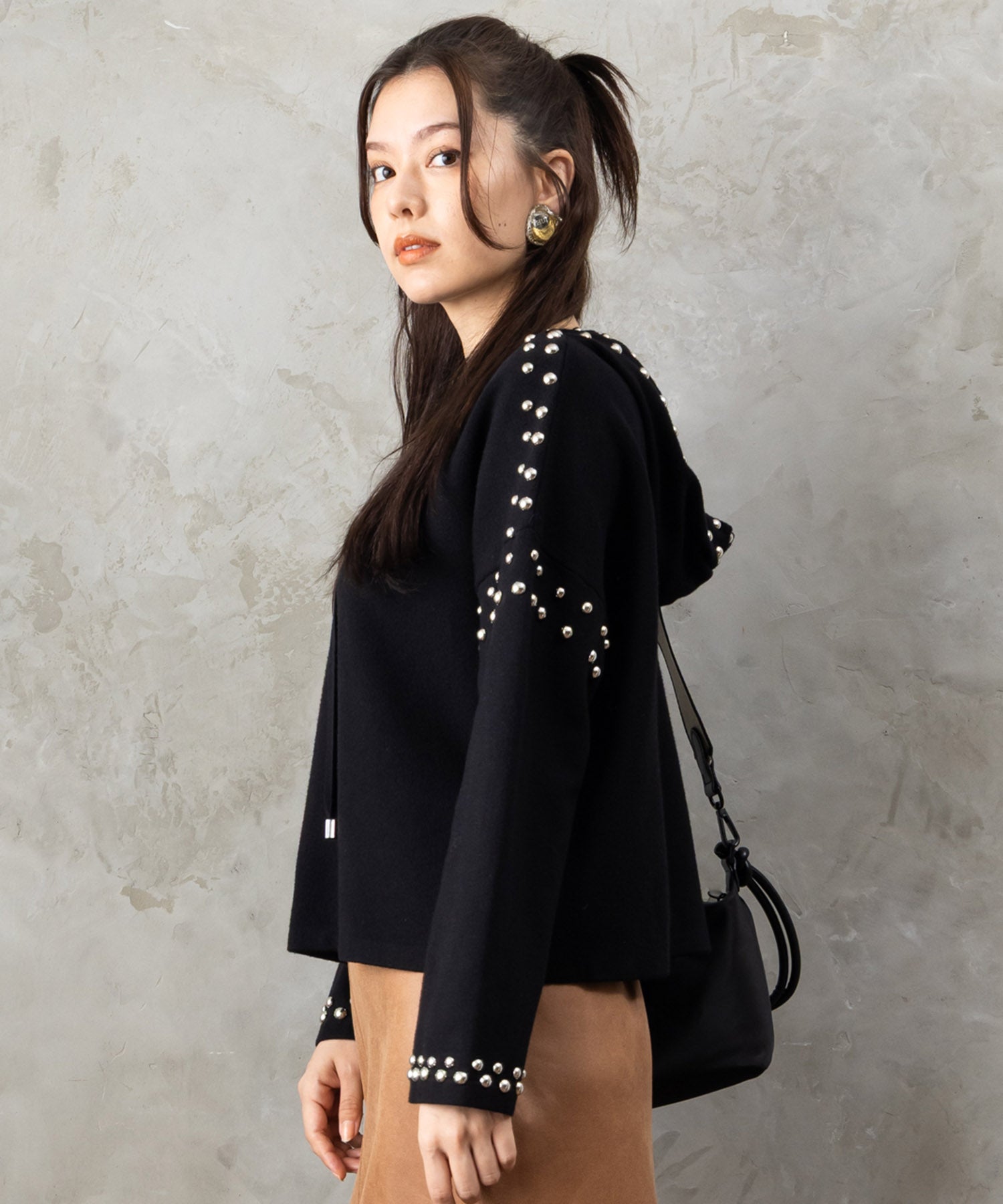 カジュアルなフーディーに、スタッズを散りばめたモードな一枚。