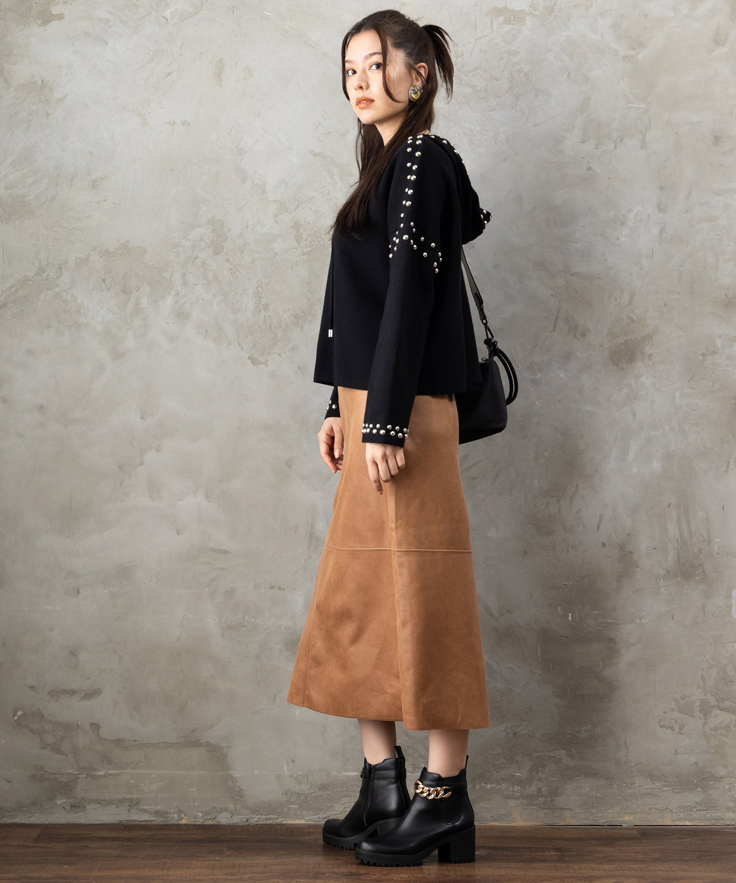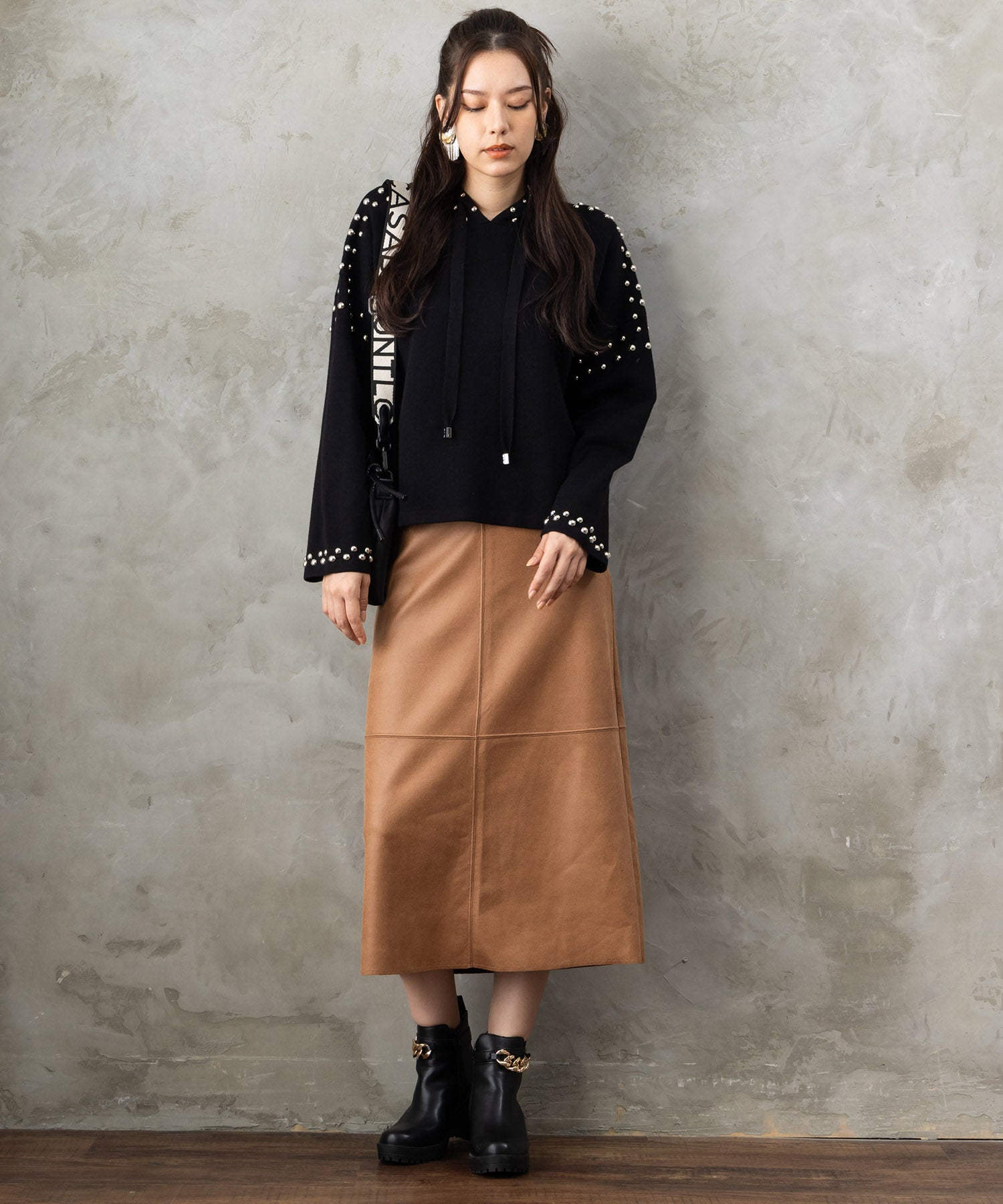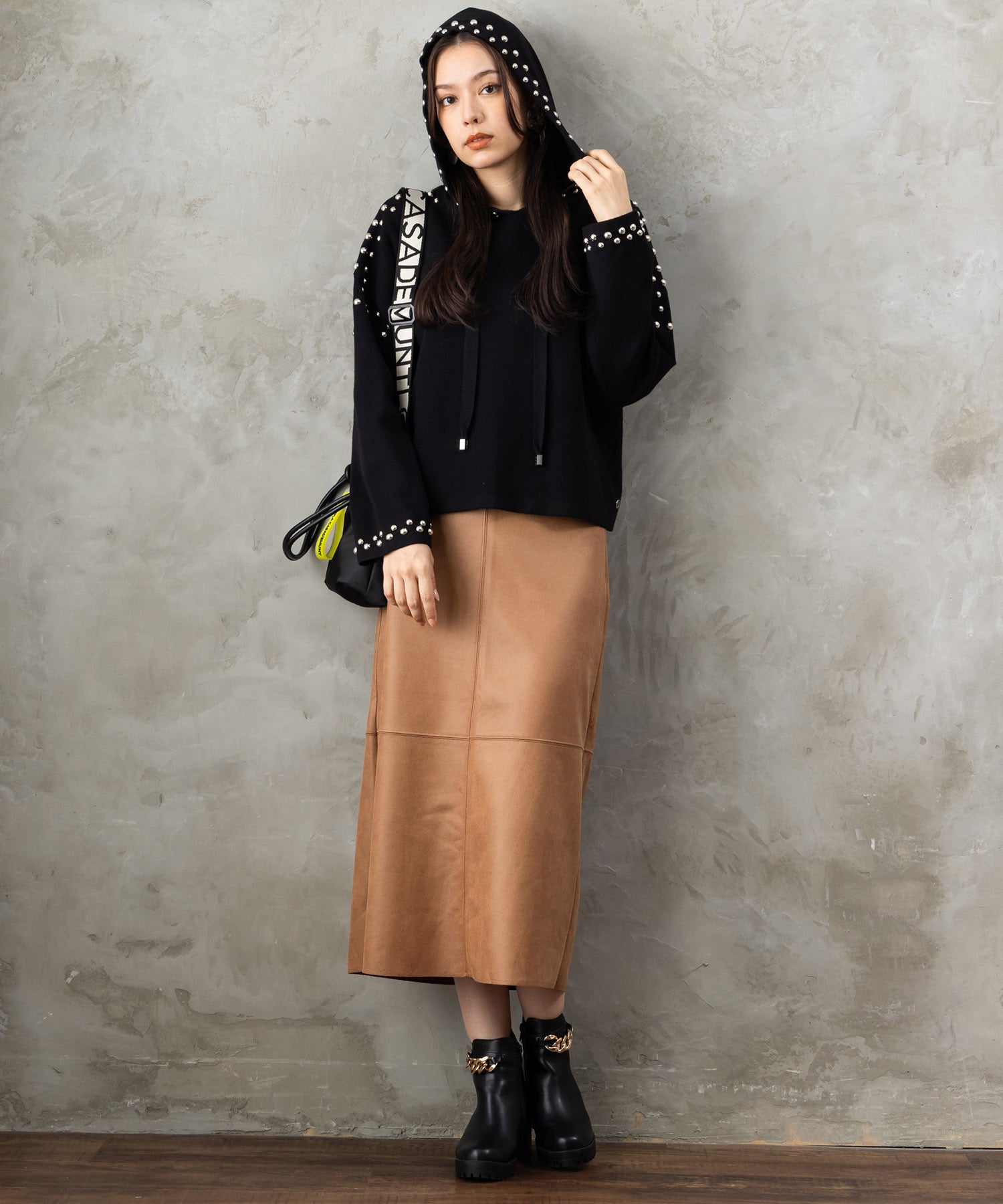 カジュアルなフーディーに、スタッズを散りばめたモードな一枚。