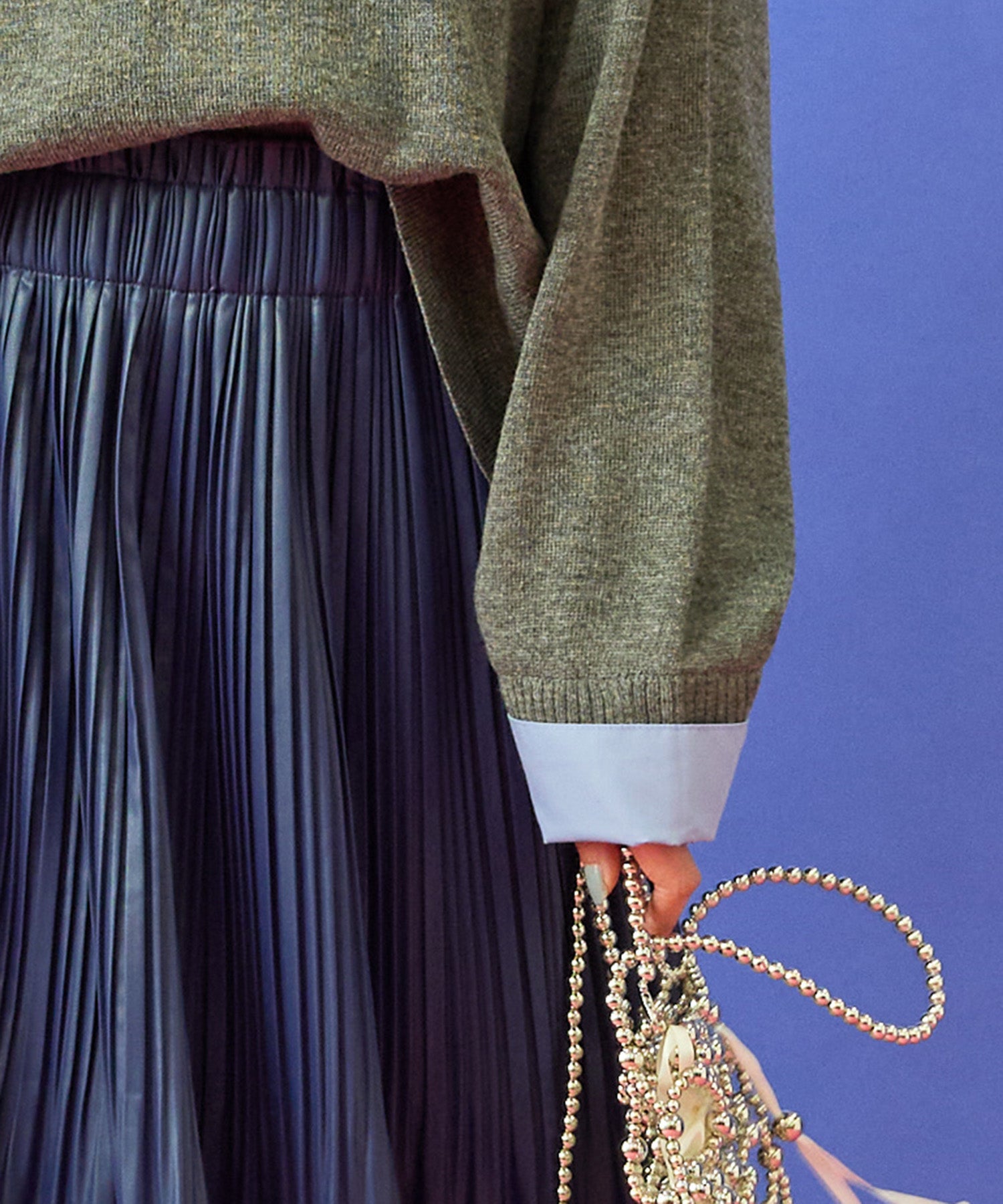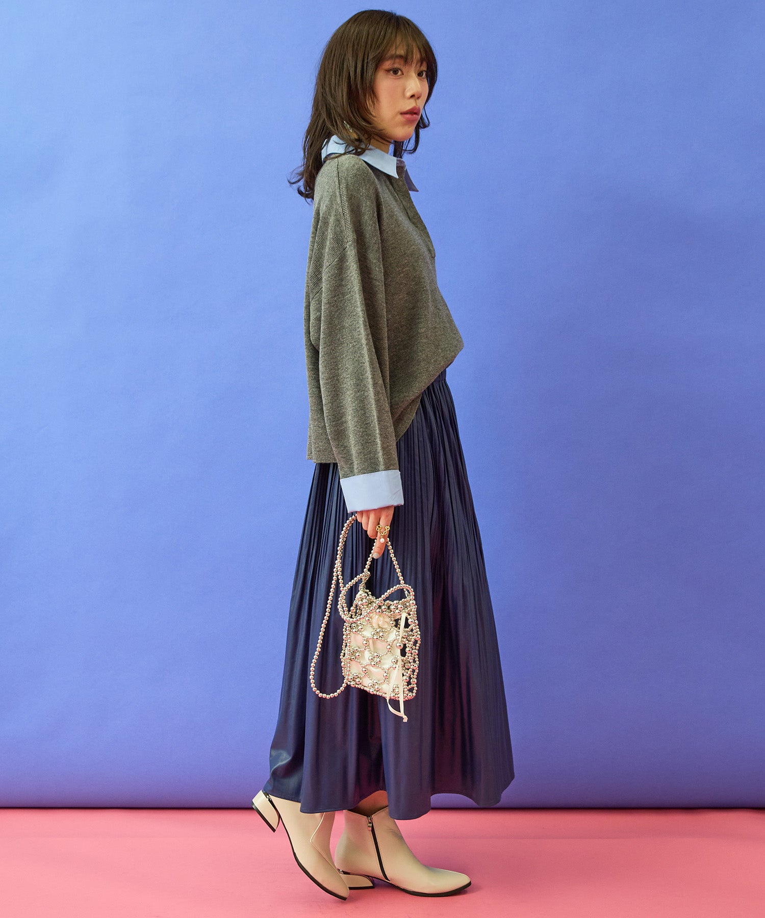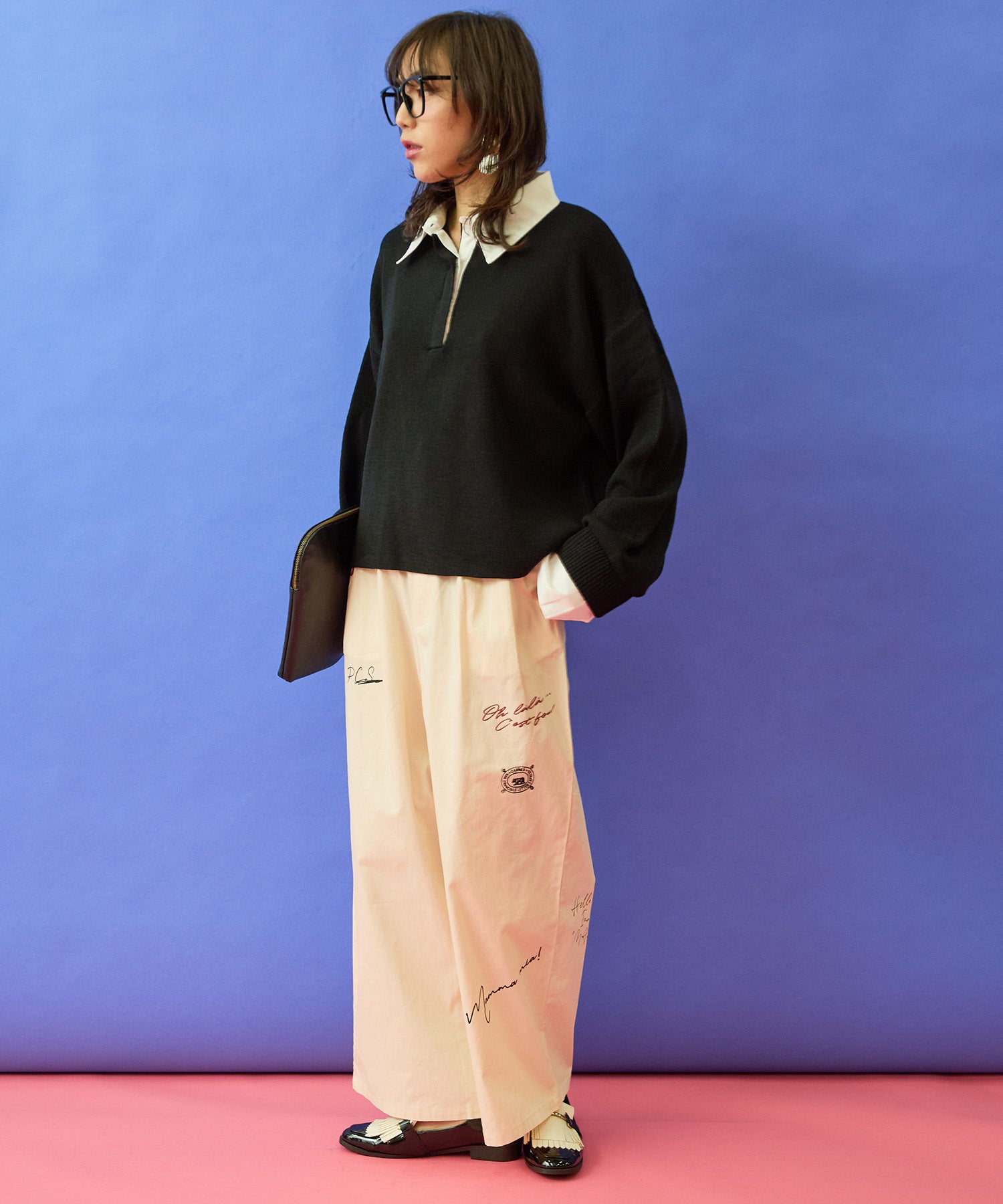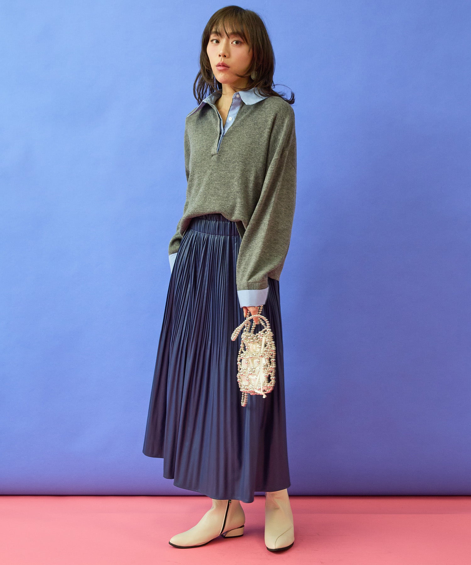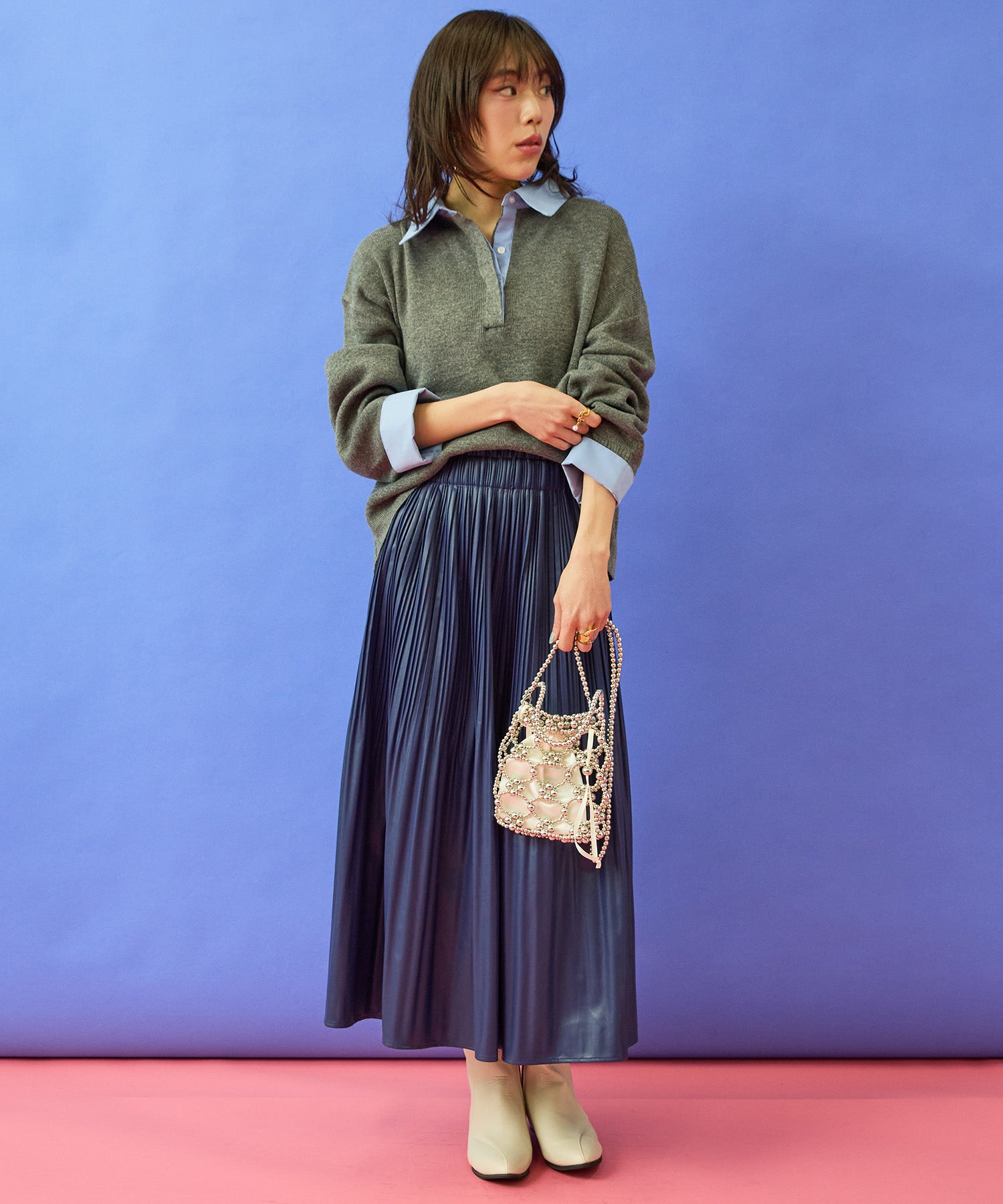 フレアスカートやワイドパンツと合わせて、女性らしいきれいめスタイルに。