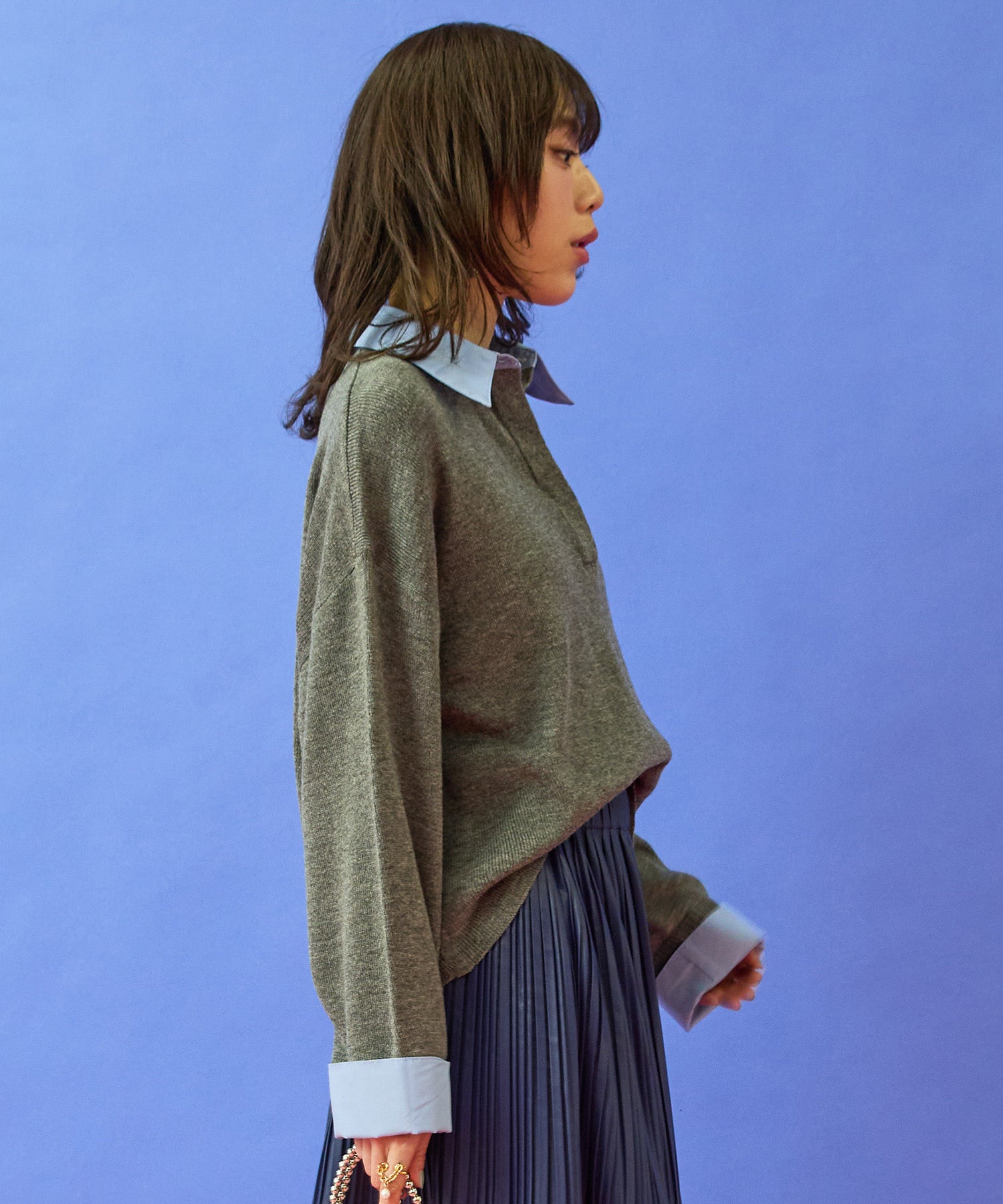 シャツをレイヤードしたようなデザインが目を引くクロップドニット。