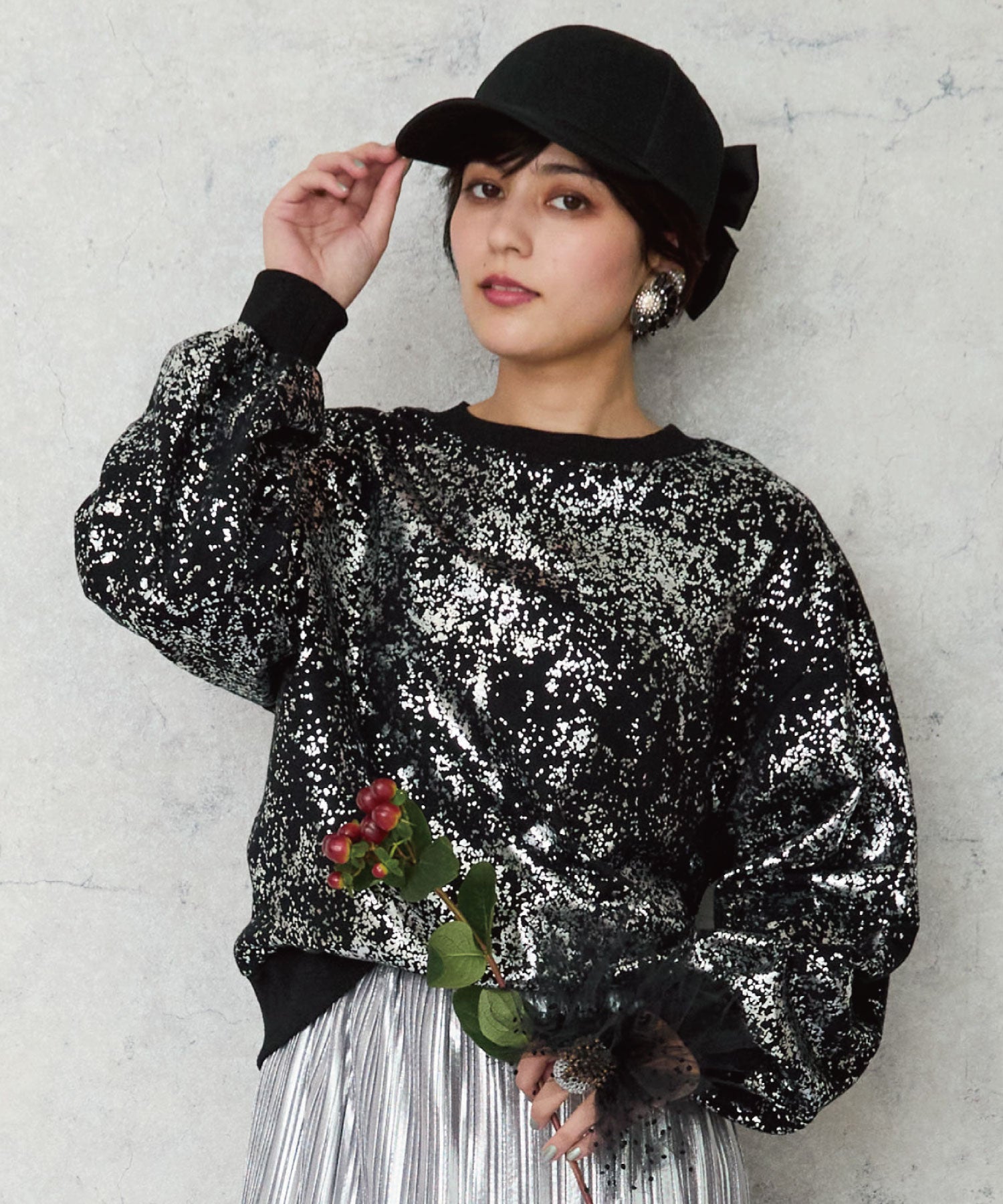 ドロップショルダーとボリュームスリーブがフェミニンさをプラスします。
