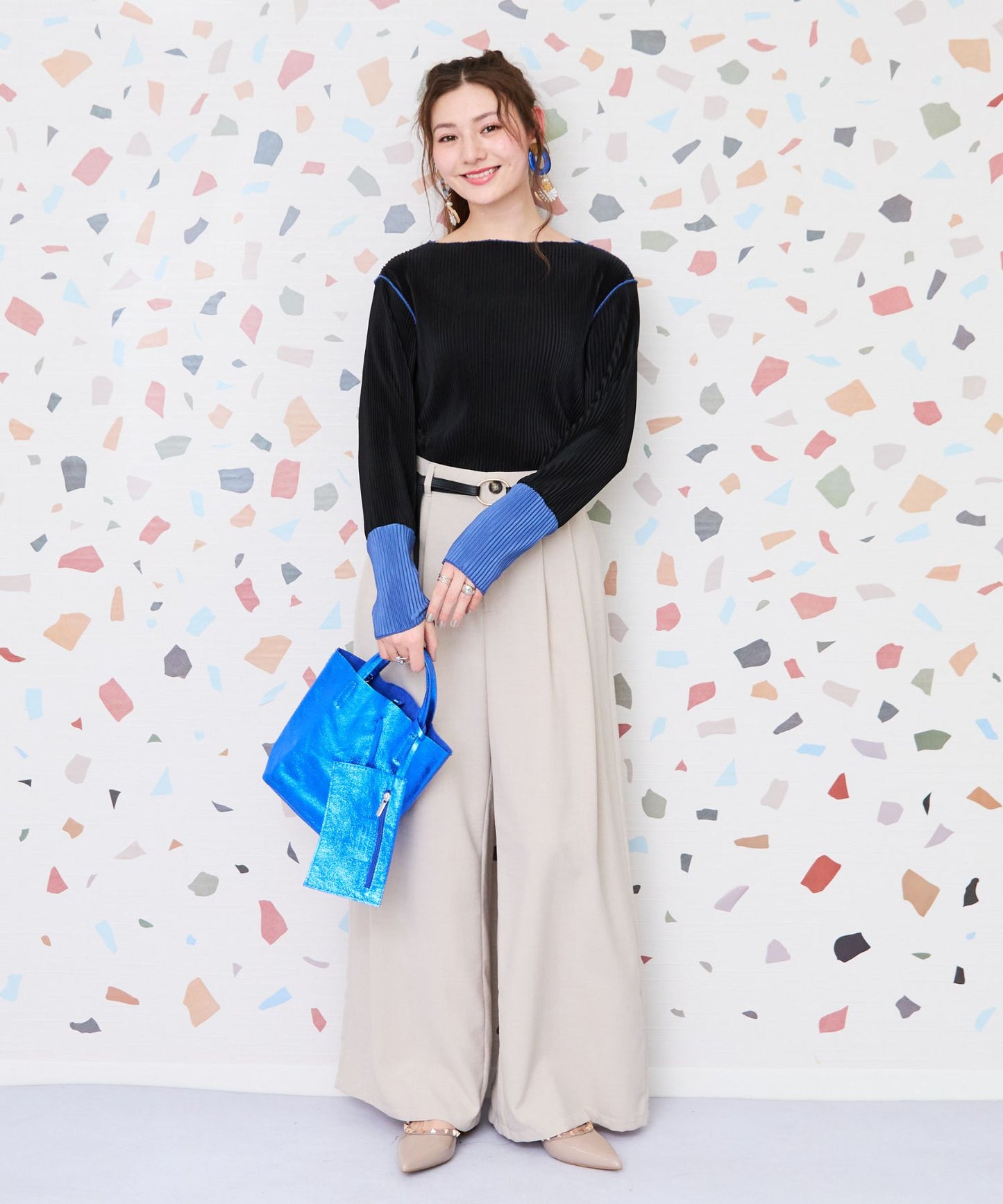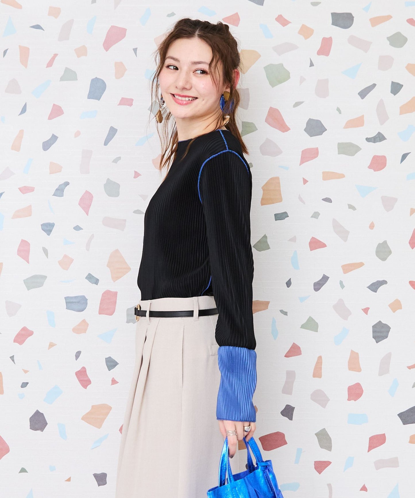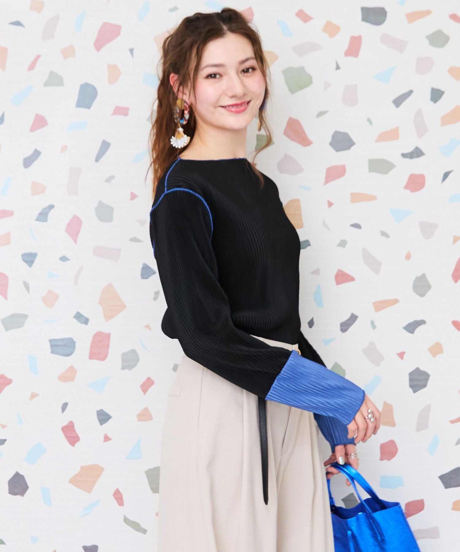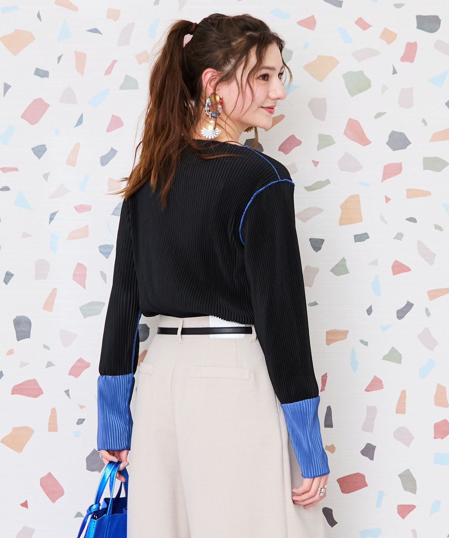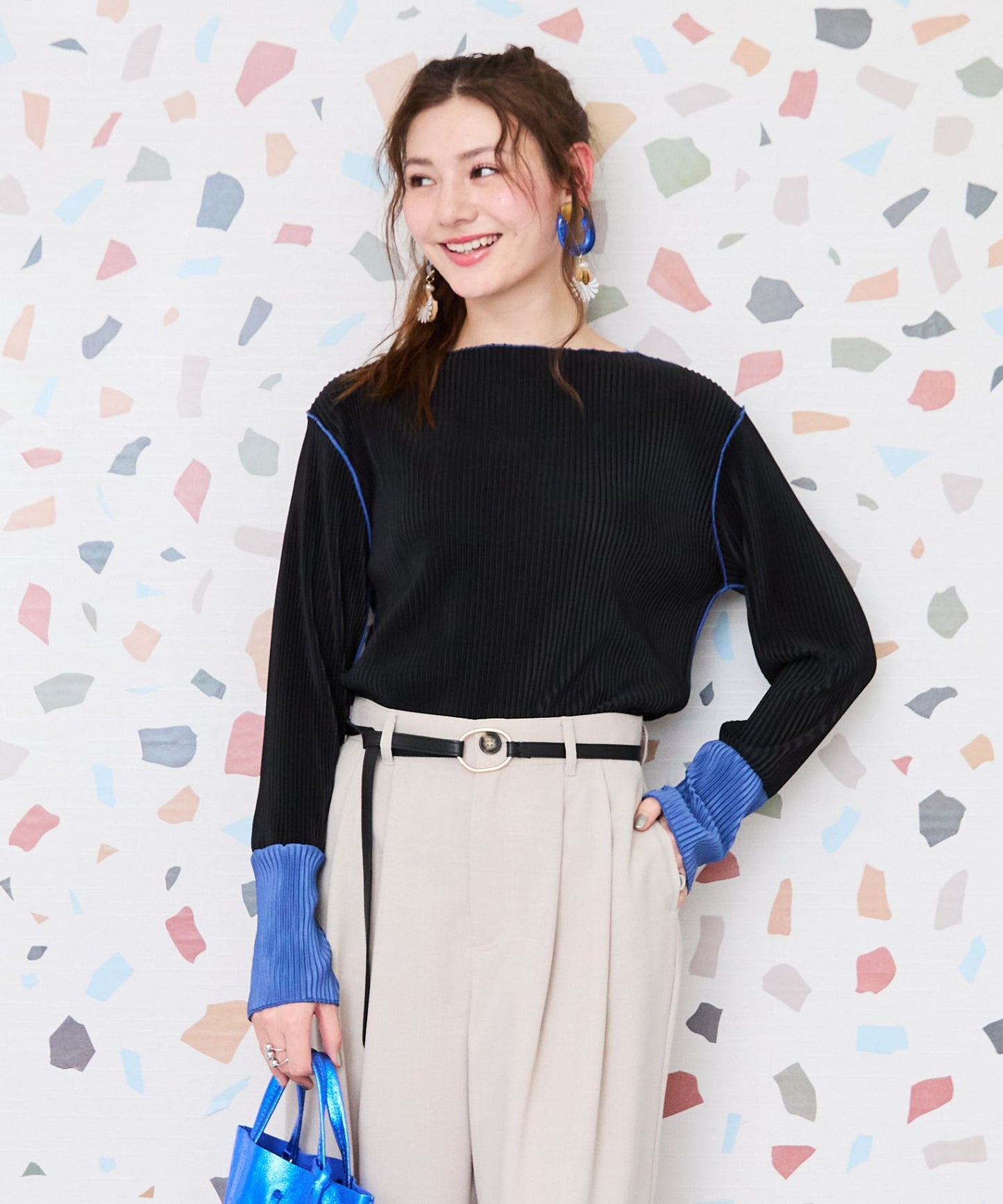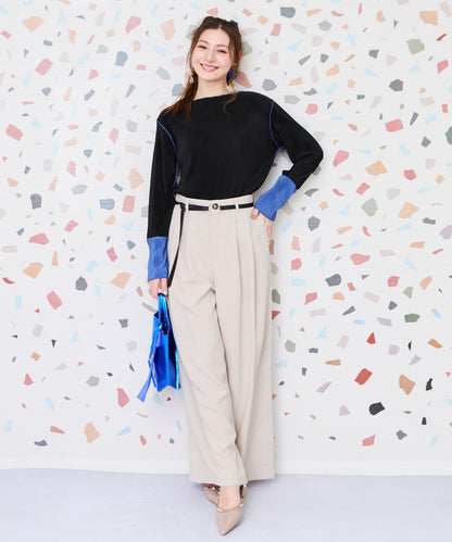 トレンド感あふれるプリーツ加工と袖の配色デザインが目を惹く、シンプルながら存在感のあるカットソー。