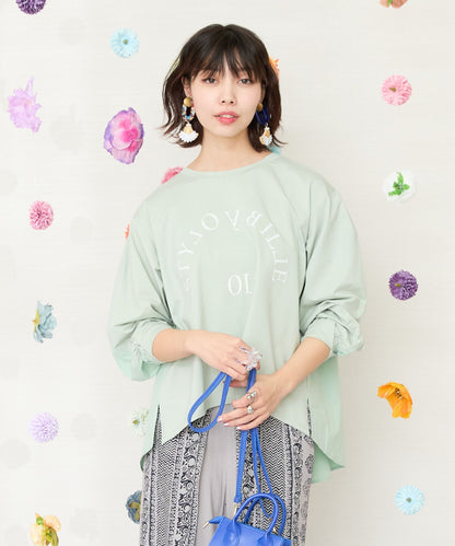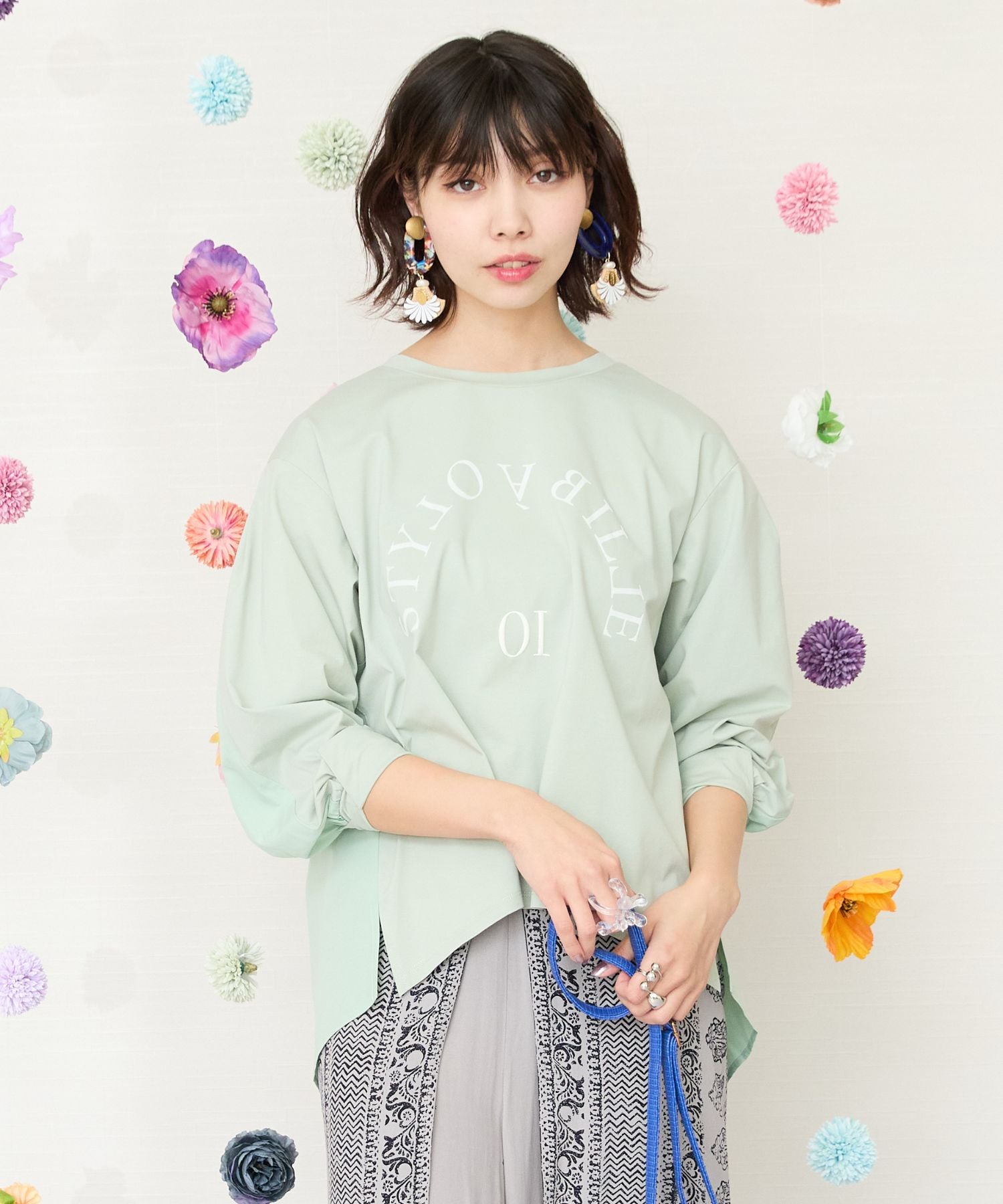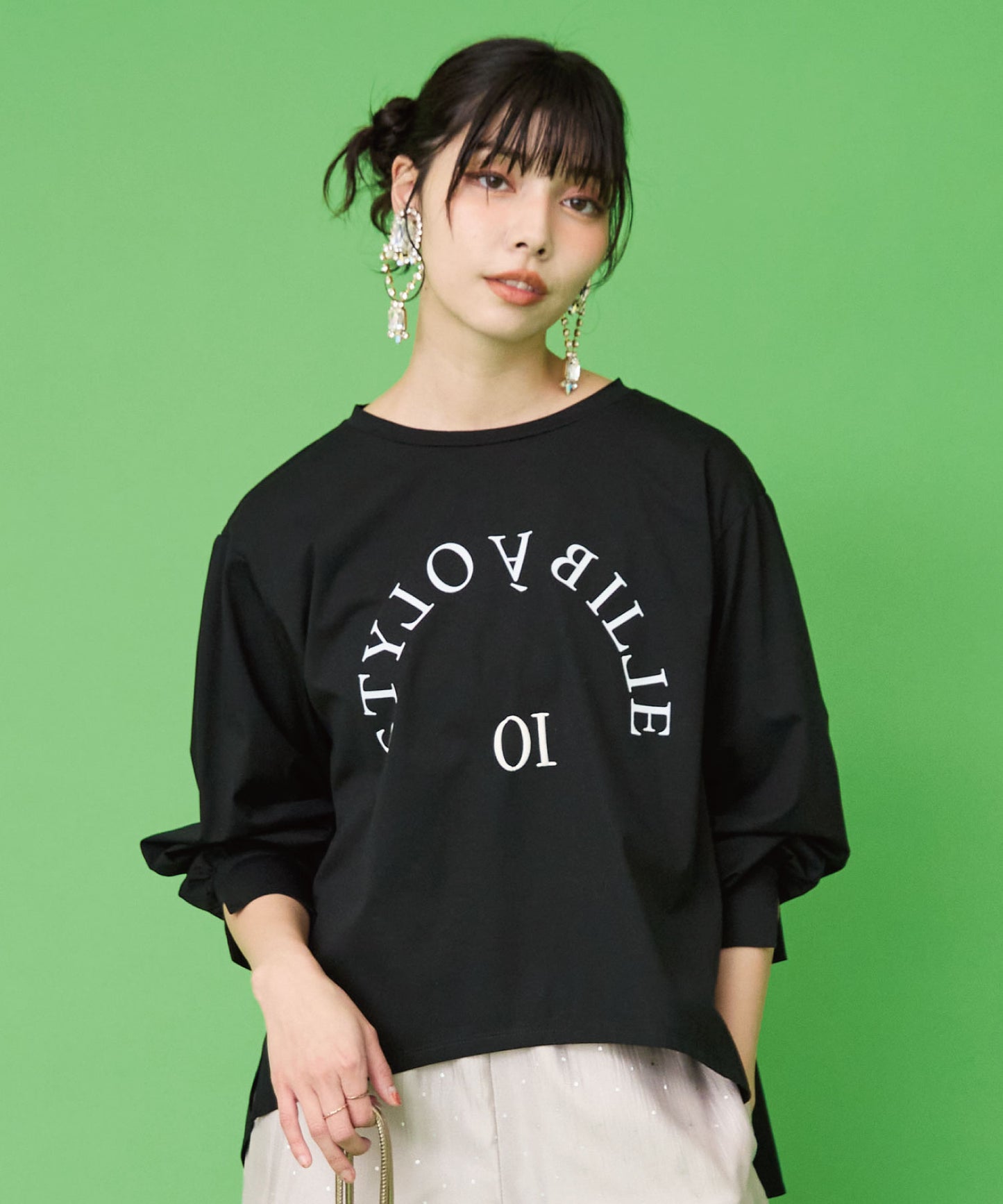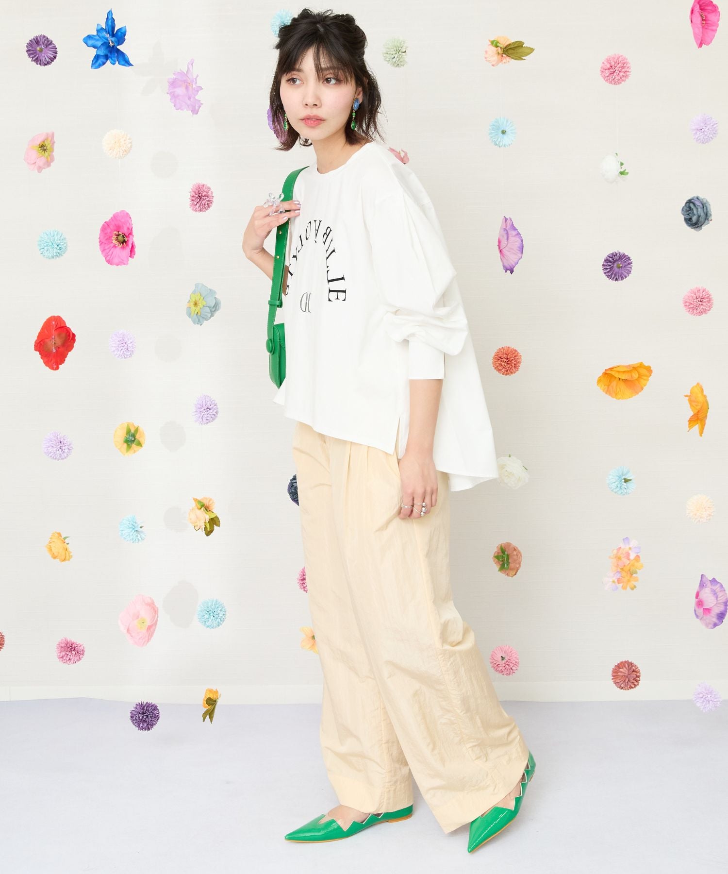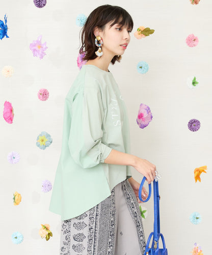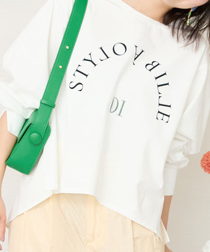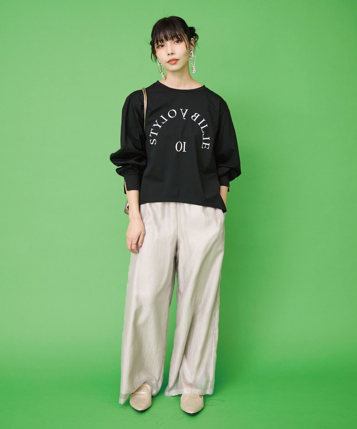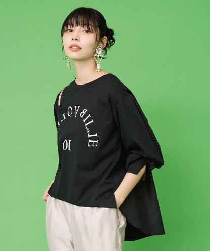 フロントにはアーチ状のタイポグラフィを配置し、ラメ発泡プリントとフロッキープリントで華やかなアクセントをプラス。