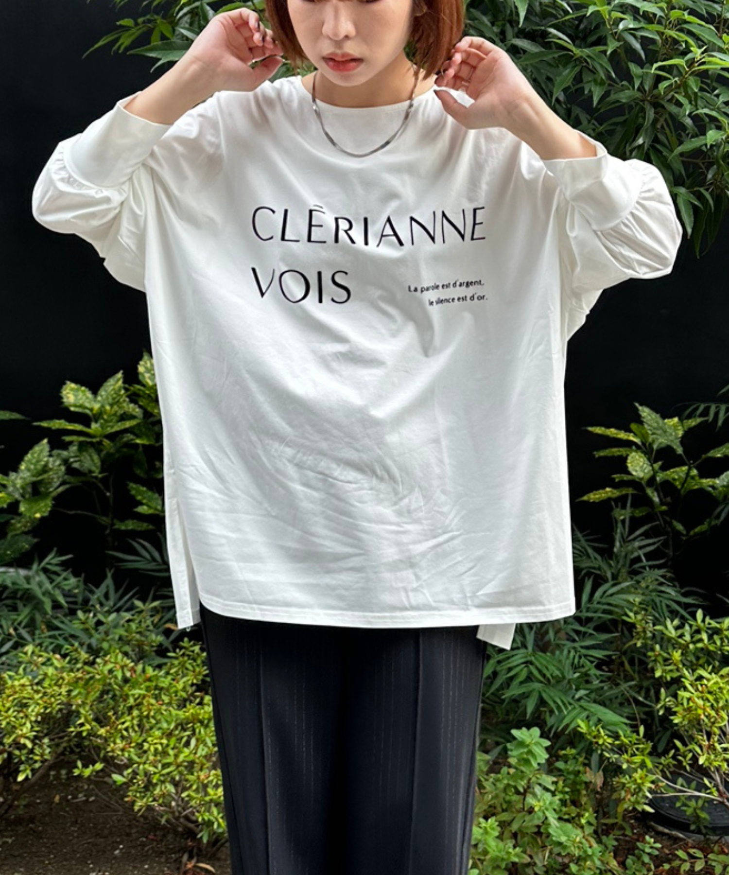 シンプルながら存在感のあるフロッキーロゴ「CLÉRIANNE VOIS」が目を引くカットソー。