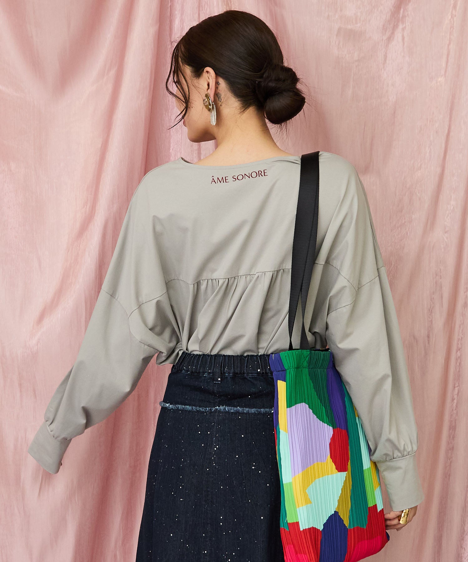 バックの切替ギャザーとたっぷりとした袖のボリューム感で、後ろ姿まで印象的に仕上がります。
