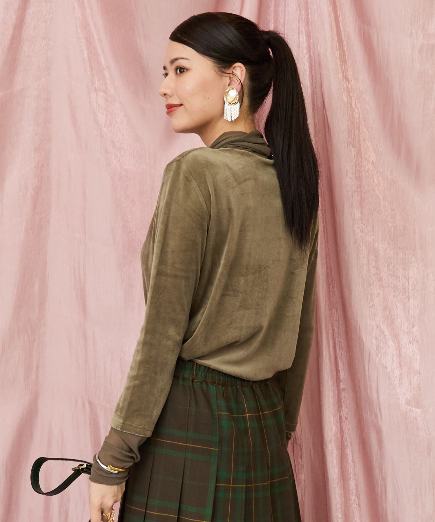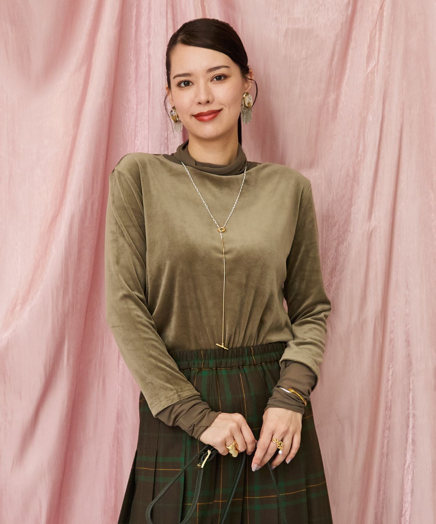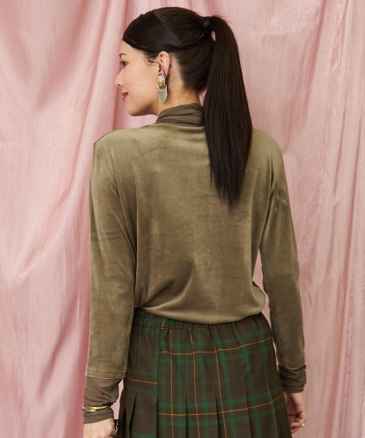 柔らかな光沢感のあるベロア素材に、ネック部分へチュールを重ねたコンビデザインが特徴のタートルネック。シンプルながらも上品な立体感があり、いつものコーデをワンランクアップさせてくれる一枚です。落ち着いた色合いで合わせやすく、秋冬のレイヤードにも活躍。