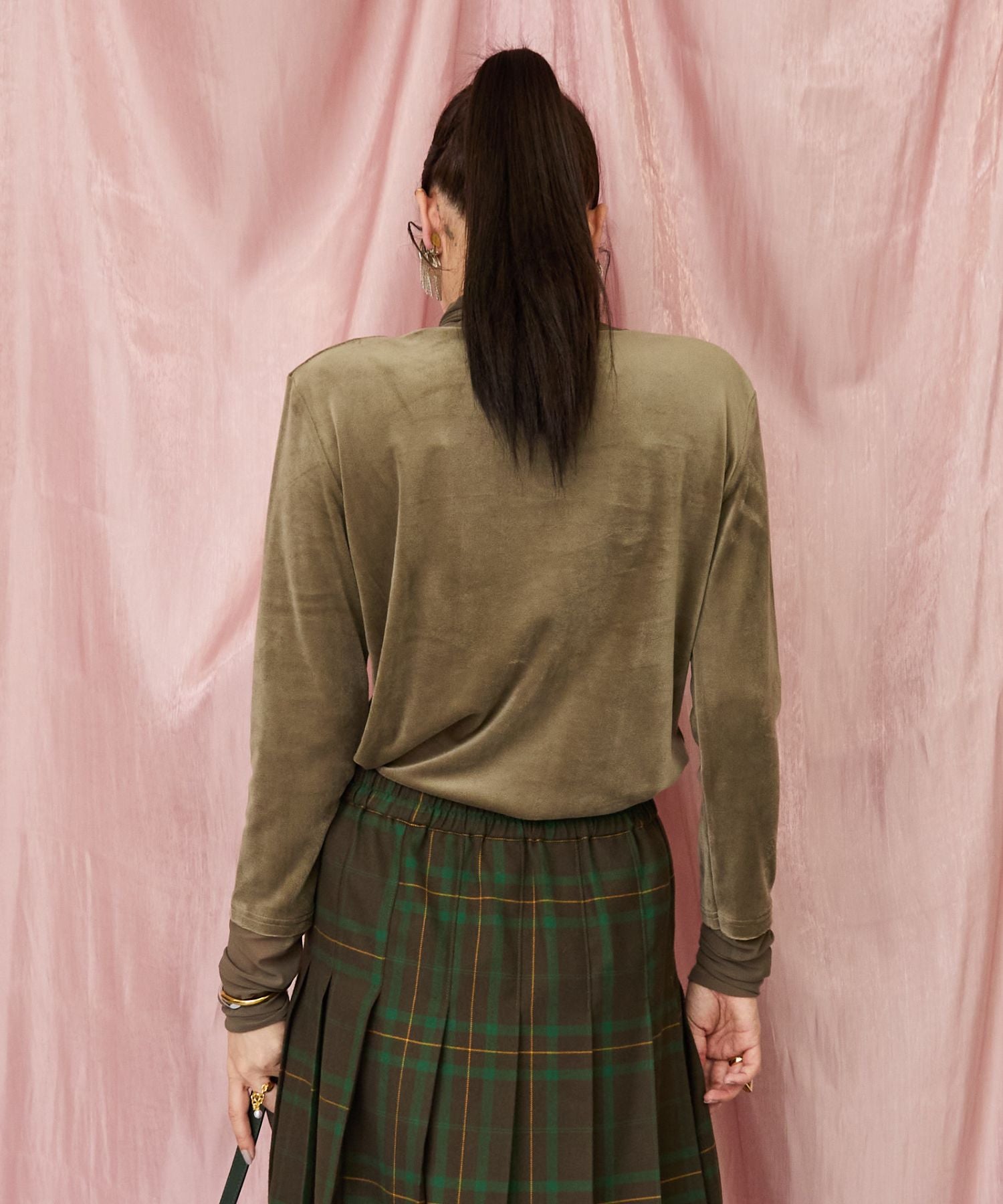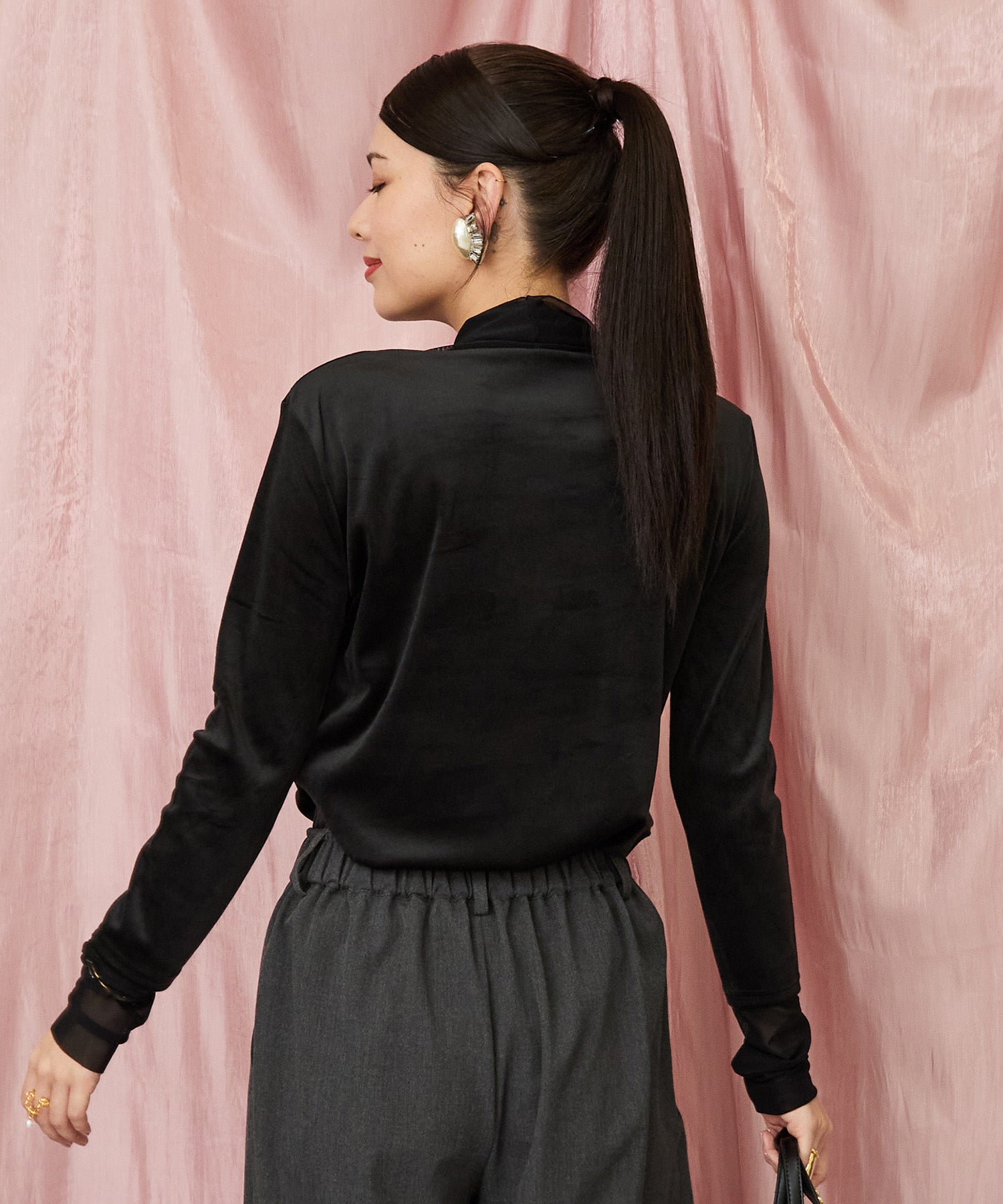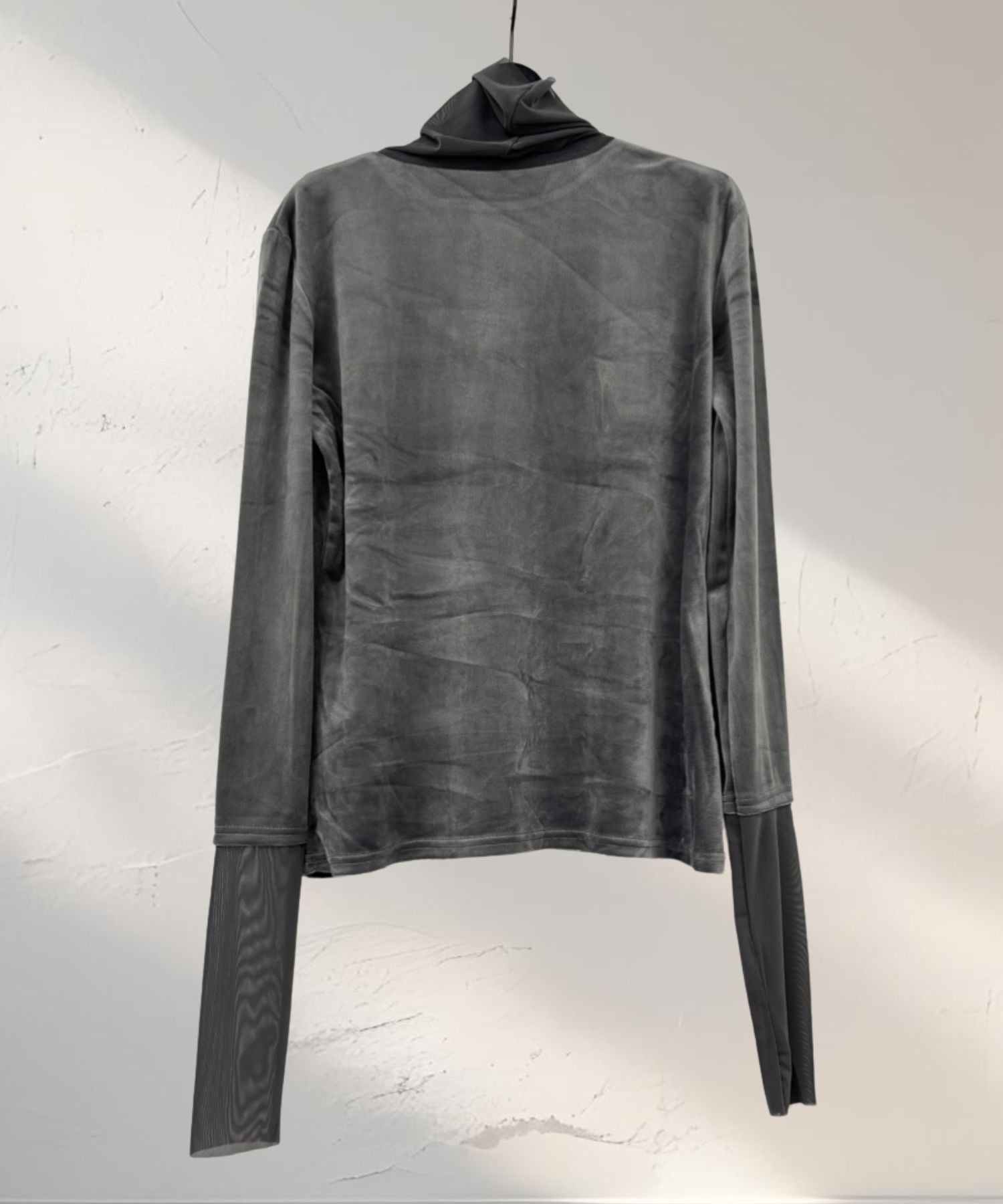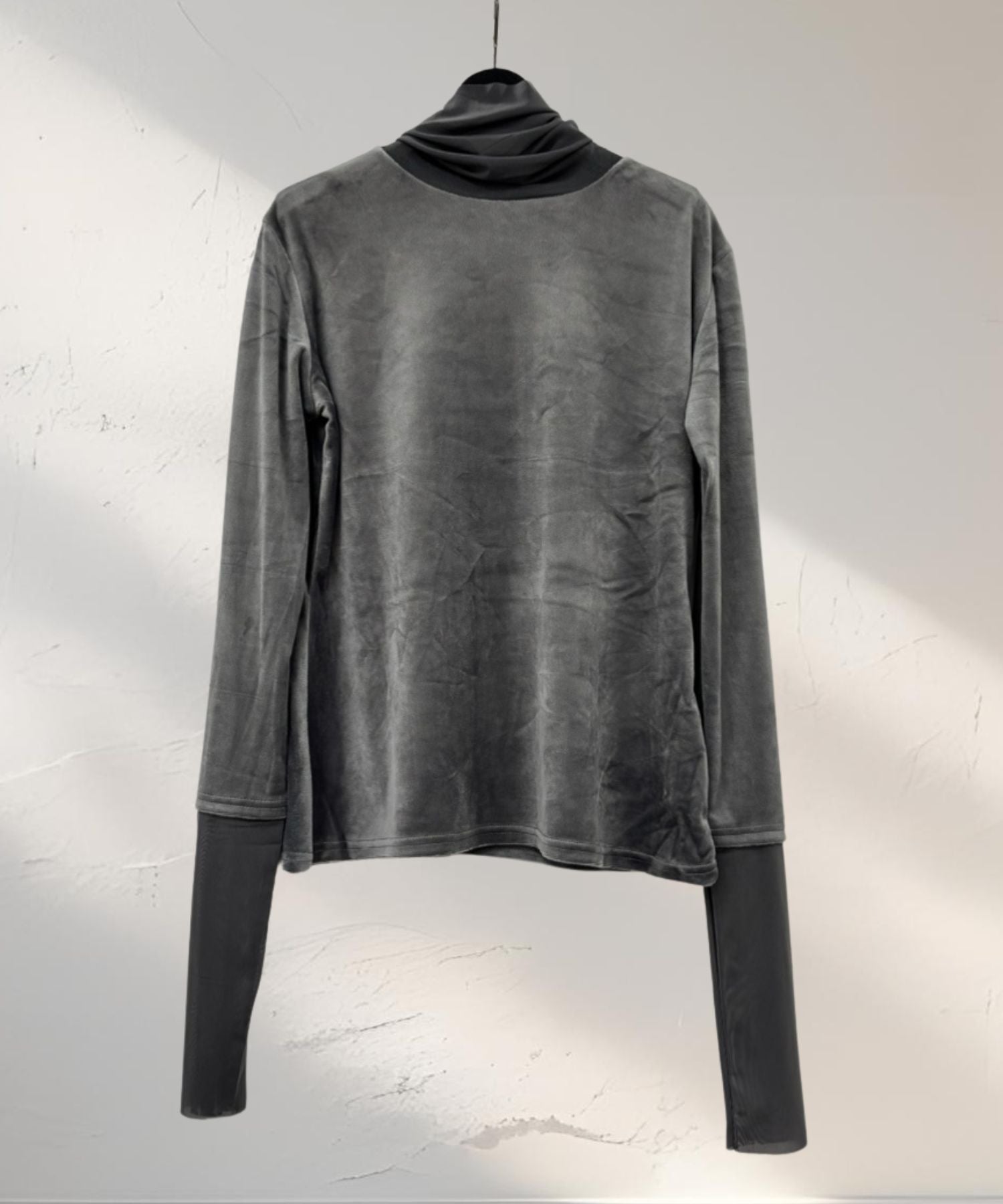 柔らかな光沢感のあるベロア素材に、ネック部分へチュールを重ねたコンビデザインが特徴のタートルネック。シンプルながらも上品な立体感があり、いつものコーデをワンランクアップさせてくれる一枚です。落ち着いた色合いで合わせやすく、秋冬のレイヤードにも活躍。