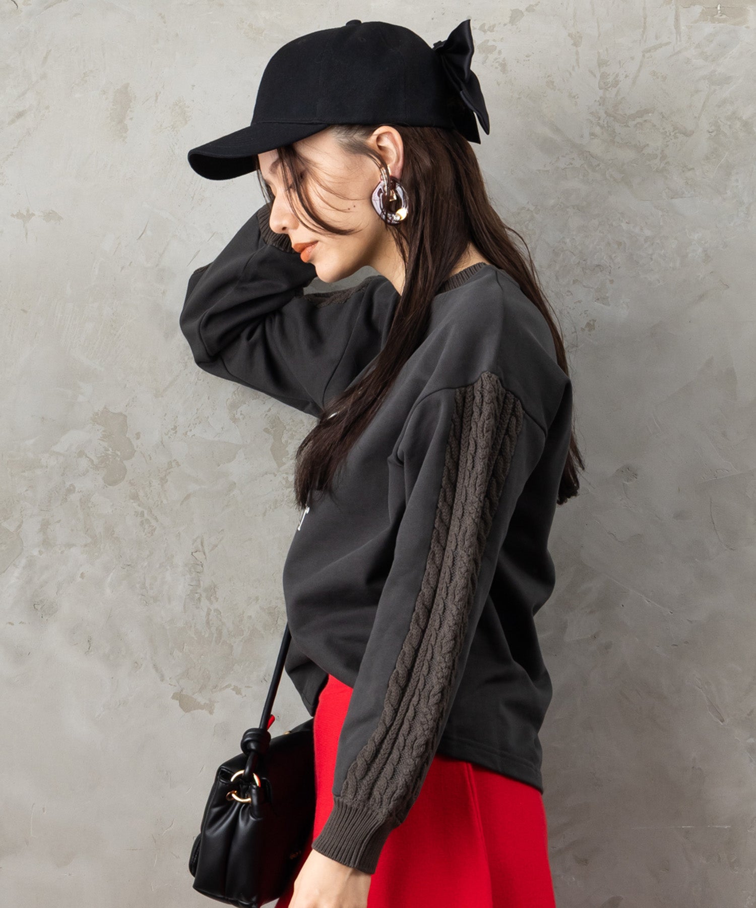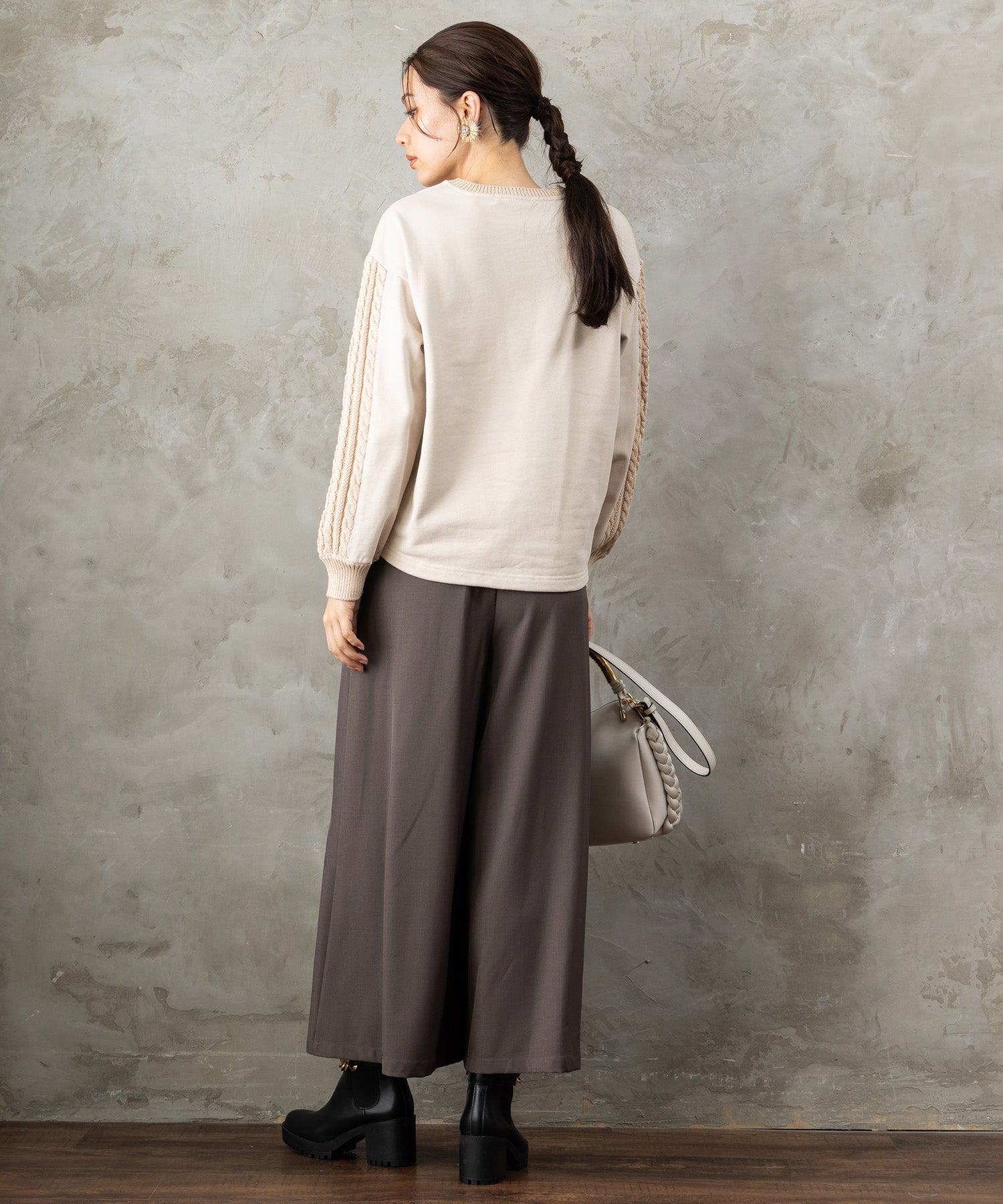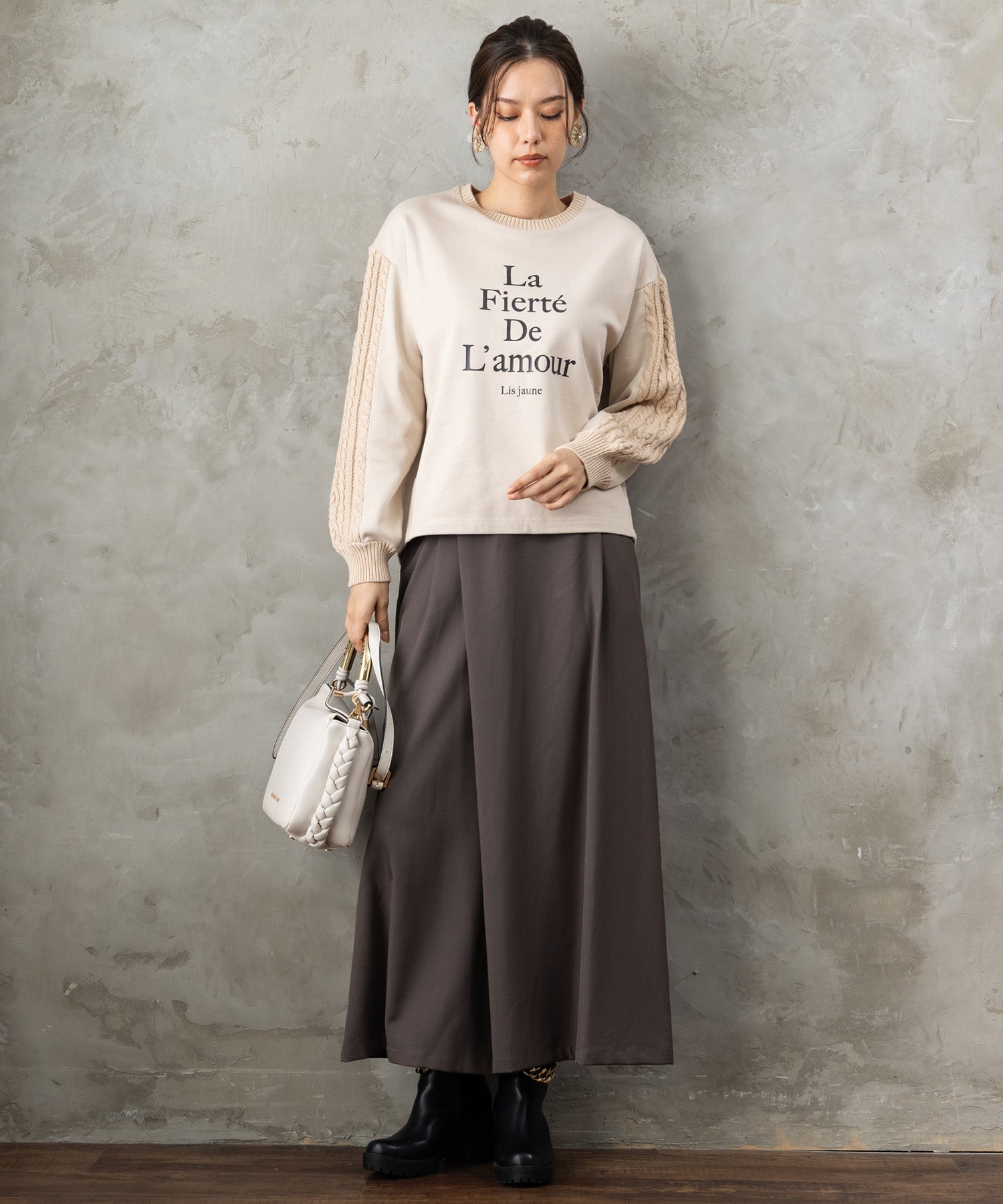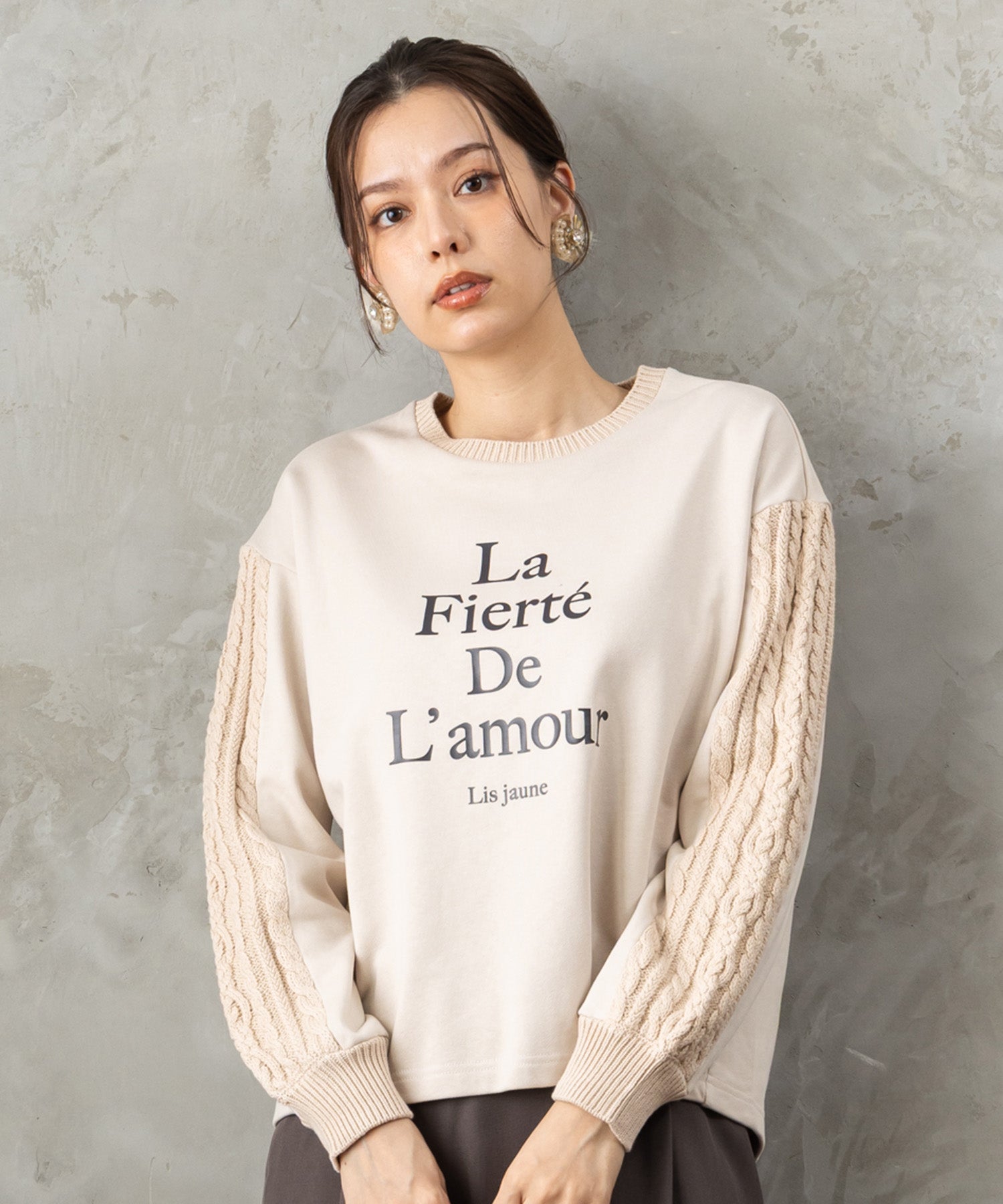 フロントに施したフレンチロゴが、シンプルながらも存在感を放つスウェット。袖や背面にさりげなくケーブル編みを組み合わせたデザインで、カジュアルな中にも女性らしい柔らかさをプラスしました。